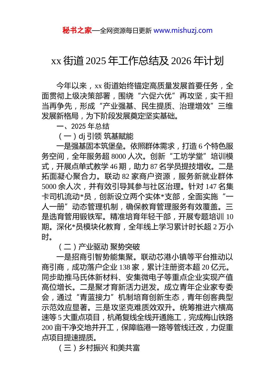 秘书之家—全网资源每日更新 www.mishuzj.comxx 街道 2025 年工作总结及 2026 年计划今年以来,xx 街道始终锚定高质量发展首要任务,全面贯彻上级决策部署,围绕“六促六优”再攻坚,实干担当再争先,形成“产业强基、民生提质、治理增效”三维发展新格局,为下阶段发展奠定坚实基础 。一、2025 年总结(一)dj 引领 筑基赋能一是 强基固本筑堡垒。依照群体需求,打造 6 个特色服务空间,全年服务超 8000 人次。创新“工坊学堂”培训模式,开展点单式教学 46 期,助力 87 名学员提技增收。二是 拓面凝心聚合力。联动 82 家商户资源,服务新就业群体5000 余人次,并有效引导其参与社区治理。针对 147 名集卡司机流动*员,创新设立两个实体*支部,全面实施“一人一册”动态管理机制,确保教育管理服务有效覆盖。三是 选育管用锻铁军。精准培育年轻干部,开展专题培训 10期。深化*员模块化教育,全年线上学习累计时长超 2 万小时。(二)产业驱动 聚势突破一是招商引智势能集聚。联动芯港小镇等平台推动以商引商,成功落户企业 138 家,累计注册资本超 20 亿元。同步助推马氏体新材料、安集微电子等重点企业实现产值高位增长。二是聚才育新活力迸发。成立青年企业家专委会,通过“青蓝接力”机制培育创新生态,青年创客典型示范效应显著。三是 攻坚克难质效双升。统筹推进六横高速等 5 大重点项目,杭甬复线全线开通施工,完成梅山铁路200 亩干净交地并开工,保障临港一路等管线迁改,力促重点项目提速提质。(三)乡村振兴 和美共富秘书之家—全网资源每日更新 www.mishuzj.com一是稳产强基农业提质。完成粮功区储备区 239 亩交地平整及高标农建设 635 亩;整治山塘 5 座、溪坑 2 条,提升农田 591 亩,村级小农水项目完工 30 个,夯实生产根基。二是清水治园美丽乡村。实施河湖动态保洁,清网行动收缴地笼 1700 顶,清理海漂垃圾 30 吨;整改田园问题 1287处,拆除乱搭建 311 处。同步打造垂钓点 27 个,实现水清景美、田园有序。两违整治方面,构建“责任闭环+综合利用+智能巡防”三机制,实现监管网络全覆盖、资源利用高效化、精准管控无死角。三是兴文兴业农旅融合。通过系列节庆、业态创新与多维传播,“xx 有花样”品牌成功举办花田音乐会等特色活动,吸引现场参与超万人次;相关宣传片线上传播超 60 万次,有效激发乡村消费活力。二、2026 年计划(一)筑牢组织根基,激发队伍新活力一是建强*群服务阵地。深化理论学习与*群服务阵地升级,通过“线上线下”双轨教学强化思想武装;优化共富工坊产训体系,探索打造山海协作示范样板。二是扩大新兴领域组织覆盖。通过行业联建、区域共建,依托产业链 dj 联盟实现*组织应建尽建;拓展新就业群体参与治理路径,培育具有产业特色的 dj 品牌。三是推进干部队伍赋能完善干部培育机制,通过一线实践、分类施训提升履职能力;加强后备力量储备与帮带历练,构建梯次化人才队伍。(二)聚焦产业跃升,锻造发展新引擎一是聚力招引落地,集聚发展动能。明确现代服务业、高新技术产业等招商方向,依托芯港小镇、协和区块及资本平台优势,开展产业链精准招商,加速产业集聚。二是深化企业联动,激发产业潜能。对接新华昌、晶创等核心企业,强化服务与产业链拓展;推动规上企业加大研发投入,以科技创新提升核心竞争力。三是夯实项目储备,把握发展机遇。牢固树立“项目为王”理念,摸排小升规及新建项目数据;跟踪力合博汇等重点项目,提供全程服务秘书之家—全网资源每日更新 www.mishuzj.com确保应统尽统、早见成效。(三)描绘共富新景,提升城乡新品质一是点上发力,打造民生样板 。以现代化美丽城镇创建为契机,启动芦江会客厅、xx 文体中心等新一轮民生工程,推进城镇有机更新。二是线上贯通,绘就乡村新卷 。以河长制为抓手,加快建设水美乡村,同时谋划芦江幸福河湖项目,开展水上文旅,持续扩大芦江河湖魅力。三是面上融合,激活文化内涵 。持续做优“xx 有花样”品牌,推动系列活动出新出彩。着力提升本土文艺水准,盘活用好现有民宿、村咖、茶吧、乡...