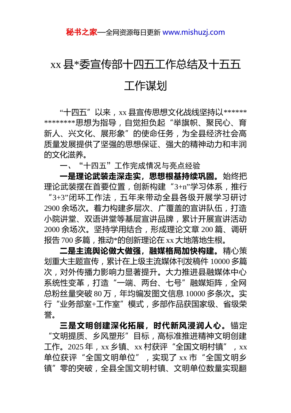 秘书之家—全网资源每日更新 www.mishuzj.comxx 县*委宣传部十四五工作总结及十五五工作谋划“十四五”以来,xx 县宣传思想文化战线坚持以**************思想为指导,自觉担负起“举旗帜、聚民心、育新人、兴文化、展形象”的使命任务,为全县经济社会高质量发展提供了坚强的思想保证、强大的精神动力和丰润的文化滋养。一、“十四五”工作完成情况与亮点经验一是理论武装走深走实,思想根基持续巩固。始终把理论武装摆在首要位置,创新构建“3+n”学习体系,推行“3+3”闭环工作法,五年来带动全县各级开展学习研讨2900 余场次。着力构建多层次、广覆盖的宣讲队伍,打造小院讲堂、双语讲堂等基层宣讲品牌,累计开展宣讲活动2000 余场次。坚持学用结合,形成理论文章 200 篇、调研报告 700 多篇,推动*的创新理论在 xx 大地落地生根。二是主流舆论做大做强,融媒格局加快构建。精心策划重大主题宣传,累计在上级主流媒体刊发稿件 10000 多篇次,对外传播力影响力显著提升。大力推进县融媒体中心系统性变革,打造“一端、两台、七号”融媒矩阵,全网总粉丝量突破 80 万,年均编发图文信息 10000 多条次。实行“业务部室+工作室”模式,多部作品获国家级、省级荣誉。三是文明创建深化拓展,时代新风浸润人心。锚定“文明提质、乡风塑形”目标,高标准推进精神文明创建工作。2025 年,xx 乡镇、xx 村获评“全国文明村镇”,xx单位获评“全国文明单位”,实现了 xx 市“全国文明乡镇”零的突破,全县全国文明村镇、文明单位数量实现翻秘书之家—全网资源每日更新 www.mishuzj.com番,文明新风深入人心。四是数字赋能精准高效,宣传阵地延伸基层。积极拥抱数字时代,完成投资 1000 多万元的数字乡村智能“云广播”系统建设,建成县、乡两级播控平台 23 个和村屯广播插播点 1500 个,实现县、乡、村、屯全覆盖,有效打通信息传播“最后一公里”,相关经验入选全国典型案例。二、“十五五”工作思路与谋划“十五五”时期是 xx 县乘势而上、加快发展的关键阶段。宣传部将坚持以***文化思想为引领,围绕中心、服务大局,奋力开创宣传思想文化工作新局面。工作思路:紧扣学习贯彻**************思想主题主线,聚焦用*的创新理论武装全*、教育人民这一首要政治任务,着力建设具有强大凝聚力和引领力的社会主义意识形态,着力培育和践行社会主义核心价值观,着力提升新闻舆论传播力引导力影响力公信力,着力推动文化事业和文化产业繁荣发展,为谱写中国式现代化 xx 新篇章提供坚强思想保证和强大精神力量。目标任务:到 2030 年,理论武装的普及率和转化率显著提升;主流舆论的覆盖面和引导力全面增强;全域文明创建实现新突破,人民精神风貌更加昂扬;数字文化服务体系更加完善,媒体深度融合发展迈上新台阶;文化软实力和影响力大幅提升。重点工作:一是实施*的创新理论传播深化工程。健全分众化、对象化宣讲体系,打造“云端”理论宣讲平台,推动理论学习从“面对面”向“键对键”拓展。二是实施主流舆论阵地提质工程。深化融媒体中心改革,推动内容生产供给侧结构性改革,力争融媒矩阵粉丝量突破 100 万,讲好 xx 故事。三是实施精神文明全域创建工程。推进新时代文明实践中心(所、站)提质扩面,常态化开展先进典型选树宣传,力争在国家级文明创建荣誉上取得新突破。四是实施数字文化融合发展工程。升级“云广播”系统,整合秘书之家—全网资源每日更新 www.mishuzj.com应急、政务、文旅等服务功能,打造“智慧宣传”综合平台,赋能乡村全面振兴。五是实施文化事业产业繁荣工程深度挖掘 xx 地域文化资源,创作一批文艺精品,培育新型文化业态,推动文化资源优势转化为发展优势。