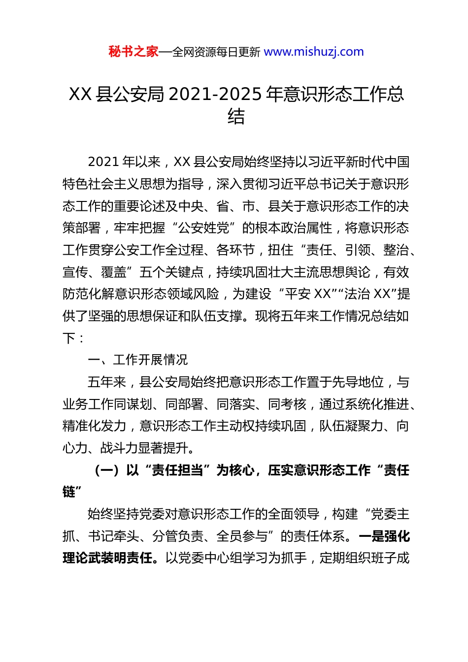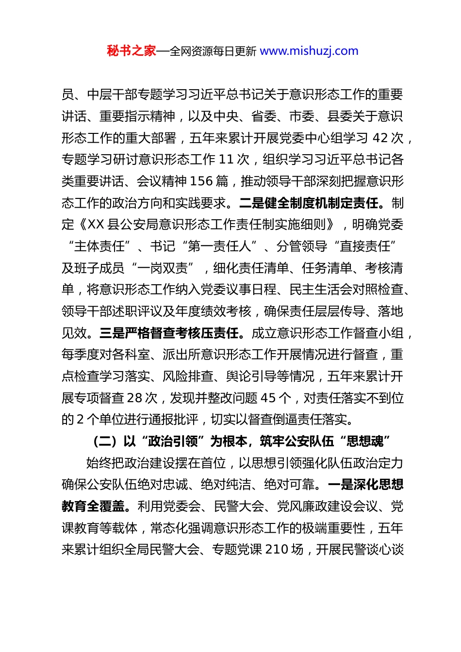 秘书之家—全网资源每日更新 www.mishuzj.comXX 县公安局 2021-2025 年意识形态工作总结2021 年以来,XX 县公安局始终坚持以习近平新时代中国特色社会主义思想为指导,深入贯彻习近平总书记关于意识形态工作的重要论述及中央、省、市、县关于意识形态工作的决策部署,牢牢把握“公安姓党”的根本政治属性,将意识形态工作贯穿公安工作全过程、各环节,扭住“责任、引领、整治、宣传、覆盖”五个关键点,持续巩固壮大主流思想舆论,有效防范化解意识形态领域风险,为建设“平安 XX”“法治 XX”提供了坚强的思想保证和队伍支撑。现将五年来工作情况总结如下:一、工作开展情况五年来,县公安局始终把意识形态工作置于先导地位,与业务工作同谋划、同部署、同落实、同考核,通过系统化推进、精准化发力,意识形态工作主动权持续巩固,队伍凝聚力、向心力、战斗力显著提升。(一)以“责任担当”为核心,压实意识形态工作“责任链”始终坚持党委对意识形态工作的全面领导,构建“党委主抓、书记牵头、分管负责、全员参与”的责任体系。一是强化理论武装明责任。以党委中心组学习为抓手,定期组织班子成秘书之家—全网资源每日更新 www.mishuzj.com员、中层干部专题学习习近平总书记关于意识形态工作的重要讲话、重要指示精神,以及中央、省委、市委、县委关于意识形态工作的重大部署,五年来累计开展党委中心组学习 42 次,专题学习研讨意识形态工作 11 次,组织学习习近平总书记各类重要讲话、会议精神 156 篇,推动领导干部深刻把握意识形态工作的政治方向和实践要求。二是健全制度机制定责任。制定《XX 县公安局意识形态工作责任制实施细则》,明确党委“主体责任”、书记“第一责任人”、分管领导“直接责任”及班子成员“一岗双责”,细化责任清单、任务清单、考核清单,将意识形态工作纳入党委议事日程、民主生活会对照检查、领导干部述职评议及年度绩效考核,确保责任层层传导、落地见效。三是严格督查考核压责任。成立意识形态工作督查小组,每季度对各科室、派出所意识形态工作开展情况进行督查,重点检查学习落实、风险排查、舆论引导等情况,五年来累计开展专项督查 28 次,发现并整改问题 45 个,对责任落实不到位的 2 个单位进行通报批评,切实以督查倒逼责任落实。(二)以“政治引领”为根本,筑牢公安队伍“思想魂”始终把政治建设摆在首位,以思想引领强化队伍政治定力确保公安队伍绝对忠诚、绝对纯洁、绝对可靠。一是深化思想教育全覆盖。利用党委会、民警大会、党风廉政建设会议、党课教育等载体,常态化强调意识形态工作的极端重要性,五年来累计组织全局民警大会、专题党课 210 场,开展民警谈心谈秘书之家—全网资源每日更新 www.mishuzj.com话 1600 余人次,覆盖民警、辅警 3200 余人次,推动意识形态教育入脑入心。二是抓实“学习强国”提效能。将“学习强国”学习与民警个人考评、支部评优挂钩,实行“每日通报、每周排名、每月总结”机制,督促党员民辅警主动学习,全局党员“学习强国”日均积分保持在 45 分以上,参与率始终稳定在 98%以上,五年来累计产生“学习标兵”120 余人次,形成比学赶超的良好氛围。三是融入培训练兵强能力。将意识形态工作纳入民警初任培训、晋升培训、“百日大练兵”等重点内容,结合公安工作实际开展意识形态领域风险识别、舆情处置等专题教学,五年来累计开展各类培训、练兵活动 68 次,覆盖民警、辅警 2800 余人次,有效提升了队伍应对意识形态领域问题的能力。(三)以“扫黄打非”为抓手,净化社会文化“大环境”始终把“扫黄打非”作为维护意识形态安全的重要举措,聚焦突出问题,强化专项整治,持续净化社会文化环境。一是统筹部署强合力。成立“扫黄打非”工作领导小组,制定年度专项行动方案,抽调治安、政保、网安、反恐怖和特巡警大队及各派出所力量组建专项打击组,五年来累计开展“扫黄打非”专项行动 36 次,形成“统一指挥、分工协作、上下联动”的打击格局。二是部门联动破难点。加强与县文化体育旅游局、教育局、市场监督管理局等部门的协同配合,建立线索共享、联合...