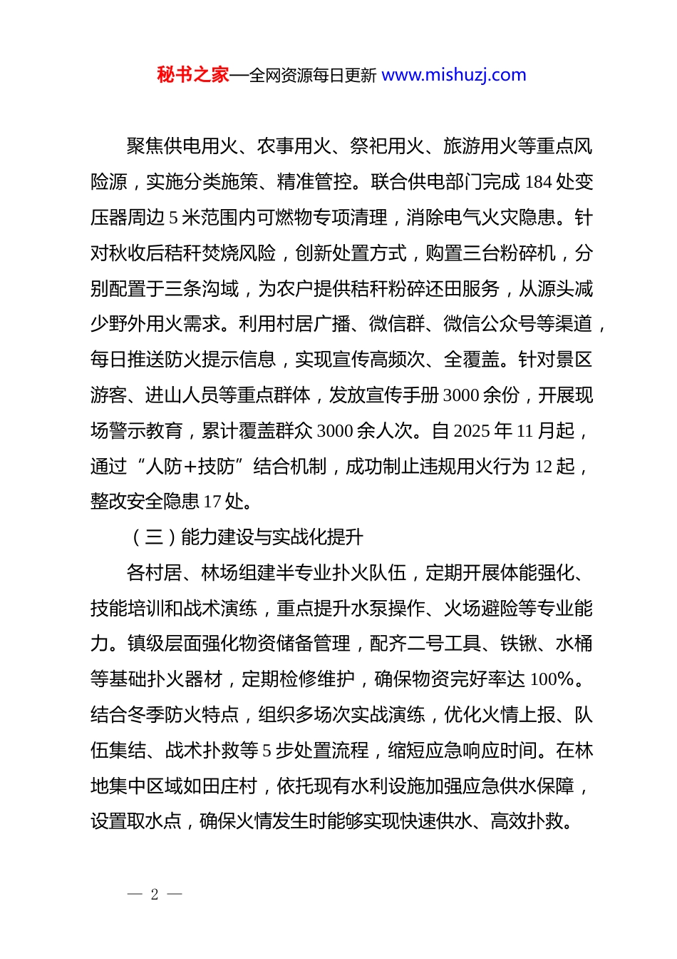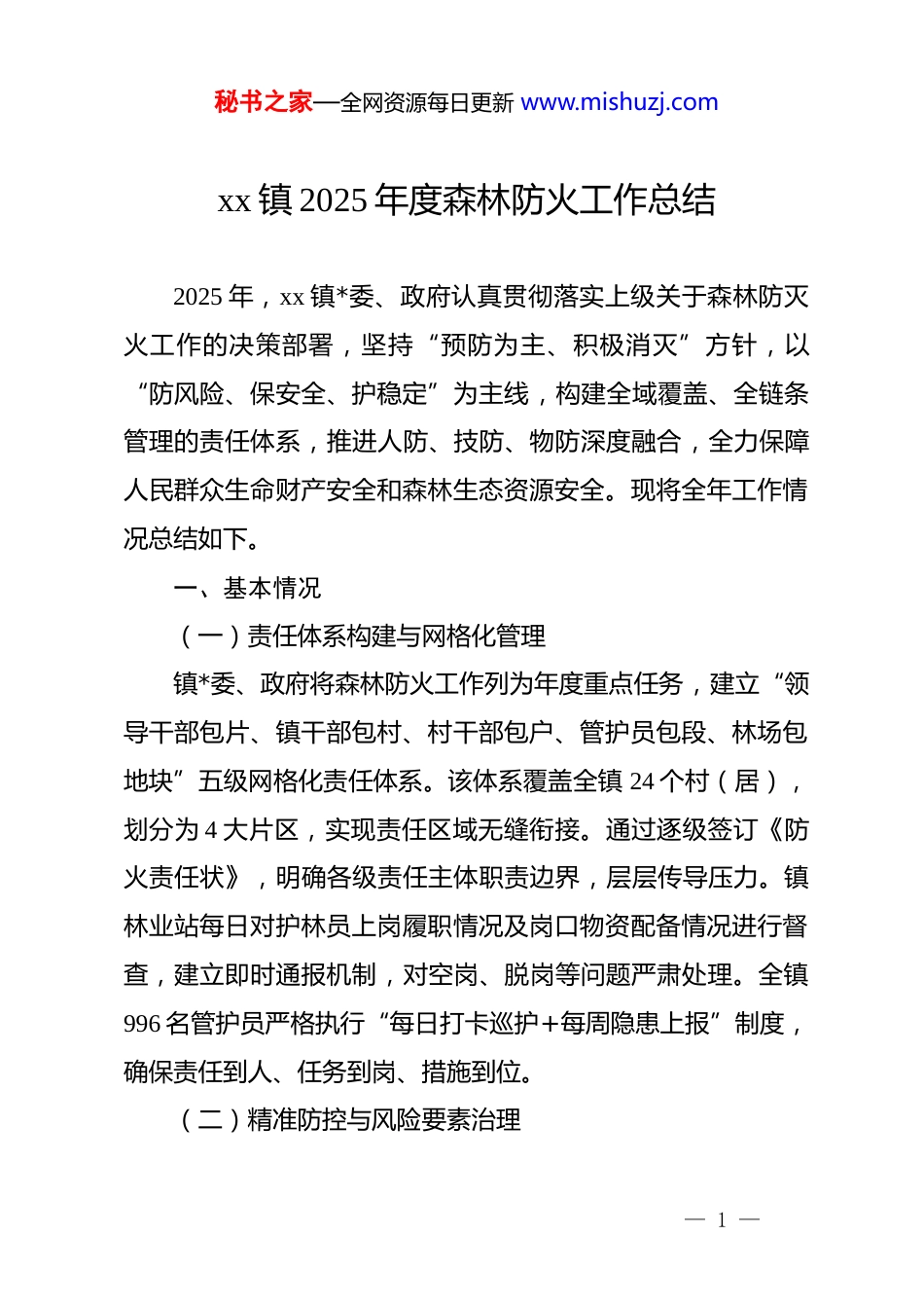 秘书之家—全网资源每日更新 www.mishuzj.comxx 镇 2025 年度森林防火工作总结2025 年,xx 镇*委、政府认真贯彻落实上级关于森林防灭火工作的决策部署,坚持“预防为主、积极消灭”方针,以“防风险、保安全、护稳定”为主线,构建全域覆盖、全链条管理的责任体系,推进人防、技防、物防深度融合,全力保障人民群众生命财产安全和森林生态资源安全。现将全年工作情况总结如下。一、基本情况(一)责任体系构建与网格化管理镇*委、政府将森林防火工作列为年度重点任务,建立“领导干部包片、镇干部包村、村干部包户、管护员包段、林场包地块”五级网格化责任体系。该体系覆盖全镇 24 个村(居),划分为 4 大片区,实现责任区域无缝衔接。通过逐级签订《防火责任状》,明确各级责任主体职责边界,层层传导压力。镇林业站每日对护林员上岗履职情况及岗口物资配备情况进行督查,建立即时通报机制,对空岗、脱岗等问题严肃处理。全镇996 名管护员严格执行“每日打卡巡护+每周隐患上报”制度,确保责任到人、任务到岗、措施到位。(二)精准防控与风险要素治理— 1 —秘书之家—全网资源每日更新 www.mishuzj.com聚焦供电用火、农事用火、祭祀用火、旅游用火等重点风险源,实施分类施策、精准管控。联合供电部门完成 184 处变压器周边 5 米范围内可燃物专项清理,消除电气火灾隐患。针对秋收后秸秆焚烧风险,创新处置方式,购置三台粉碎机,分别配置于三条沟域,为农户提供秸秆粉碎还田服务,从源头减少野外用火需求。利用村居广播、微信群、微信公众号等渠道,每日推送防火提示信息,实现宣传高频次、全覆盖。针对景区游客、进山人员等重点群体,发放宣传手册 3000 余份,开展现场警示教育,累计覆盖群众 3000 余人次。自 2025 年 11 月起,通过“人防+技防”结合机制,成功制止违规用火行为 12 起,整改安全隐患 17 处。(三)能力建设与实战化提升各村居、林场组建半专业扑火队伍,定期开展体能强化、技能培训和战术演练,重点提升水泵操作、火场避险等专业能力。镇级层面强化物资储备管理,配齐二号工具、铁锹、水桶等基础扑火器材,定期检修维护,确保物资完好率达 100%。结合冬季防火特点,组织多场次实战演练,优化火情上报、队伍集结、战术扑救等 5 步处置流程,缩短应急响应时间。在林地集中区域如田庄村,依托现有水利设施加强应急供水保障,设置取水点,确保火情发生时能够实现快速供水、高效扑救。— 2 —秘书之家—全网资源每日更新 www.mishuzj.com(四)队伍组织与人员配置全镇整合形成 925 名护林员定点看守、8 个视频监控系统实时监控、24 个半专业灭火队时时备勤的立体防控格局。镇、村两级半专业扑火队伍规模达 300 余人,实行 24 小时值班备勤制度。910 名护林人员与 24 个村(居)两委干部协同作战,对重点林区、进山路口、坟头墓地等关键点位实施严看死守。社区微型消防站配备消防柜、推车式灭火器、干粉灭火器、消防水带、消防水枪、消防钩、消防斧等专业器材,构建“5 分钟响应圈”。护林员队伍实施定人、定岗、定责管理,在 20 条主要沟口设置检查登记点,做到路口有登记、点位有看守、区域有巡护。(五)物资储备与装备保障镇森林防火指挥中心储备风力灭火机、灭火水枪、电动灭火水枪、2 号工具、3 号工具、扑火服、照明头盔、割灌机、油锯等常规装备。2025 年度投入 70 万元用于防火装备更新换代,重点采购防火服、防火靴、防火头盔、消防水泵、无人机、移动式灭火车等新型装备。所有装备实行登记造册、定点存放、专人维护,建立日检查、周保养、月测试机制,确保随时处于良好战备状态。护林员个人防护装备配备率达 100%,每人配置防护头盔、防护眼镜、防火布面罩、防静电服装、防水靴、— 3 —秘书之家—全网资源每日更新 www.mishuzj.com橡胶手套等基本防护物资。(六)监测预警与技防手段构建“空天地”一体化监测体系。空中层面,探索无人机巡航监测,利用无人机飞控系统和红外热成像技术开展火源巡检。地面层面,8 个高清视频监控系统对重点林区实施 24 小时不间断监控,实现火情早期识...