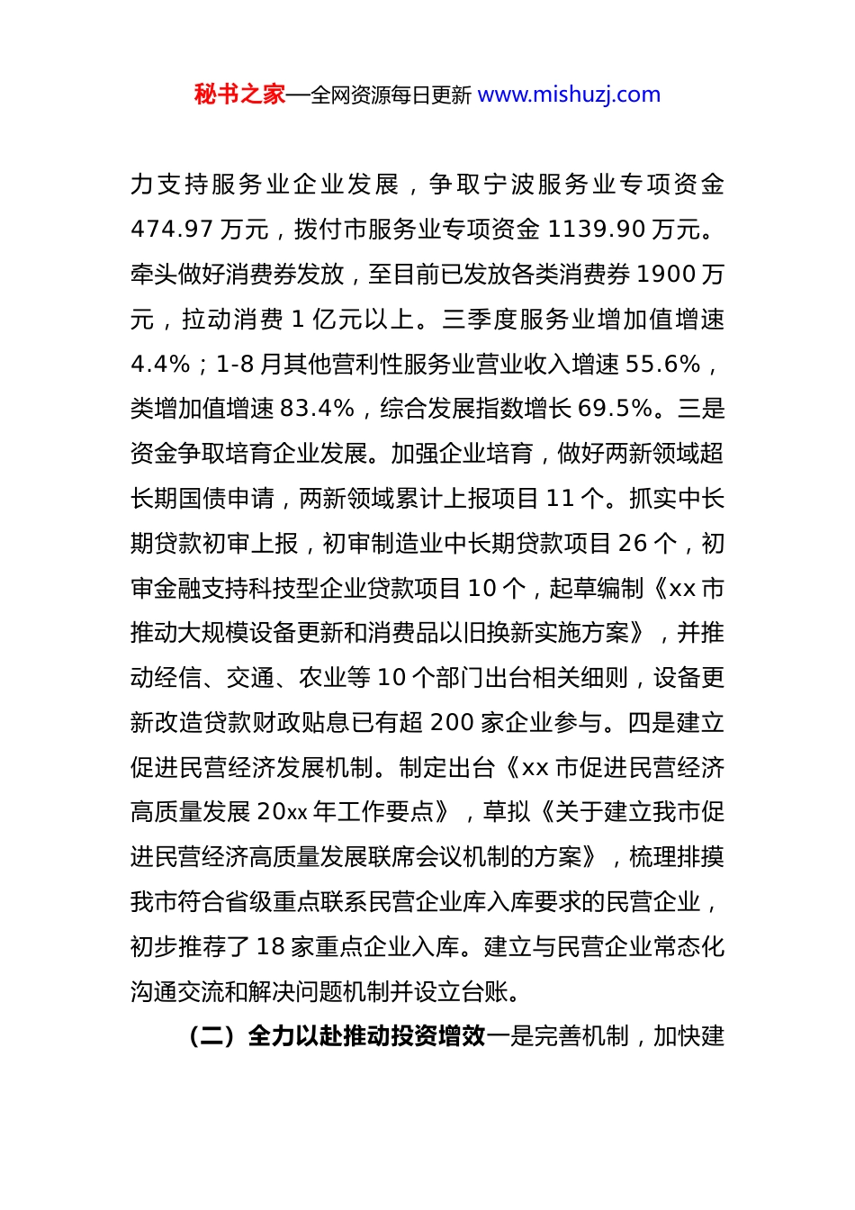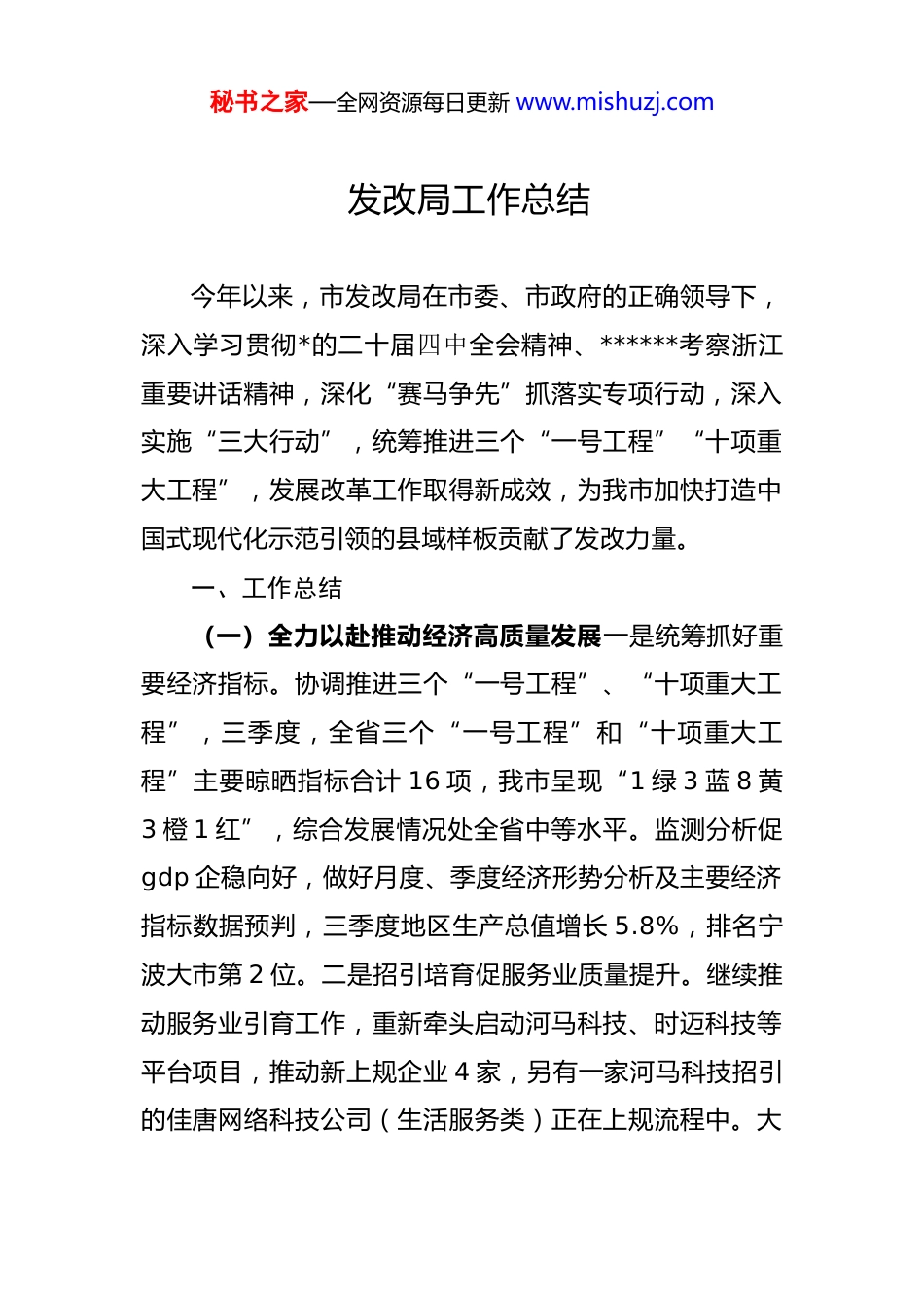 秘书之家—全网资源每日更新 www.mishuzj.com 发改局工作总结今年以来,市发改局在市委、市政府的正确领导下,深入学习贯彻*的二十届四中全会精神、******考察浙江重要讲话精神,深化“赛马争先”抓落实专项行动,深入实施“三大行动”,统筹推进三个“一号工程”“十项重大工程”,发展改革工作取得新成效,为我市加快打造中国式现代化示范引领的县域样板贡献了发改力量。一、工作总结(一)全力以赴推动经济高质量发展一是统筹抓好重要经济指标。协调推进三个“一号工程”、“十项重大工程”,三季度,全省三个“一号工程”和“十项重大工程”主要晾晒指标合计 16 项,我市呈现“1 绿 3 蓝 8 黄3 橙 1 红”,综合发展情况处全省中等水平。监测分析促gdp 企稳向好,做好月度、季度经济形势分析及主要经济指标数据预判,三季度地区生产总值增长 5.8%,排名宁波大市第 2 位。二是招引培育促服务业质量提升。继续推动服务业引育工作,重新牵头启动河马科技、时迈科技等平台项目,推动新上规企业 4 家,另有一家河马科技招引的佳唐网络科技公司(生活服务类)正在上规流程中。大秘书之家—全网资源每日更新 www.mishuzj.com力 支 持 服 务 业 企 业 发 展 , 争 取 宁 波 服 务 业 专 项 资 金474.97 万元,拨付市服务业专项资金 1139.90 万元。牵头做好消费券发放,至目前已发放各类消费券 1900 万元,拉动消费 1 亿元以上。三季度服务业增加值增速4.4%;1-8 月其他营利性服务业营业收入增速 55.6%,类增加值增速 83.4%,综合发展指数增长 69.5%。三是资金争取培育企业发展。加强企业培育,做好两新领域超长期国债申请,两新领域累计上报项目 11 个。抓实中长期贷款初审上报,初审制造业中长期贷款项目 26 个,初审金融支持科技型企业贷款项目 10 个,起草编制《xx 市推动大规模设备更新和消费品以旧换新实施方案》,并推动经信、交通、农业等 10 个部门出台相关细则,设备更新改造贷款财政贴息已有超 200 家企业参与。四是建立促进民营经济发展机制。制定出台《xx 市促进民营经济高质量发展 20xx 年工作要点》,草拟《关于建立我市促进民营经济高质量发展联席会议机制的方案》,梳理排摸我市符合省级重点联系民营企业库入库要求的民营企业,初步推荐了 18 家重点企业入库。建立与民营企业常态化沟通交流和解决问题机制并设立台账。(二)全力以赴推动投资增效一是完善机制,加快建秘书之家—全网资源每日更新 www.mishuzj.com设。继续完善“145+x”投资协调推进体系,开展投资攻坚月活动,着力对“在建项目、开工项目、招引项目、房产项目、在库项目”等五大关键环节、领域开展攻坚,每月编制“项目提速攻坚”行动工作简报,积极组织月度投资工作交流座谈会、政府项目协调推进会等,想方设法保证项目进度。1-9 月,纳入考核的 10 个项目 1-9 月完成年度计划的 163.5%;三季度,在库亮点工程项目完成年度计划投资的 90.32%;宁波重点工程完成年度计划的121.8%。二是全力争取,加强保障。加大专项债券、中央预算内投资、超长期国债等争取力度,共申报专项债券项目 32 个;截至目前,已发行 23 个专项债项目。申报地下管网、保障性安居工程等中央预算内投资项目 xx 个,申报超长期国债 59 个项目。强化项目用地保障,上报20xx 年需中央加大建设用地项目保障力度的国家重大项目 7 个(占宁波大市的 28%)。全力争取重大项目,21个项目列入宁波市重点工程建设计划,13 个项目列入省千项万亿重大项目。三是优化服务,加快审批。做好重点投资项目的审批服务,建立重点项目专项台帐制,积极推进工程项目建设“一件事”,1-9 月共办理政府性投资项目审批事项 170 项。深化政务服务增值化改革,依托市秘书之家—全网资源每日更新 www.mishuzj.com企业综合服务中心“项目服务”专班,构建“1+1+n”企业投资项目全流程特色服务链,推动企业投资项目增值服务改革,推进在线审批监管平台 3.0 应用,截至 9 月本板块共完成企业咨询 4630 余件,成企业办件近 6560 件。配合做好深化中介服务集...