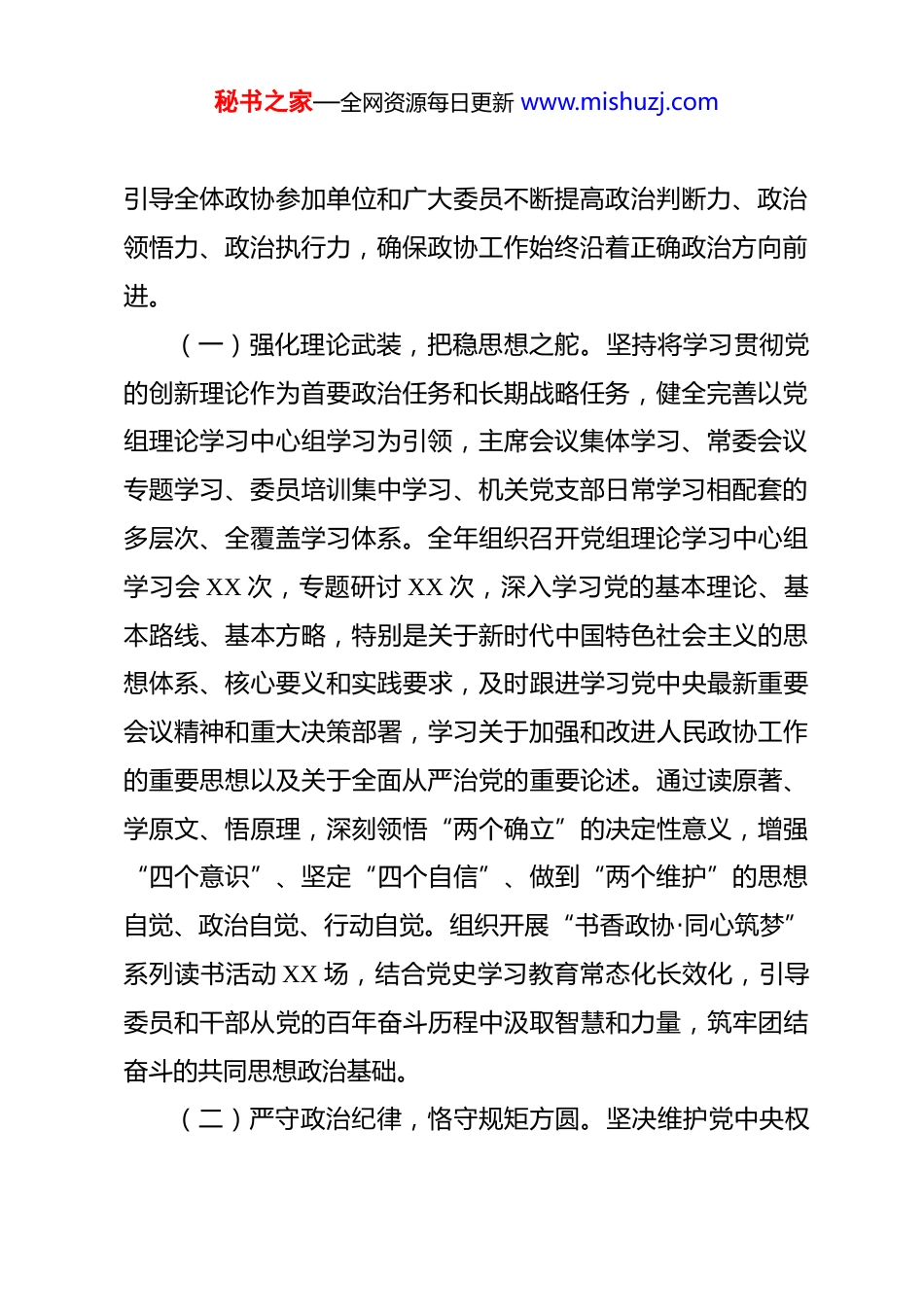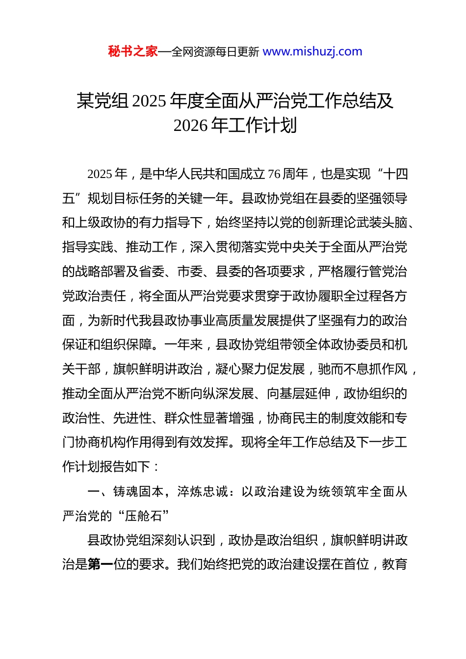 秘书之家—全网资源每日更新 www.mishuzj.com某党组 2025 年度全面从严治党工作总结及2026 年工作计划 2025 年,是中华人民共和国成立 76 周年,也是实现“十四五”规划目标任务的关键一年。县政协党组在县委的坚强领导和上级政协的有力指导下,始终坚持以党的创新理论武装头脑、指导实践、推动工作,深入贯彻落实党中央关于全面从严治党的战略部署及省委、市委、县委的各项要求,严格履行管党治党政治责任,将全面从严治党要求贯穿于政协履职全过程各方面,为新时代我县政协事业高质量发展提供了坚强有力的政治保证和组织保障。一年来,县政协党组带领全体政协委员和机关干部,旗帜鲜明讲政治,凝心聚力促发展,驰而不息抓作风,推动全面从严治党不断向纵深发展、向基层延伸,政协组织的政治性、先进性、群众性显著增强,协商民主的制度效能和专门协商机构作用得到有效发挥。现将全年工作总结及下一步工作计划报告如下:一、铸魂固本,淬炼忠诚:以政治建设为统领筑牢全面从严治党的“压舱石”县政协党组深刻认识到,政协是政治组织,旗帜鲜明讲政治是第一位的要求。我们始终把党的政治建设摆在首位,教育秘书之家—全网资源每日更新 www.mishuzj.com引导全体政协参加单位和广大委员不断提高政治判断力、政治领悟力、政治执行力,确保政协工作始终沿着正确政治方向前进。(一)强化理论武装,把稳思想之舵。坚持将学习贯彻党的创新理论作为首要政治任务和长期战略任务,健全完善以党组理论学习中心组学习为引领,主席会议集体学习、常委会议专题学习、委员培训集中学习、机关党支部日常学习相配套的多层次、全覆盖学习体系。全年组织召开党组理论学习中心组学习会 XX 次,专题研讨 XX 次,深入学习党的基本理论、基本路线、基本方略,特别是关于新时代中国特色社会主义的思想体系、核心要义和实践要求,及时跟进学习党中央最新重要会议精神和重大决策部署,学习关于加强和改进人民政协工作的重要思想以及关于全面从严治党的重要论述。通过读原著、学原文、悟原理,深刻领悟“两个确立”的决定性意义,增强“四个意识”、坚定“四个自信”、做到“两个维护”的思想自觉、政治自觉、行动自觉。组织开展“书香政协·同心筑梦”系列读书活动 XX 场,结合党史学习教育常态化长效化,引导委员和干部从党的百年奋斗历程中汲取智慧和力量,筑牢团结奋斗的共同思想政治基础。(二)严守政治纪律,恪守规矩方圆。坚决维护党中央权秘书之家—全网资源每日更新 www.mishuzj.com威和集中统一领导,始终在政治立场、政治方向、政治原则、政治道路上同党中央保持高度一致。严格执行重大事项请示报告制度,政协年度协商计划、常委会工作报告、全体会议方案等重要事项和重要情况,均及时向县委请示报告。严格落实意识形态工作责任制,党组定期分析研判政协领域意识形态风险,加强对政协各类会议、活动、出版物、网站、微信公众号等阵地的建设管理,严把政治关、政策关、内容关,旗帜鲜明反对和抵制各种错误思潮,坚决守好意识形态安全防线。教育引导政协委员和机关干部严格遵守政治纪律和政治规矩,不在政协活动中发表任何与党的路线方针政策相违背的言论,不做任何有损党的形象和威信的事情。(三)践行初心使命,服务中心大局。坚持把围绕中心、服务大局作为政协履职的根本着力点,自觉将政协工作置于全县发展大局中去谋划和推进。党组充分发挥把方向、管大局、保落实的领导作用,紧扣县委全会确定的奋斗目标和“十四五”规划实施中的关键问题,精心制定并实施年度协商计划,围绕“推动县域经济高质量发展”“优化营商环境”“全面推进乡村振兴”“加强生态环境保护”“保障和改善民生”等XX 项重点议题,深入开展调研视察、协商议政、民主监督。引导委员聚焦党委政府工作的重点、群众生产生活的难点、社秘书之家—全网资源每日更新 www.mishuzj.com会治理的焦点,建睿智之言、献务实之策。全年向县委、县政府报送调研报告、协商专报、社情民意信息 XX 篇,得到县委、县政府主要领导批示肯定 XX 次,许多意见建议被吸收采纳到相关政策文件和具体工作中,切实将全面从严治党...