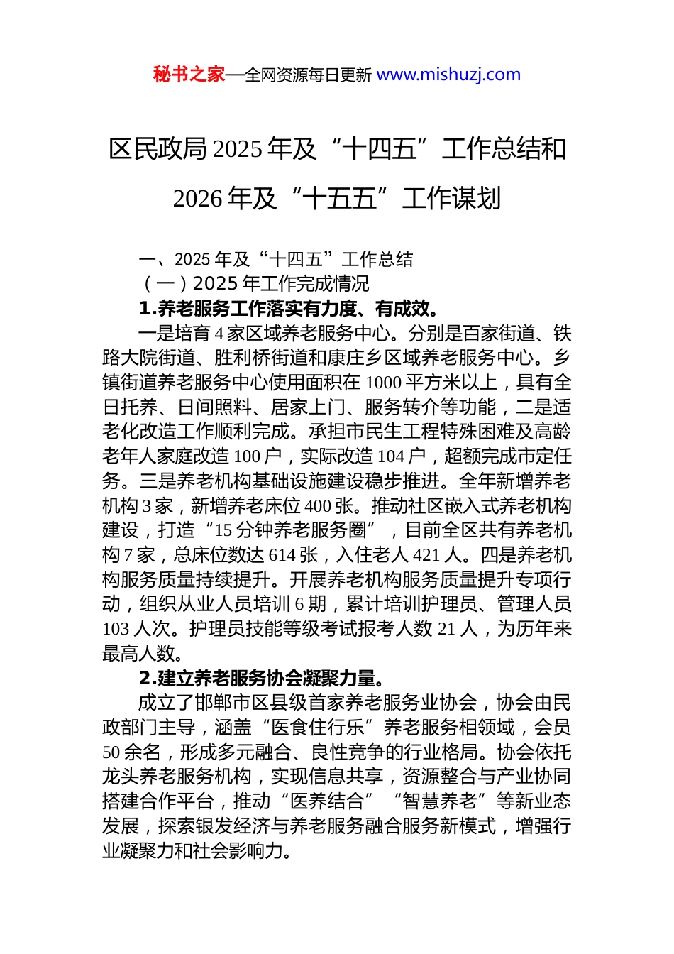 秘书之家—全网资源每日更新 www.mishuzj.com区民政局 2025 年及“十四五”工作总结和2026 年及“十五五”工作谋划一、2025 年及“十四五”工作总结(一)2025 年工作完成情况1.养老服务工作落实有力度、有成效。一是培育 4 家区域养老服务中心。分别是百家街道、铁路大院街道、胜利桥街道和康庄乡区域养老服务中心。乡镇街道养老服务中心使用面积在 1000 平方米以上,具有全日托养、日间照料、居家上门、服务转介等功能,二是适老化改造工作顺利完成。承担市民生工程特殊困难及高龄老年人家庭改造 100 户,实际改造 104 户,超额完成市定任务。三是养老机构基础设施建设稳步推进。全年新增养老机构 3 家,新增养老床位 400 张。推动社区嵌入式养老机构建设,打造“15 分钟养老服务圈”,目前全区共有养老机构 7 家,总床位数达 614 张,入住老人 421 人。四是养老机构服务质量持续提升。开展养老机构服务质量提升专项行动,组织从业人员培训 6 期,累计培训护理员、管理人员103 人次。护理员技能等级考试报考人数 21 人,为历年来最高人数。2.建立养老服务协会凝聚力量。成立了邯郸市区县级首家养老服务业协会,协会由民政部门主导,涵盖“医食住行乐”养老服务相领域,会员50 余名,形成多元融合、良性竞争的行业格局。协会依托龙头养老服务机构,实现信息共享,资源整合与产业协同搭建合作平台,推动“医养结合”“智慧养老”等新业态发展,探索银发经济与养老服务融合服务新模式,增强行业凝聚力和社会影响力。秘书之家—全网资源每日更新 www.mishuzj.com3.社会救助扩围增效民生工程。社会救助扩围增效民生工程持续稳步推进。截至 10 月份,全区城乡低保保障对象共计 1703 人,比 2024 年同期增加 10 人,实现动态精准保障;特困供养人员共计 117 人,较 2024 年同期增加 1 人,低保边缘家庭对象共计 3788 人,较 2024 年同期减少 782 人。1-10 月发放低保和特困供养资金 xx 万元,实现救助 1187 人 1816 户,充分发挥了民政部门对低收入人群的救助兜底保障作用。4.社会事务管理规范有序。《xx 区惠民殡葬政策实施细则》,《关于建立多部门综合监管工作机制加强殡葬管理的通知》已正式印发至相关部门。2025 年 1-9 月,共办理结婚登记 923 对,离婚登记678 对,受理离婚申请 1047 对,补发结婚证 640 对,补发离婚证 116 对,登记合格率保持 100%。依法开展社会组织年检工作,清理整治“僵尸型”社会组织,积极引导无效低效社会组织依法有序退出,全力做好社会组织“双随机一公开”工作。(二)“十四五”期间工作完成情况1.将困难老年人家庭适老化改造工程列入民生实事项目。从 20xx 年开始,我区将困难老年人家庭适老化改造工程列入民生实事项目,截止 2025 年已连续改造 5 年,改造完成 507 户,投入资金 xx 万元,走到了全省、全市的前列。邯钢医养中心被评为“全国敬老文明号”(全市唯一),百家街道六二社区书记杨红被评为“敬老爱老助老模范人物”,此两项表彰全国已公示,等待最后结果。2.优化提升机构养老服务。从 20xx 起,我区 5 家养老机构逐步实现星级全覆盖,邯钢医养中心,成为全市唯一一家五星级养老院;2024 年在市养老服务技能大赛上我区取得一、二、三等奖各 1 名和优秀组织奖,在河北省养老服务技能大赛上我区选手获得秘书之家—全网资源每日更新 www.mishuzj.com二等奖,创历年来最佳成绩。2025 年新增 3 家养老机构、成立了邯郸市区县级首家“邯郸市 xx 区养老服务业协会”,通过区政府工作会上会的形式,集中解决了困扰 6 家养老机构多年的消防审验历史遗留问题。3.健全社会救助体系,做好城乡最低生活保障动态管理工作。20xx 年至 2025 年期间,民生保障标准持续提升,保障效果显著。城市低保标准从 20xx 年的 xx 元/月,提高至当前的 xx 元/月;农村低保标准从 20xx 年的 xx 元/年,提高至当前的 xx 元/年。城市特困供养人员标准从 xx 元/月提升至xx 元/月,农村特困供养人员标准从 xx 元/月提升至 xx 元/月,各类保障...