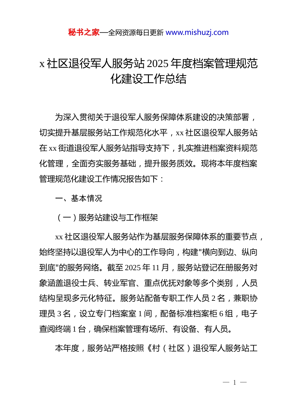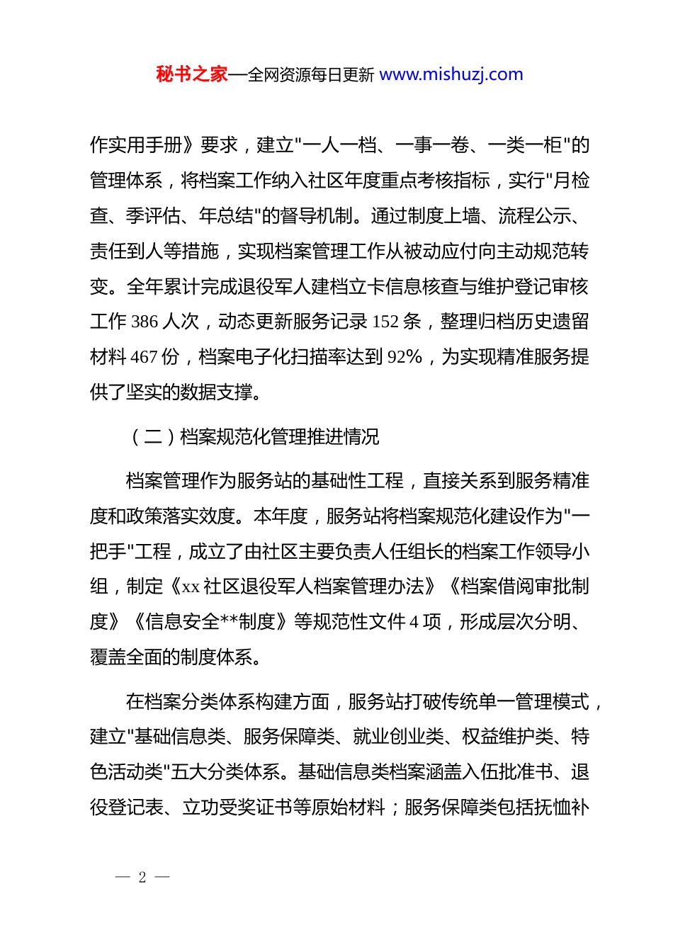 秘书之家—全网资源每日更新 www.mishuzj.comx 社区退役军人服务站 2025 年度档案管理规范化建设工作总结为深入贯彻关于退役军人服务保障体系建设的决策部署,切实提升基层服务站工作规范化水平,xx 社区退役军人服务站在 xx 街道退役军人服务站指导支持下,扎实推进档案资料规范化管理,全面夯实服务基础,提升服务质效。现将本年度档案管理规范化建设工作情况报告如下:一、基本情况(一)服务站建设与工作框架xx 社区退役军人服务站作为基层服务保障体系的重要节点,始终坚持以退役军人为中心的工作导向,构建"横向到边、纵向到底"的服务网络。截至 2025 年 11 月,服务站登记在册服务对象涵盖退役士兵、转业军官、重点优抚对象等多个类别,人员结构呈现多元化特征。服务站配备专职工作人员 2 名,兼职协理员 3 名,设立专门档案室 1 间,配备标准档案柜 6 组,电子查阅终端 1 台,确保档案管理有场所、有设备、有人员。本年度,服务站严格按照《村(社区)退役军人服务站工— 1 —秘书之家—全网资源每日更新 www.mishuzj.com作实用手册》要求,建立"一人一档、一事一卷、一类一柜"的管理体系,将档案工作纳入社区年度重点考核指标,实行"月检查、季评估、年总结"的督导机制。通过制度上墙、流程公示、责任到人等措施,实现档案管理工作从被动应付向主动规范转变。全年累计完成退役军人建档立卡信息核查与维护登记审核工作 386 人次,动态更新服务记录 152 条,整理归档历史遗留材料 467 份,档案电子化扫描率达到 92%,为实现精准服务提供了坚实的数据支撑。(二)档案规范化管理推进情况档案管理作为服务站的基础性工程,直接关系到服务精准度和政策落实效度。本年度,服务站将档案规范化建设作为"一把手"工程,成立了由社区主要负责人任组长的档案工作领导小组,制定《xx 社区退役军人档案管理办法》《档案借阅审批制度》《信息安全**制度》等规范性文件 4 项,形成层次分明、覆盖全面的制度体系。在档案分类体系构建方面,服务站打破传统单一管理模式,建立"基础信息类、服务保障类、就业创业类、权益维护类、特色活动类"五大分类体系。基础信息类档案涵盖入伍批准书、退役登记表、立功受奖证书等原始材料;服务保障类包括抚恤补— 2 —秘书之家—全网资源每日更新 www.mishuzj.com助发放记录、医疗救助申报资料、临时困难帮扶台账;就业创业类纳入技能培训证书、岗位推荐记录、创业扶持申请材料;权益维护类收录诉求反映渠道记录、信访接待台账、法律援助文书;特色活动类归档节日慰问影像资料、志愿服务记录、典型事迹材料。五大体系相互支撑、动态更新,确保档案内容完整、脉络清晰。在档案标准化流程建设方面,服务站对标示范创建要求,绘制《档案管理流程图》,明确"收集—整理—分类—编号—录入—归档—借阅—销毁"八步操作规范。每件档案实行"双编号"管理,即纸质档案编号与电子系统编号一一对应,确保线上线下同步更新。全年累计完成档案著录条目 1247 条,编制检索工具 3 种,建立档案目录数据库 1 个,实现档案检索平均响应时间控制在 3 分钟以内。针对部分历史档案存在的材料缺失、分类错位、信息不全等问题,组织专项整改行动,通过走访当事人、联系原部队、协调主管部门等方式,补充完善材料 87 份,纠正分类错误 23 处,更新过期信息 56 条,档案完整率提升至98.6%。在档案安全**管理方面,服务站严格执行"三铁一器"标准,配置恒温恒湿设备,定期开展档案安全检查。建立档案借阅"三— 3 —秘书之家—全网资源每日更新 www.mishuzj.com级审批"制度,一般信息由服务站负责人审批,敏感信息需报街道退役军人服务站备案,核心涉密材料须经区退役军人事务局批准。全年累计办理档案借阅申请 12 人次,均未发生泄密或遗失事件。同时,建立档案数字化副本异地备份机制,每月将电子档案备份至街道云端服务器,确保数据安全万无一失。(三)就业创业服务档案专项建设就业创业是退役军人关切的核心领域,也是档案管理的重点方向。服务站专门设立就业创业服务专柜,按照"一人一档、一企一册、一项一卷"原则,...
