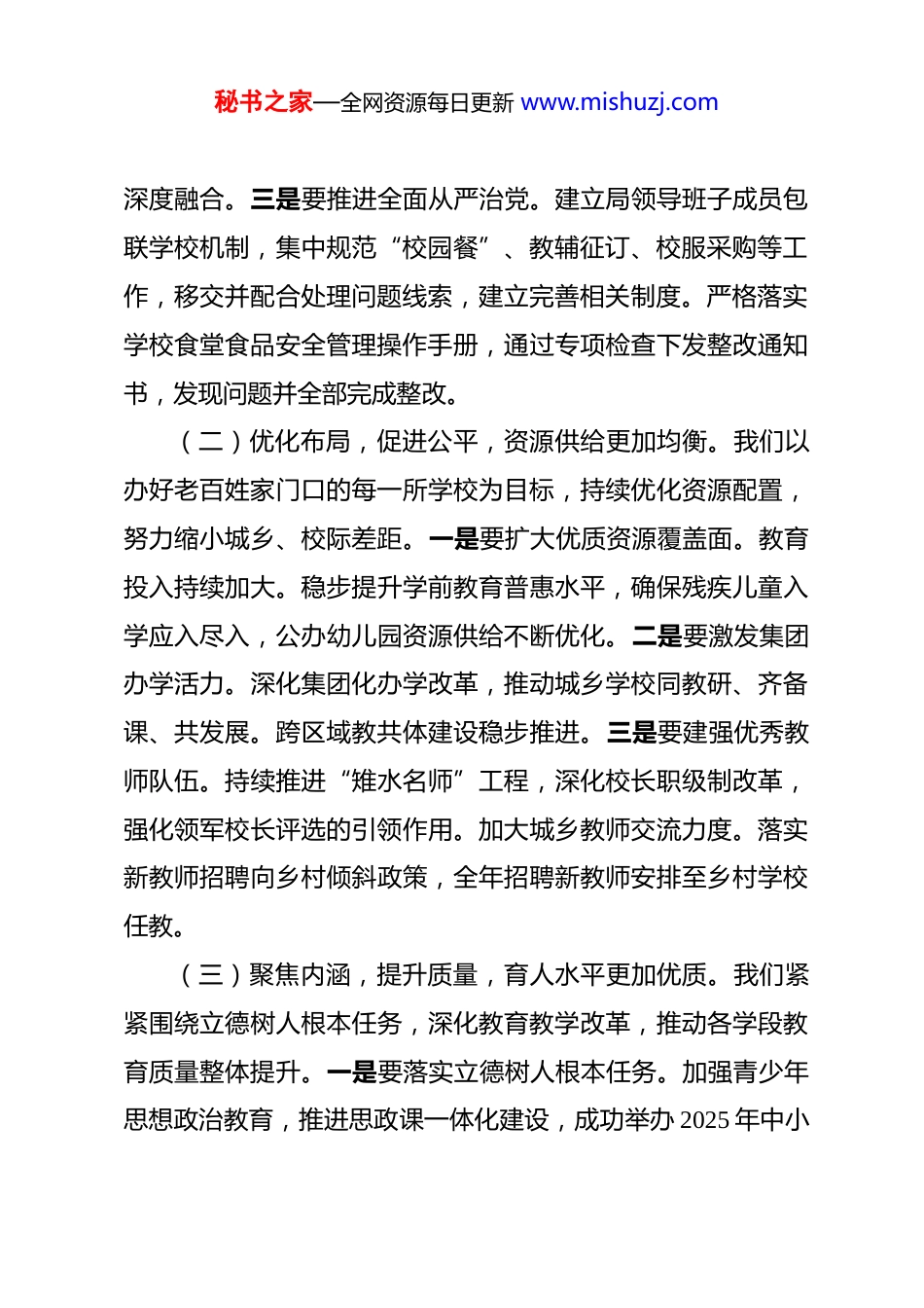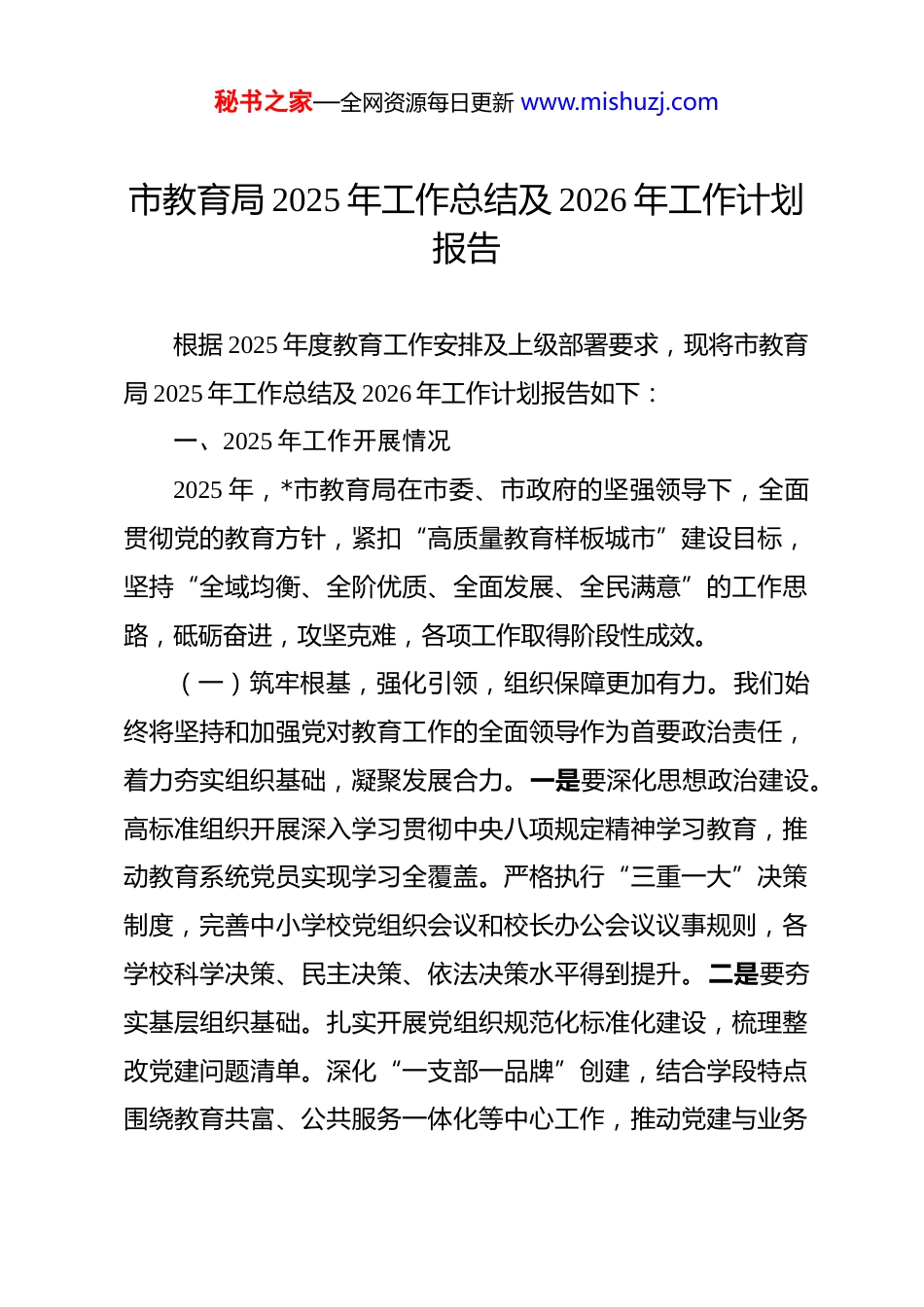 秘书之家—全网资源每日更新 www.mishuzj.com市教育局 2025 年工作总结及 2026 年工作计划报告 根据 2025 年度教育工作安排及上级部署要求,现将市教育局 2025 年工作总结及 2026 年工作计划报告如下:一、2025 年工作开展情况2025 年,*市教育局在市委、市政府的坚强领导下,全面贯彻党的教育方针,紧扣“高质量教育样板城市”建设目标,坚持“全域均衡、全阶优质、全面发展、全民满意”的工作思路,砥砺奋进,攻坚克难,各项工作取得阶段性成效。(一)筑牢根基,强化引领,组织保障更加有力。我们始终将坚持和加强党对教育工作的全面领导作为首要政治责任,着力夯实组织基础,凝聚发展合力。一是要深化思想政治建设。高标准组织开展深入学习贯彻中央八项规定精神学习教育,推动教育系统党员实现学习全覆盖。严格执行“三重一大”决策制度,完善中小学校党组织会议和校长办公会议议事规则,各学校科学决策、民主决策、依法决策水平得到提升。二是要夯实基层组织基础。扎实开展党组织规范化标准化建设,梳理整改党建问题清单。深化“一支部一品牌”创建,结合学段特点围绕教育共富、公共服务一体化等中心工作,推动党建与业务秘书之家—全网资源每日更新 www.mishuzj.com深度融合。三是要推进全面从严治党。建立局领导班子成员包联学校机制,集中规范“校园餐”、教辅征订、校服采购等工作,移交并配合处理问题线索,建立完善相关制度。严格落实学校食堂食品安全管理操作手册,通过专项检查下发整改通知书,发现问题并全部完成整改。(二)优化布局,促进公平,资源供给更加均衡。我们以办好老百姓家门口的每一所学校为目标,持续优化资源配置,努力缩小城乡、校际差距。一是要扩大优质资源覆盖面。教育投入持续加大。稳步提升学前教育普惠水平,确保残疾儿童入学应入尽入,公办幼儿园资源供给不断优化。二是要激发集团办学活力。深化集团化办学改革,推动城乡学校同教研、齐备课、共发展。跨区域教共体建设稳步推进。三是要建强优秀教师队伍。持续推进“雉水名师”工程,深化校长职级制改革,强化领军校长评选的引领作用。加大城乡教师交流力度。落实新教师招聘向乡村倾斜政策,全年招聘新教师安排至乡村学校任教。(三)聚焦内涵,提升质量,育人水平更加优质。我们紧紧围绕立德树人根本任务,深化教育教学改革,推动各学段教育质量整体提升。一是要落实立德树人根本任务。加强青少年思想政治教育,推进思政课一体化建设,成功举办 2025 年中小秘书之家—全网资源每日更新 www.mishuzj.com学思政微队课大赛,*节课例在市级比赛中获奖。深化“三土”思政课程(国家热土、家乡泥土、思想净土)建设,其入选省大中小学思政课一体化建设区域综合示范项目。强化家校社协同,制定《*县家校社协同育人“教联体”实施方案》并推动实施。二是要深化教育教学改革。聚力课堂提质,在“活动单导学”模式基础上,创推“课堂作业当堂清、课后作业校内清”,通过随堂听课、专项督导等提升常态课质效。中考改革试点稳步推进,完成社会风险评估,制定《县深化中考制度改革实施方案(试行)》。三是要推动各类教育协调发展。基础教育扩优提质,外来学子数量持续增长。高中教育特色多样发展。职业教育产教融合深化,与百余家企业合作,精准服务地方产业发展。特殊教育体系不断完善,启动迁址改建现代化十五年一贯制特殊教育学校。(四)关爱身心,优化生态,学生发展更加全面。我们坚持“五育并举”,着力构建德智体美劳全面培养的教育体系,促进学生健康成长、阳光成长。一是要提升学生综合素养。全面落实“2·15 专项行动”要求,确保小学“每天一节体育课”全覆盖,严格落实课间 15 分钟时长规定,扎实开展每天上、下午各 30 分钟的大课间活动,基本保障学生每天校内 2 小时体育活动时间。浓厚科创氛围,开展“百名科学家进中小学课堂”秘书之家—全网资源每日更新 www.mishuzj.com等研学活动。打造“一校多品”体艺特色,学生体质合格率、优良率显著提升。二是要深化“双减”工作。统筹作业管理,推行分层作业、个性化作业和教师面批辅导,切实减轻学生负担。打造“...