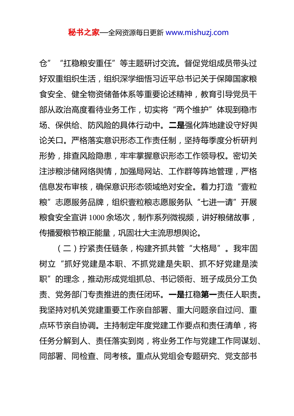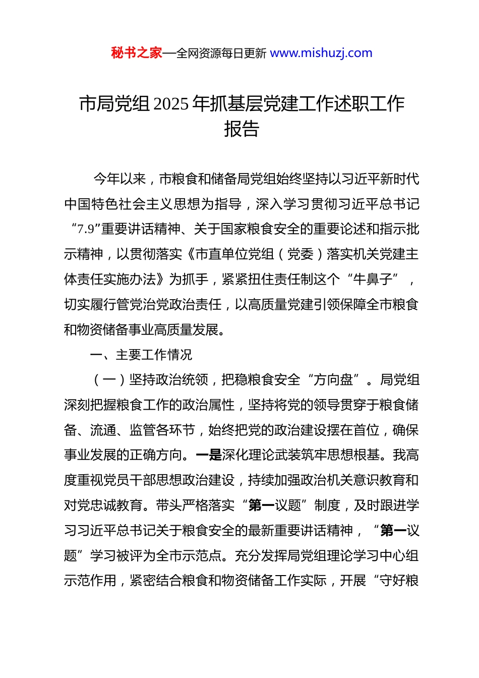 秘书之家—全网资源每日更新 www.mishuzj.com市局党组 2025 年抓基层党建工作述职工作报告 今年以来,市粮食和储备局党组始终坚持以习近平新时代中国特色社会主义思想为指导,深入学习贯彻习近平总书记“7.9”重要讲话精神、关于国家粮食安全的重要论述和指示批示精神,以贯彻落实《市直单位党组(党委)落实机关党建主体责任实施办法》为抓手,紧紧扭住责任制这个“牛鼻子”,切实履行管党治党政治责任,以高质量党建引领保障全市粮食和物资储备事业高质量发展。一、主要工作情况(一)坚持政治统领,把稳粮食安全“方向盘”。局党组深刻把握粮食工作的政治属性,坚持将党的领导贯穿于粮食储备、流通、监管各环节,始终把党的政治建设摆在首位,确保事业发展的正确方向。一是深化理论武装筑牢思想根基。我高度重视党员干部思想政治建设,持续加强政治机关意识教育和对党忠诚教育。带头严格落实“第一议题”制度,及时跟进学习习近平总书记关于粮食安全的最新重要讲话精神,“第一议题”学习被评为全市示范点。充分发挥局党组理论学习中心组示范作用,紧密结合粮食和物资储备工作实际,开展“守好粮秘书之家—全网资源每日更新 www.mishuzj.com仓”“扛稳粮安重任”等主题研讨交流。督促党组成员带头过好双重组织生活,组织深学细悟习近平总书记关于保障国家粮食安全、健全物资储备体系等重要论述精神,教育引导党员干部从政治高度看待业务工作,切实将“两个维护”体现到稳市场、保供给、防风险的具体行动中。二是强化阵地建设守好舆论关口。严格落实意识形态工作责任制,坚持每季度分析研判形势,排查风险隐患,牢牢掌握意识形态工作领导权。密切关注涉粮涉储网络舆情,加强局网站、工作群等阵地管理,严格信息发布审核,确保意识形态领域绝对安全。着力打造“壹粒粮”志愿服务品牌,组织壹粒粮志愿服务队“七进一请”开展粮食安全宣讲 1000 余场次,制作系列微视频,讲好粮储故事,传播爱粮节粮正能量,巩固壮大主流思想舆论。(二)拧紧责任链条,构建齐抓共管“大格局”。我牢固树立“抓好党建是本职、不抓党建是失职、抓不好党建是渎职”的理念,推动形成党组抓总、书记领衔、班子成员分工负责、党务部门专责推进的责任闭环。一是扛稳第一责任人职责。我坚持对机关党建重要工作亲自部署、重大问题亲自过问、重点环节亲自协调。主持制定年度党建工作要点和责任清单,将任务分解到人、责任落实到岗,将业务工作与党建工作同谋划、同部署、同检查、同考核。重点从党组会专题研究、党支部书秘书之家—全网资源每日更新 www.mishuzj.com记述职评议、年度考核等方面抓好责任落实,发挥好带头作用。二是推动“一岗双责”落细。要求班子成员定期听取分管单位(处室)党建工作汇报,经常性开展谈心谈话,针对粮食购销、仓储管理等廉政风险点开展提醒督导。每半年向党组报告“一岗双责”落实情况,形成齐抓共管合力。三是强化专责机构作用。选优配强机关党委和机关纪委干部队伍,支持其依规履职。认真学习贯彻《关于加强中央和国家机关部门机关党委建设的意见》,机关党委聚焦主责主业,具体负责党建任务的组织实施、督促检查和考核评价。机关纪委强化监督执纪问责,聚焦关键岗位和重点环节,做实日常监督。完善局系统抓党建“三级五岗”责任清单,确保压力传导到位,责任无缝衔接。(三)夯实基层基础,锻造坚强有力“战斗堡”。坚持大抓基层的鲜明导向,加强支部建设,深化党建联建,推动基层党组织在储备管理、为农服务中发挥实质作用。一是联建共建提升党建业务融合度。 以“四强”党支部创建为抓手,结合粮食和储备工作实际,持续推进局机关与市农发集团党建联建共建,抓好“六联”工作机制落实。在夏秋粮收购一线设立党员先锋岗,在仓储智能化绿色化改造项目中成立临时党支部,督促党员干部牢记职责使命,做到守土有责、守土尽责。二是创新形式增强组织生活吸引力。着力破解“三会一课”、主题党秘书之家—全网资源每日更新 www.mishuzj.com日等组织生活形式固化、内容空泛等问题,结合粮食和储备工作特点,积极开展形式创新。“三会一课”突出“粮味”。经常将党员大...