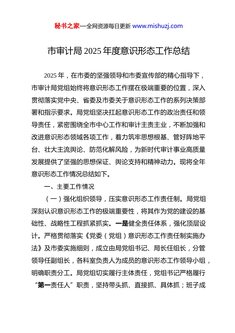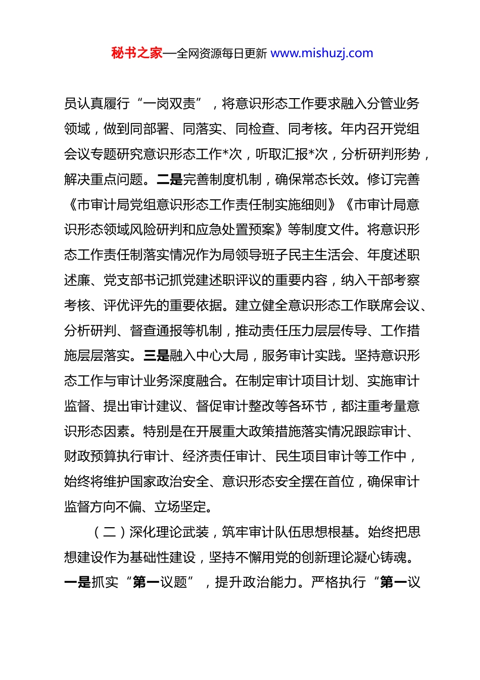 秘书之家—全网资源每日更新 www.mishuzj.com市审计局 2025 年度意识形态工作总结 2025 年,在市委的坚强领导和市委宣传部的精心指导下,市审计局党组始终将意识形态工作摆在极端重要的位置,深入贯彻落实党中央、省委及市委关于意识形态工作的系列决策部署和指示要求。局党组坚决扛起意识形态工作的政治责任和领导责任,紧密围绕全市中心工作和审计主责主业,不断加强和改进意识形态领域各项工作,着力筑牢思想根基、管好阵地平台、壮大主流舆论、防范化解风险,为新时代审计事业高质量发展提供了坚强的思想保证、舆论支持和精神动力。现将全年意识形态工作情况总结如下。一、主要工作情况(一)强化组织领导,压实意识形态工作责任制。局党组深刻认识意识形态工作的极端重要性,将其作为党的建设的基础性、战略性工程抓紧抓实。一是健全责任体系,强化顶层设计。严格贯彻落实《党委(党组)意识形态工作责任制实施办法》及市委实施细则,成立由局党组书记、局长任组长,分管领导任副组长,各科室负责人为成员的意识形态工作领导小组,明确职责分工。局党组切实履行主体责任,党组书记严格履行“第一责任人”职责,坚持带头抓、直接抓、具体抓;班子成秘书之家—全网资源每日更新 www.mishuzj.com员认真履行“一岗双责”,将意识形态工作要求融入分管业务领域,做到同部署、同落实、同检查、同考核。年内召开党组会议专题研究意识形态工作*次,听取汇报*次,分析研判形势,解决重点问题。二是完善制度机制,确保常态长效。修订完善《市审计局党组意识形态工作责任制实施细则》《市审计局意识形态领域风险研判和应急处置预案》等制度文件。将意识形态工作责任制落实情况作为局领导班子民主生活会、年度述职述廉、党支部书记抓党建述职评议的重要内容,纳入干部考察考核、评优评先的重要依据。建立健全意识形态工作联席会议、分析研判、督查通报等机制,推动责任压力层层传导、工作措施层层落实。三是融入中心大局,服务审计实践。坚持意识形态工作与审计业务深度融合。在制定审计项目计划、实施审计监督、提出审计建议、督促审计整改等各环节,都注重考量意识形态因素。特别是在开展重大政策措施落实情况跟踪审计、财政预算执行审计、经济责任审计、民生项目审计等工作中,始终将维护国家政治安全、意识形态安全摆在首位,确保审计监督方向不偏、立场坚定。(二)深化理论武装,筑牢审计队伍思想根基。始终把思想建设作为基础性建设,坚持不懈用党的创新理论凝心铸魂。一是抓实“第一议题”,提升政治能力。严格执行“第一议秘书之家—全网资源每日更新 www.mishuzj.com题”制度,第一时间组织学习习近平总书记最新重要讲话、重要指示批示精神和党中央重大决策部署,特别是关于宣传思想文化工作、审计工作的重要论述。全年组织党组理论学习中心组集中学习共*次,专题研讨*次,引领全局干部职工深刻领悟“两个确立”的决定性意义,增强“四个意识”、坚定“四个自信”、做到“两个维护”,不断提高政治判断力、政治领悟力、政治执行力。二是强化思想教育,筑牢信仰之基。巩固拓展主题教育成果,持续深入学习党的二十大精神及历次全会精神。制定《市审计局 2025 年度党员干部理论学习计划》,依托“三会一课”、主题党日、专题读书班等形式,组织党员干部读原著、学原文、悟原理。全年开展各类集中学习共*次,讲授专题党课*次。围绕“学思想、强党性、重实践、建新功”总要求,组织撰写高质量学习心得*篇,开展专题研讨交流*场,推动党的创新理论入脑入心、见行见效。三是创新学习载体,增强渗透实效。充分利用“学习强国”学习平台、审计署“审计大讲堂”、市委党校线上课程等资源,拓展学习渠道。结合审计工作特点,组织开展“审计大讲堂·微论坛”、“红色经典诵读会”、“党章党规知识竞赛”等活动。组织党员干部赴*红色教育基地、*廉政教育基地开展沉浸式学习,传承红色基因,筑牢廉洁防线。坚持党建带群建,指导局工会、团支部、妇委会秘书之家—全网资源每日更新 www.mishuzj.com开展“书香审计”、“青年审计干部说”、“巾帼建功”等主题学习实践活动,激发干部职...
