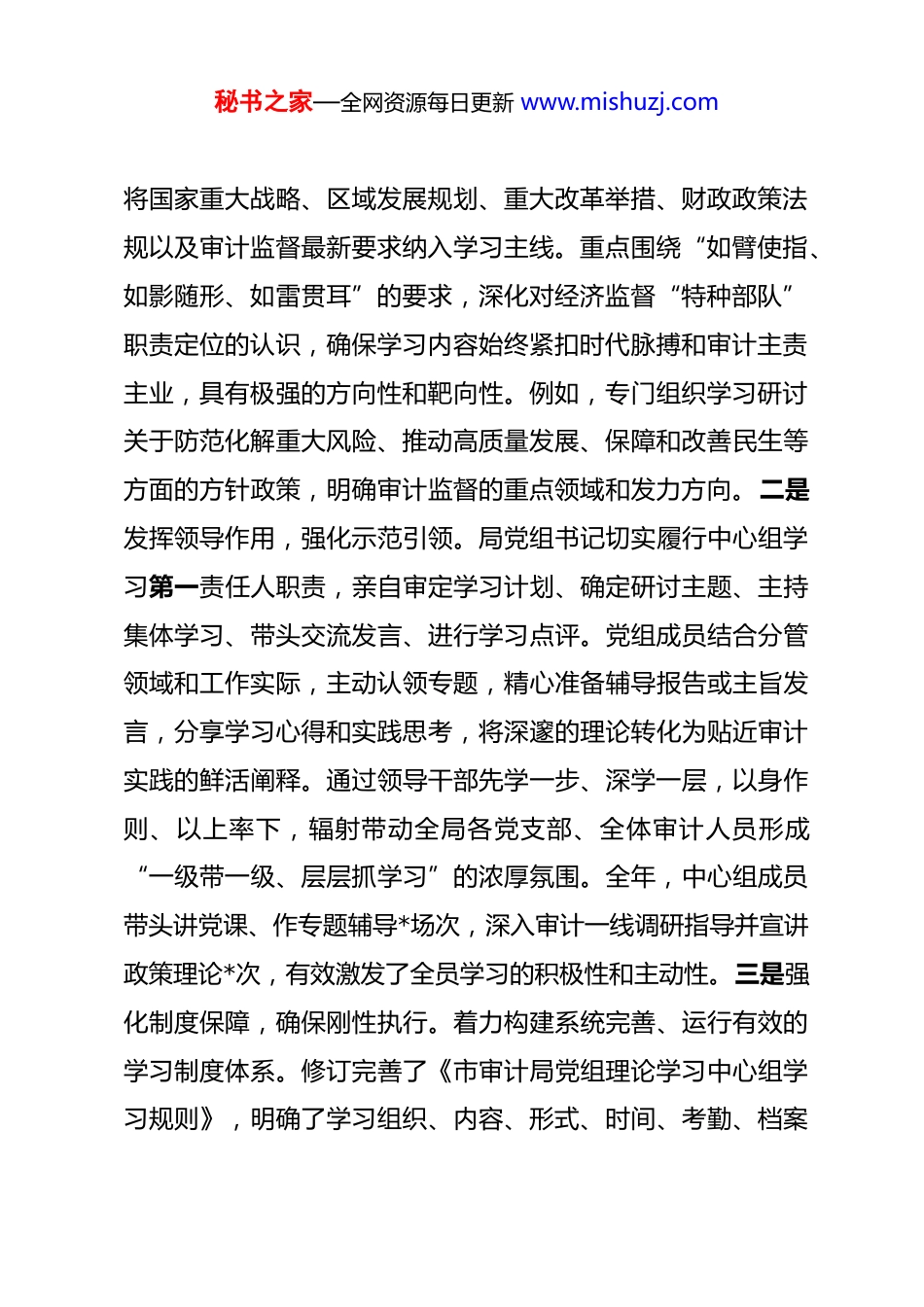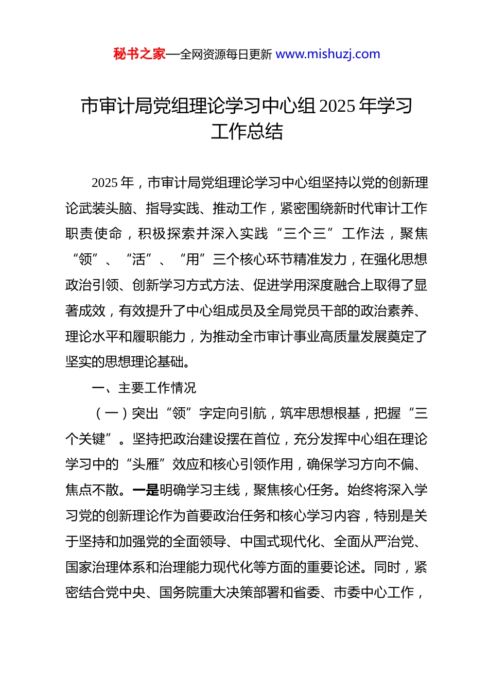 秘书之家—全网资源每日更新 www.mishuzj.com市审计局党组理论学习中心组 2025 年学习工作总结 2025 年,市审计局党组理论学习中心组坚持以党的创新理论武装头脑、指导实践、推动工作,紧密围绕新时代审计工作职责使命,积极探索并深入实践“三个三”工作法,聚焦“领”、“活”、“用”三个核心环节精准发力,在强化思想政治引领、创新学习方式方法、促进学用深度融合上取得了显著成效,有效提升了中心组成员及全局党员干部的政治素养、理论水平和履职能力,为推动全市审计事业高质量发展奠定了坚实的思想理论基础。一、主要工作情况(一)突出“领”字定向引航,筑牢思想根基,把握“三个关键”。坚持把政治建设摆在首位,充分发挥中心组在理论学习中的“头雁”效应和核心引领作用,确保学习方向不偏、焦点不散。一是明确学习主线,聚焦核心任务。始终将深入学习党的创新理论作为首要政治任务和核心学习内容,特别是关于坚持和加强党的全面领导、中国式现代化、全面从严治党、国家治理体系和治理能力现代化等方面的重要论述。同时,紧密结合党中央、国务院重大决策部署和省委、市委中心工作,秘书之家—全网资源每日更新 www.mishuzj.com将国家重大战略、区域发展规划、重大改革举措、财政政策法规以及审计监督最新要求纳入学习主线。重点围绕“如臂使指、如影随形、如雷贯耳”的要求,深化对经济监督“特种部队”职责定位的认识,确保学习内容始终紧扣时代脉搏和审计主责主业,具有极强的方向性和靶向性。例如,专门组织学习研讨关于防范化解重大风险、推动高质量发展、保障和改善民生等方面的方针政策,明确审计监督的重点领域和发力方向。二是发挥领导作用,强化示范引领。局党组书记切实履行中心组学习第一责任人职责,亲自审定学习计划、确定研讨主题、主持集体学习、带头交流发言、进行学习点评。党组成员结合分管领域和工作实际,主动认领专题,精心准备辅导报告或主旨发言,分享学习心得和实践思考,将深邃的理论转化为贴近审计实践的鲜活阐释。通过领导干部先学一步、深学一层,以身作则、以上率下,辐射带动全局各党支部、全体审计人员形成“一级带一级、层层抓学习”的浓厚氛围。全年,中心组成员带头讲党课、作专题辅导*场次,深入审计一线调研指导并宣讲政策理论*次,有效激发了全员学习的积极性和主动性。三是强化制度保障,确保刚性执行。着力构建系统完善、运行有效的学习制度体系。修订完善了《市审计局党组理论学习中心组学习规则》,明确了学习组织、内容、形式、时间、考勤、档案秘书之家—全网资源每日更新 www.mishuzj.com管理等具体要求。严格执行“年初有计划、季度有安排、月月有学习、次次有主题”的定期学习制度,确保学习常态化、规范化。建立健全学习考勤与通报制度,对中心组成员参学情况进行严格登记和定期通报。探索实施学习成果交流与评估制度,要求中心组成员每年至少撰写*篇高质量学习心得或调研报告,并在一定范围内进行交流评议。推行学习档案管理制度,对学习计划、通知、记录、考勤、发言材料、总结报告等进行规范建档备查。制度的刚性约束保障了学习的严肃性、规范性和持续性,有效克服了学习随意化、形式化倾向。(二)聚焦“活”字激发动能,创新方式载体,抓好“三个创新”。针对理论学习可能存在的吸引力不足、参与度不高、实效性不强等问题,中心组积极拓展思路,在提升学习的吸引力、感染力和渗透力上大胆创新。一是创新学习内容选择,力求精准鲜活。在坚持理论主线的基础上,紧密结合审计业务需求和党员干部思想实际,实行“必修+选修”、“理论+实践”、“宏观+微观”相结合的内容供给模式。一方面,紧跟党的理论创新步伐和上级最新精神,及时跟进学习。另一方面,紧扣审计实践中的难点、热点、堵点问题,将宏观经济形势分析、财政金融政策解读、法律法规更新、大数据审计技术应用、典型案例剖析、廉政风险防控等作为重要学习内容。注重回应秘书之家—全网资源每日更新 www.mishuzj.com党员干部普遍关心的理论困惑和实践难题,使学习内容更接地气、更有温度、更具指导性。例如,针对政府投资项目审计中的难点,专题组织...