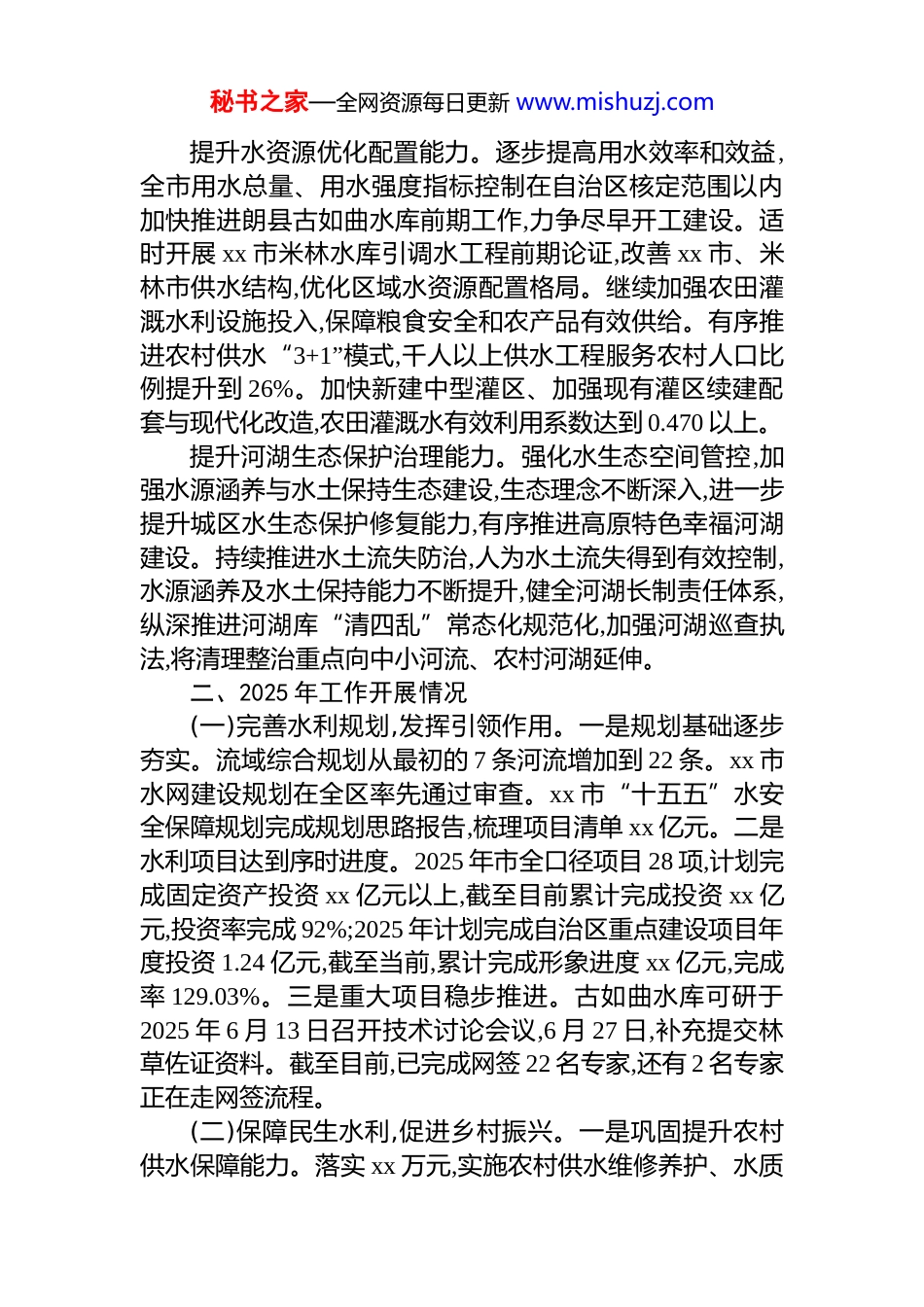 秘书之家—全网资源每日更新 www.mishuzj.com市水利局 2025 年工作总结及 2026 年工作计划根据《关于报送 2025 年工作总结及 2026 年工作要点的通知》要求,现将我局 2025 年工作总结及 2026 年工作计划报告如下。一、“十四五”工作总结和“十五五”工作思路(一)“十四五”水安全保障规划工作总结“十四五”期间,紧紧围绕《xx 市“十四五”水安全保障规划》目标,有效保障水利建设资金的需求,“十四五”期间规划投资 23.13 亿元,执行率 100%。通过水利项目实施,有效解决 2.9 万搬迁人口供水问题,累计巩固提升 16.36 万人供水保障水平,综合治理水土流失面积 403.86 平方公里,综合治理河长 455.5 公里,新建堤防 222.63 公里,护岸 32.77 公里,新增灌溉面积 0.96 万亩,改善灌溉面积 7.433 万亩,新增年供水能力3171.6 万立方米。全面提升了水旱灾害防御能力、水资源优化配置能力、水生态保护治理能力和农村饮水安全保障能力,为我市经济社会高质量发展提供了坚实的水安全保障。(二)“十五五”水安全保障规划工作思路“十五五”期间将着力补齐防洪减灾、水资源配置、城乡供水、水生态保护等短板和薄弱环节,持续提升水安全保障能力。提升防洪减灾防控能力。实施雅鲁藏布江等主要支流重点河段综合治理,有序推进中小河流防洪治理。构建与城镇经济社会发展相适应的城镇防洪体系,紧跟新城区发展和米林市撤县设市防洪需求,稳步提升城市防洪安全保障能力。推进山洪灾害防治,持续完善非工程措施与工程措施相结合的小流域山洪灾害综合防御体系。秘书之家—全网资源每日更新 www.mishuzj.com提升水资源优化配置能力。逐步提高用水效率和效益,全市用水总量、用水强度指标控制在自治区核定范围以内加快推进朗县古如曲水库前期工作,力争尽早开工建设。适时开展 xx 市米林水库引调水工程前期论证,改善 xx 市、米林市供水结构,优化区域水资源配置格局。继续加强农田灌溉水利设施投入,保障粮食安全和农产品有效供给。有序推进农村供水“3+1”模式,千人以上供水工程服务农村人口比例提升到 26%。加快新建中型灌区、加强现有灌区续建配套与现代化改造,农田灌溉水有效利用系数达到 0.470 以上。提升河湖生态保护治理能力。强化水生态空间管控,加强水源涵养与水土保持生态建设,生态理念不断深入,进一步提升城区水生态保护修复能力,有序推进高原特色幸福河湖建设。持续推进水土流失防治,人为水土流失得到有效控制,水源涵养及水土保持能力不断提升,健全河湖长制责任体系,纵深推进河湖库“清四乱”常态化规范化,加强河湖巡查执法,将清理整治重点向中小河流、农村河湖延伸。二、2025 年工作开展情况(一)完善水利规划,发挥引领作用。一是规划基础逐步夯实。流域综合规划从最初的 7 条河流增加到 22 条。xx 市水网建设规划在全区率先通过审查。xx 市“十五五”水安全保障规划完成规划思路报告,梳理项目清单 xx 亿元。二是水利项目达到序时进度。2025 年市全口径项目 28 项,计划完成固定资产投资 xx 亿元以上,截至目前累计完成投资 xx 亿元,投资率完成 92%;2025 年计划完成自治区重点建设项目年度投资 1.24 亿元,截至当前,累计完成形象进度 xx 亿元,完成率 129.03%。三是重大项目稳步推进。古如曲水库可研于2025 年 6 月 13 日召开技术讨论会议,6 月 27 日,补充提交林草佐证资料。截至目前,已完成网签 22 名专家,还有 2 名专家正在走网签流程。(二)保障民生水利,促进乡村振兴。一是巩固提升农村供水保障能力。落实 xx 万元,实施农村供水维修养护、水质秘书之家—全网资源每日更新 www.mishuzj.com提升等项目 40 项,项目实施后将提升 2.55 万农村人口供水保障能力。截至目前,累计完成投资 xx 万元,投资完成率 97%,完工项目 34 项,受益群众 2.39 万人,年初目标为巩固提升 0.9万人供水保障水平,已完成目标的 266%。二是大力提升农田灌溉水平。落实 xx 万元,实施 xx 市波密县玉倾灌区续建配套与现代化改造工程,改善灌溉面积 2.011 万亩。截至目前,完成投资 xx 万元,完成投资率 85%。确定样点灌区 11 处,选择典型...