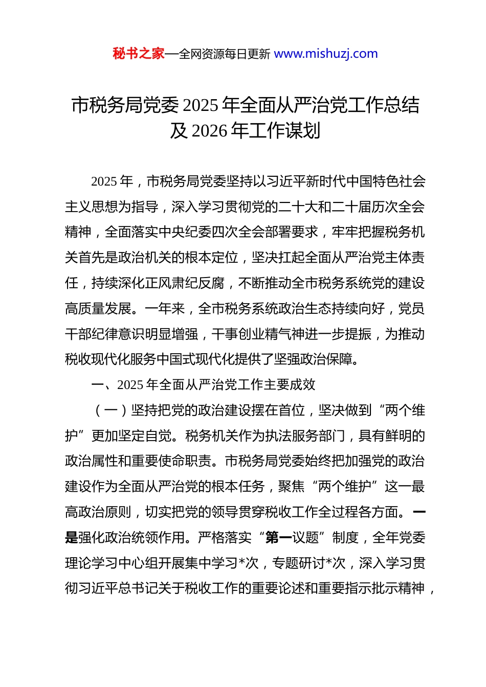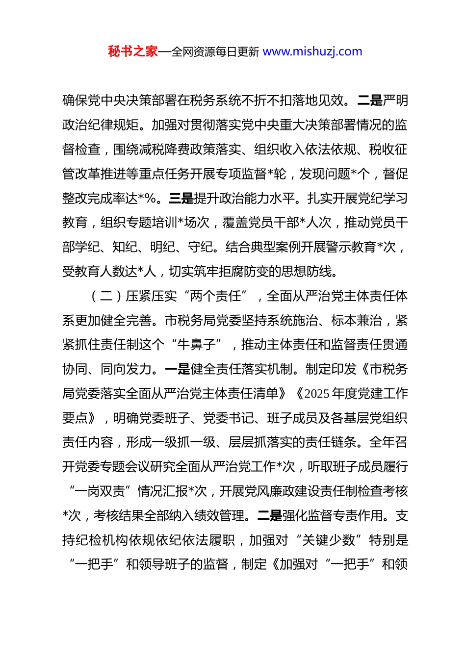 秘书之家—全网资源每日更新 www.mishuzj.com市税务局党委 2025 年全面从严治党工作总结及 2026 年工作谋划 2025 年,市税务局党委坚持以习近平新时代中国特色社会主义思想为指导,深入学习贯彻党的二十大和二十届历次全会精神,全面落实中央纪委四次全会部署要求,牢牢把握税务机关首先是政治机关的根本定位,坚决扛起全面从严治党主体责任,持续深化正风肃纪反腐,不断推动全市税务系统党的建设高质量发展。一年来,全市税务系统政治生态持续向好,党员干部纪律意识明显增强,干事创业精气神进一步提振,为推动税收现代化服务中国式现代化提供了坚强政治保障。一、2025 年全面从严治党工作主要成效(一)坚持把党的政治建设摆在首位,坚决做到“两个维护”更加坚定自觉。税务机关作为执法服务部门,具有鲜明的政治属性和重要使命职责。市税务局党委始终把加强党的政治建设作为全面从严治党的根本任务,聚焦“两个维护”这一最高政治原则,切实把党的领导贯穿税收工作全过程各方面。一是强化政治统领作用。严格落实“第一议题”制度,全年党委理论学习中心组开展集中学习*次,专题研讨*次,深入学习贯彻习近平总书记关于税收工作的重要论述和重要指示批示精神,秘书之家—全网资源每日更新 www.mishuzj.com确保党中央决策部署在税务系统不折不扣落地见效。二是严明政治纪律规矩。加强对贯彻落实党中央重大决策部署情况的监督检查,围绕减税降费政策落实、组织收入依法依规、税收征管改革推进等重点任务开展专项监督*轮,发现问题*个,督促整改完成率达*%。三是提升政治能力水平。扎实开展党纪学习教育,组织专题培训*场次,覆盖党员干部*人次,推动党员干部学纪、知纪、明纪、守纪。结合典型案例开展警示教育*次,受教育人数达*人,切实筑牢拒腐防变的思想防线。(二)压紧压实“两个责任”,全面从严治党主体责任体系更加健全完善。市税务局党委坚持系统施治、标本兼治,紧紧抓住责任制这个“牛鼻子”,推动主体责任和监督责任贯通协同、同向发力。一是健全责任落实机制。制定印发《市税务局党委落实全面从严治党主体责任清单》《2025 年度党建工作要点》,明确党委班子、党委书记、班子成员及各基层党组织责任内容,形成一级抓一级、层层抓落实的责任链条。全年召开党委专题会议研究全面从严治党工作*次,听取班子成员履行“一岗双责”情况汇报*次,开展党风廉政建设责任制检查考核*次,考核结果全部纳入绩效管理。二是强化监督专责作用。支持纪检机构依规依纪依法履职,加强对“关键少数”特别是“一把手”和领导班子的监督,制定《加强对“一把手”和领秘书之家—全网资源每日更新 www.mishuzj.com导班子监督的具体措施》。全年对*名新任领导干部开展任前廉政谈话,对*名干部进行提醒谈话,对*名存在苗头性、倾向性问题的干部及时“咬耳扯袖”。三是做实日常监督提醒。运用监督执纪“四种形态”处置*人次,其中第一种形态占比*%,真正实现抓早抓小、防微杜渐。建立重点岗位廉政风险动态排查机制,梳理高风险岗位*个,制定防控措施*项,实现监督关口前移。(三)持续深化作风建设,求真务实清正廉洁氛围更加浓厚。作风建设永远在路上。市税务局党委持之以恒落实中央八项规定及其实施细则精神,锲而不舍纠“四风”树新风,推动作风建设常态化长效化。一是坚决整治形式主义官僚主义。聚焦基层反映强烈的报表多、会议多、检查多等问题,开展“基层减负年”专项行动,精简各类会议*%,压缩文件数量*%,取消非必要报表*项,切实为基层松绑减负。推行“一线工作法”,班子成员带队深入基层调研*次,帮助解决实际困难*项。二是严查享乐主义奢靡之风。紧盯重要节点、重点领域,组织开展明察暗访*轮,检查单位*个,发现并纠正问题*个。严肃查处违规收送礼品礼金、公款吃喝等问题*起,处理干部*人,通报曝光典型案件*起,形成有力震慑。三是大力弘扬新风正气。深入开展“清廉税务”建设,评选表彰“勤廉双优”先进典型*秘书之家—全网资源每日更新 www.mishuzj.com名,举办廉洁文化作品展、家风故事分享会等活动*场次,引导广大税务干部筑牢廉洁从税思想根基。推广“非接触式...