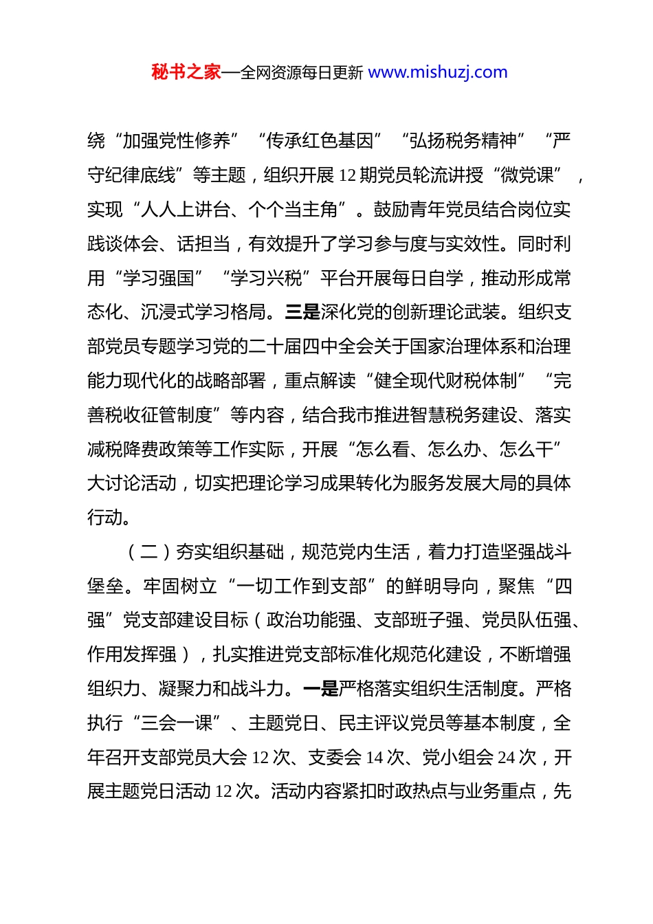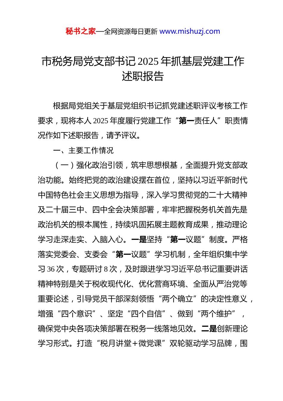 秘书之家—全网资源每日更新 www.mishuzj.com市税务局党支部书记 2025 年抓基层党建工作述职报告 根据局党组关于基层党组织书记抓党建述职评议考核工作要求,现将本人 2025 年度履行党建工作“第一责任人”职责情况作如下述职报告,请予评议。一、主要工作情况(一)强化政治引领,筑牢思想根基,全面提升党支部政治功能。始终把党的政治建设摆在首位,坚持以习近平新时代中国特色社会主义思想为指导,深入学习贯彻党的二十大精神及二十届三中、四中全会决策部署,牢牢把握税务机关首先是政治机关的根本属性,持续巩固拓展主题教育成果,推动理论学习走深走实、入脑入心。一是坚持“第一议题”制度。严格落实党委会、支委会“第一议题”学习机制,全年组织集中学习 36 次,专题研讨 8 次,及时跟进学习习近平总书记重要讲话精神特别是关于税收现代化、优化营商环境、全面从严治党等重要论述,引导党员干部深刻领悟“两个确立”的决定性意义,增强“四个意识”、坚定“四个自信”、做到“两个维护”,确保党中央各项决策部署在税务一线落地见效。二是创新理论学习形式。打造“税月讲堂+微党课”双轮驱动学习品牌,围秘书之家—全网资源每日更新 www.mishuzj.com绕“加强党性修养”“传承红色基因”“弘扬税务精神”“严守纪律底线”等主题,组织开展 12 期党员轮流讲授“微党课”,实现“人人上讲台、个个当主角”。鼓励青年党员结合岗位实践谈体会、话担当,有效提升了学习参与度与实效性。同时利用“学习强国”“学习兴税”平台开展每日自学,推动形成常态化、沉浸式学习格局。三是深化党的创新理论武装。组织支部党员专题学习党的二十届四中全会关于国家治理体系和治理能力现代化的战略部署,重点解读“健全现代财税体制”“完善税收征管制度”等内容,结合我市推进智慧税务建设、落实减税降费政策等工作实际,开展“怎么看、怎么办、怎么干”大讨论活动,切实把理论学习成果转化为服务发展大局的具体行动。(二)夯实组织基础,规范党内生活,着力打造坚强战斗堡垒。牢固树立“一切工作到支部”的鲜明导向,聚焦“四强”党支部建设目标(政治功能强、支部班子强、党员队伍强、作用发挥强),扎实推进党支部标准化规范化建设,不断增强组织力、凝聚力和战斗力。一是严格落实组织生活制度。严格执行“三会一课”、主题党日、民主评议党员等基本制度,全年召开支部党员大会 12 次、支委会 14 次、党小组会 24 次,开展主题党日活动 12 次。活动内容紧扣时政热点与业务重点,先秘书之家—全网资源每日更新 www.mishuzj.com后组织参观市廉政教育基地、观看《零容忍》《永远吹冲锋号》等警示教育片,赴革命纪念馆开展“缅怀先烈、砥砺初心”现场教学,进一步增强党性教育的感染力与穿透力。二是推进民主管理与阳光运行。坚持民主集中制原则,凡涉及评优评先、发展党员、经费使用等重大事项均经支委会集体研究,并在党员大会上通报结果,保障党员知情权、参与权和监督权。建立支部工作公开栏,定期公示党费收缴、组织生活开展等情况,接受群众监督,提升透明度与公信力。三是强化仪式感教育。在每月主题党日中固化“重温入党誓词”环节,为当月入党的同志过“政治生日”,赠送贺卡与书籍,组织分享初心故事,唤醒党员身份意识。全年共为 15 名党员过政治生日,收到心得体会 40 余篇,营造了浓厚的政治氛围。四是注重典型示范带动。积极争创先进基层党组织,2025 年我支部被评为“市级示范党支部”“百强战斗堡垒”培育单位”“市直机关先进基层党组织”。3 名同志获评“党员先锋岗”,2 个党小组荣获“红旗党小组”称号,在全局形成比学赶超的良好局面。(三)锤炼过硬作风,建强党员队伍,激发干事创业内生动力。坚持把党员队伍建设作为基础工程来抓,突出严管厚爱结合、激励约束并重,着力锻造一支信念坚定、业务精通、作风优良的税务铁军。一是发挥先锋模范作用。组建“党员志愿秘书之家—全网资源每日更新 www.mishuzj.com服务队”,积极参与文明城市创建、冬季扫雪除冰、扶贫帮困等活动。全年开展“双报到”社区共建活动 10 次,帮助解决居民急难...