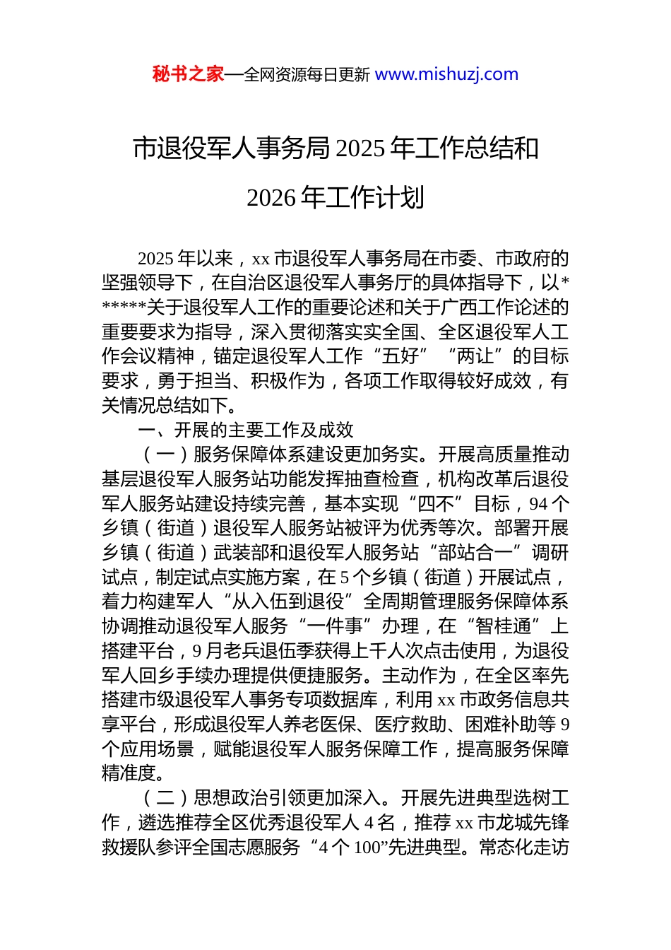秘书之家—全网资源每日更新 www.mishuzj.com市退役军人事务局 2025 年工作总结和2026 年工作计划2025 年以来,xx 市退役军人事务局在市委、市政府的坚强领导下,在自治区退役军人事务厅的具体指导下,以******关于退役军人工作的重要论述和关于广西工作论述的重要要求为指导,深入贯彻落实实全国、全区退役军人工作会议精神,锚定退役军人工作“五好”“两让”的目标要求,勇于担当、积极作为,各项工作取得较好成效,有关情况总结如下。一、开展的主要工作及成效(一)服务保障体系建设更加务实。开展高质量推动基层退役军人服务站功能发挥抽查检查,机构改革后退役军人服务站建设持续完善,基本实现“四不”目标,94 个乡镇(街道)退役军人服务站被评为优秀等次。部署开展乡镇(街道)武装部和退役军人服务站“部站合一”调研试点,制定试点实施方案,在 5 个乡镇(街道)开展试点,着力构建军人“从入伍到退役”全周期管理服务保障体系协调推动退役军人服务“一件事”办理,在“智桂通”上搭建平台,9 月老兵退伍季获得上千人次点击使用,为退役军人回乡手续办理提供便捷服务。主动作为,在全区率先搭建市级退役军人事务专项数据库,利用 xx 市政务信息共享平台,形成退役军人养老医保、医疗救助、困难补助等 9个应用场景,赋能退役军人服务保障工作,提高服务保障精准度。(二)思想政治引领更加深入。开展先进典型选树工作,遴选推荐全区优秀退役军人 4 名,推荐 xx 市龙城先锋救援队参评全国志愿服务“4 个 100”先进典型。常态化走访秘书之家—全网资源每日更新 www.mishuzj.com联系退役军人 1000 余人次,帮扶困难退役军人 8 人,解决退役军人急难愁盼问题 5 个。建强“龙城军号”志愿服务队,加强与司法、律师协会的沟通联系,完成市县(区)退役军人法律服务志愿工作队伍的建设,各级退役军人志愿服务队开展活动 435 场次,服务时长约 4493 小时,参与人员4330 余人次。(三)就业创业帮扶更加全面。严格落实即退即训要求,全额完成年度自主就业退役士兵返乡转岗适应性培训和职业技能培训。协调成立广西退役军人学院 xx 职业技术大学分院,为退役军人提供长效服务和终身学习支持。与xx 职业技术大学、广西柳工机械股份有限公司合作开展“政校企”退役军人职业技能培训合作,打造培训就上岗的培训模式。制定《xx 市促进退役军人高质量充分就业实施方案》,召开招聘会 33 场次,促成退役军人达成就业意向 546 人次,协调市公安局面向退役军人专招辅警 75 人。指导组织 12 家军创企业参加各类博览会,举办退役军人创业培训活动 16 场,帮助 20 余家军创产品入驻线上平台展示销售,激发企业创新活力。举办退役军人金融专项服务活动,与 6 家银行签署战略合作协议,为退役军人争取融资优待政策。(四)安置军休服务更加高效。强力推进退役军人人事档案数字化工作,全市退役军人档案数字化率、管理系统安装培训率均达 100%,档案管理利用更加规范。严格执行安置流程,圆满完成年度转业军官、政府安排工作退役士兵、逐月领取退役金退役军人和军休干部及伤残士兵的移交安置任务,安置率 100%。扎实推进军休服务管理机构标准化建设,3 个军休机构 1 个被自治区评为“五星级”2个被评为“四星级”。举办“第七届军休文化季”活动,承办全区退役军人艺术巡展活动,组织两支队伍参加自治区军休干部门球邀请赛,丰富军休干部文体生活。开展军休养老社会化研究,出台《xx 市军休养老服务社会化工作秘书之家—全网资源每日更新 www.mishuzj.com实施方案》,与医疗、养老、餐饮等机构签订养老服务协议。配合做好全区军休经费审计工作,并抓好反馈问题整改落实。(五)优待褒扬落实更加暖心。及时足额审核发放抚恤生活补助金、义务兵家庭优待金、病故军人遗属一次性抚恤金等各类优抚资金 xx 亿余元,做到无差错、无漏发。按时审核上报退役军人及三属优待证信息、抚恤生活补助金人员信、“两参”人员身份认定材料 3700 余份,做到严格规范、实事求是。常态做好八一、春节走访慰问各类优抚对象工作,共慰问 6314 人,使用...