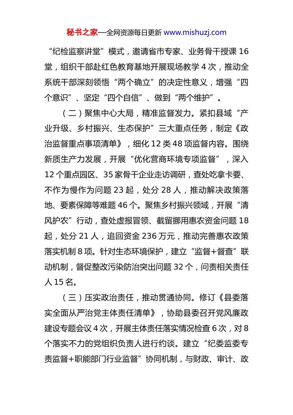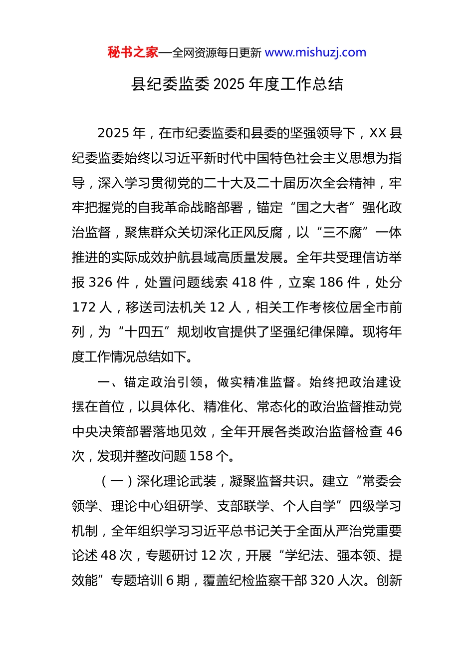秘书之家—全网资源每日更新 www.mishuzj.com县纪委监委 2025 年度工作总结 2025 年,在市纪委监委和县委的坚强领导下,XX 县纪委监委始终以习近平新时代中国特色社会主义思想为指导,深入学习贯彻党的二十大及二十届历次全会精神,牢牢把握党的自我革命战略部署,锚定“国之大者”强化政治监督,聚焦群众关切深化正风反腐,以“三不腐”一体推进的实际成效护航县域高质量发展。全年共受理信访举报 326 件,处置问题线索 418 件,立案 186 件,处分172 人,移送司法机关 12 人,相关工作考核位居全市前列,为“十四五”规划收官提供了坚强纪律保障。现将年度工作情况总结如下。一、锚定政治引领,做实精准监督。始终把政治建设摆在首位,以具体化、精准化、常态化的政治监督推动党中央决策部署落地见效,全年开展各类政治监督检查 46次,发现并整改问题 158 个。(一)深化理论武装,凝聚监督共识。建立“常委会领学、理论中心组研学、支部联学、个人自学”四级学习机制,全年组织学习习近平总书记关于全面从严治党重要论述 48 次,专题研讨 12 次,开展“学纪法、强本领、提效能”专题培训 6 期,覆盖纪检监察干部 320 人次。创新秘书之家—全网资源每日更新 www.mishuzj.com“纪检监察讲堂”模式,邀请省市专家、业务骨干授课 16堂,组织干部赴红色教育基地开展现场教学 4 次,推动全系统干部深刻领悟“两个确立”的决定性意义,增强“四个意识”、坚定“四个自信”、做到“两个维护”。(二)聚焦中心大局,精准监督发力。紧扣县域“产业升级、乡村振兴、生态保护”三大重点任务,制定《政治监督重点事项清单》,细化 12 类 48 项监督内容。围绕新质生产力发展,开展“优化营商环境专项监督”,深入12 个重点园区、35 家骨干企业走访调研,查处吃拿卡要、不作为慢作为问题 23 起,处分 28 人,推动解决政策落地、要素保障等难题 46 个。聚焦乡村振兴领域,开展“清风护农”行动,查处虚报冒领、截留挪用惠农资金问题 18起,处分 21 人,追回资金 236 万元,推动完善惠农政策落实机制 8 项。针对生态环境保护,建立“监督+督查”联动机制,督促整改污染防治突出问题 32 个,问责相关责任人 15 名。(三)压实政治责任,推动贯通协同。修订《县委落实全面从严治党主体责任清单》,协助县委召开党风廉政建设专题会议 4 次,开展主体责任落实情况检查 6 次,对 8个落实不力的党组织负责人进行约谈。建立“纪委监委专责监督+职能部门行业监督”协同机制,与财政、审计、政秘书之家—全网资源每日更新 www.mishuzj.com法等部门建立线索移送、成果共享机制,全年接收移送线索 68 件,联合开展专项检查 12 次。创新“清单化+责任制”监督模式,对 12 个乡镇(街道)和 45 个县直单位党组织开展“政治体检”,形成问题清单 126 份,推动整改完成率达 98%。二、深化正风肃纪,净化政治生态。始终坚持严的主基调不动摇,以钉钉子精神纠治“四风”顽疾,大力弘扬新风正气,全年开展作风建设专项整治 8 次,查处作风问题 76 起,处分 82 人,推动党风政风持续向好。(一)严抓纪律规定精神落实。开展“四风”问题专项整治“回头看”,聚焦违规吃喝、收送礼品礼金等突出问题,采取“四不两直”方式开展明察暗访 32 次,查处违规吃喝问题 15 起,处分 18 人;查处违规发放津补贴问题12 起,处分 15 人。创新“大数据+监督”模式,依托税务、公务消费平台筛查可疑线索 48 条,查实 23 条,挽回损失 156 万元。建立“风腐同查”工作机制,在查处作风问题中深挖背后腐败线索,发现并查处腐败案件 8 起,形成有力震慑。(二)深化纠治形式主义官僚主义。开展“基层减负专项行动”,督促精简会议 35%、文件 28%,清理规范报表台账 42 项。聚焦“指尖上的形式主义”,清理规范政务秘书之家—全网资源每日更新 www.mishuzj.comAPP、微信工作群 23 个。针对群众反映强烈的推诿扯皮、效率低下问题,开展“效能提升专项监督”,查处形式主义官僚主义问题 32 起,处分 38 人,通报典型案例 8 ...