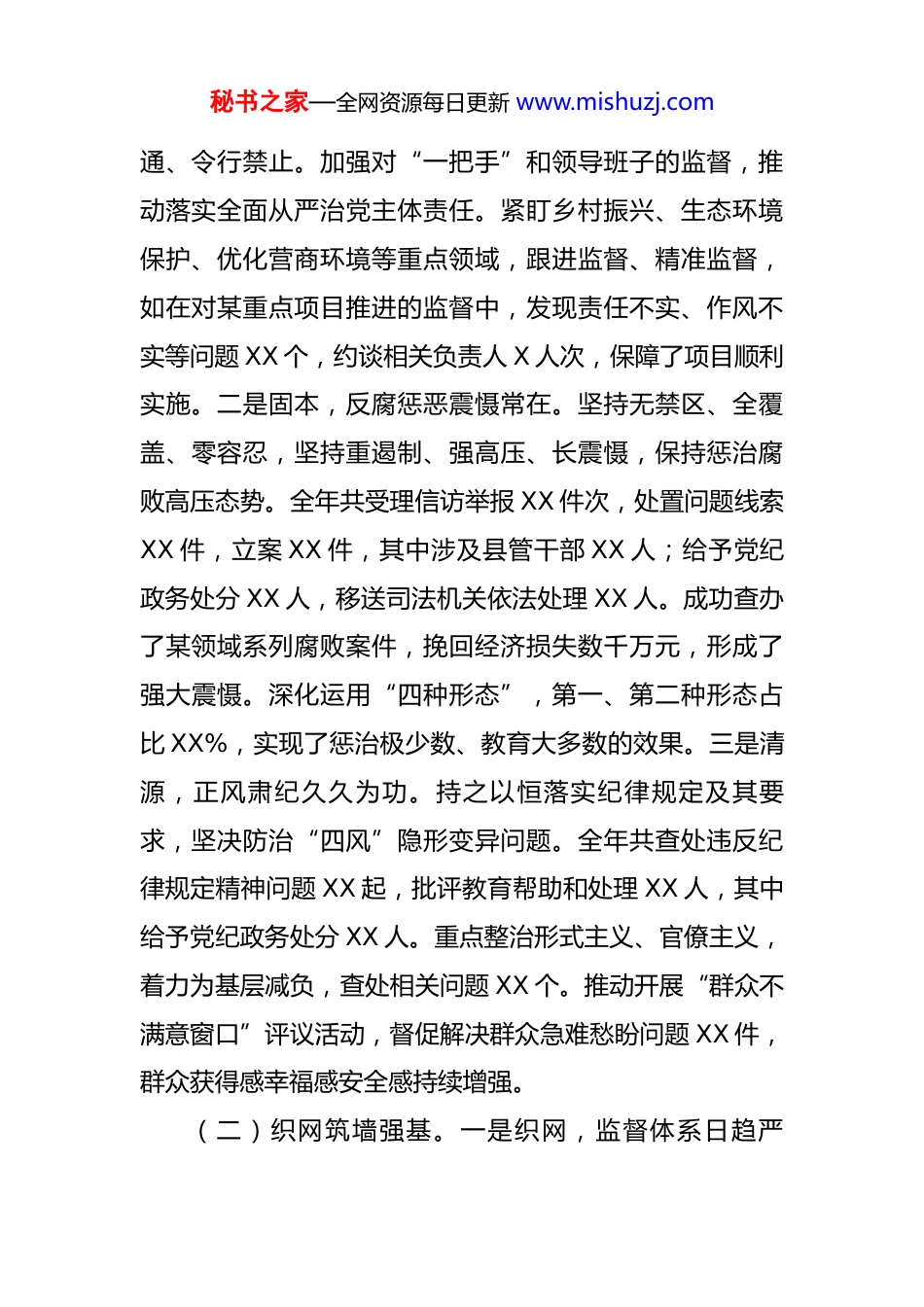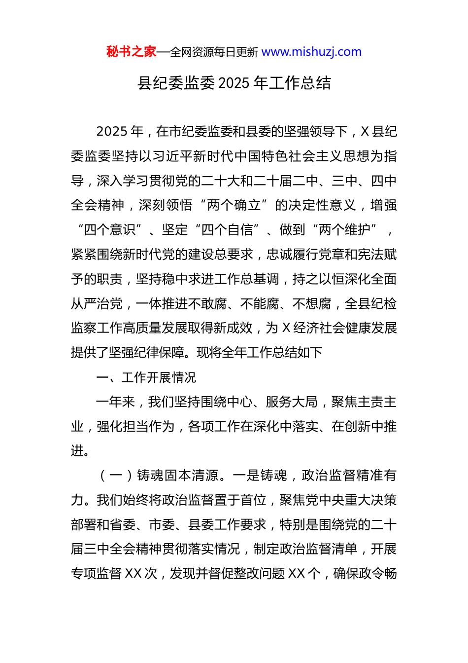 秘书之家—全网资源每日更新 www.mishuzj.com县纪委监委 2025 年工作总结 2025 年,在市纪委监委和县委的坚强领导下,X 县纪委监委坚持以习近平新时代中国特色社会主义思想为指导,深入学习贯彻党的二十大和二十届二中、三中、四中全会精神,深刻领悟“两个确立”的决定性意义,增强“四个意识”、坚定“四个自信”、做到“两个维护”,紧紧围绕新时代党的建设总要求,忠诚履行党章和宪法赋予的职责,坚持稳中求进工作总基调,持之以恒深化全面从严治党,一体推进不敢腐、不能腐、不想腐,全县纪检监察工作高质量发展取得新成效,为 X 经济社会健康发展提供了坚强纪律保障。现将全年工作总结如下 一、工作开展情况一年来,我们坚持围绕中心、服务大局,聚焦主责主业,强化担当作为,各项工作在深化中落实、在创新中推进。(一)铸魂固本清源。一是铸魂,政治监督精准有力。我们始终将政治监督置于首位,聚焦党中央重大决策部署和省委、市委、县委工作要求,特别是围绕党的二十届三中全会精神贯彻落实情况,制定政治监督清单,开展专项监督 XX 次,发现并督促整改问题 XX 个,确保政令畅秘书之家—全网资源每日更新 www.mishuzj.com通、令行禁止。加强对“一把手”和领导班子的监督,推动落实全面从严治党主体责任。紧盯乡村振兴、生态环境保护、优化营商环境等重点领域,跟进监督、精准监督,如在对某重点项目推进的监督中,发现责任不实、作风不实等问题 XX 个,约谈相关负责人 X 人次,保障了项目顺利实施。二是固本,反腐惩恶震慑常在。坚持无禁区、全覆盖、零容忍,坚持重遏制、强高压、长震慑,保持惩治腐败高压态势。全年共受理信访举报 XX 件次,处置问题线索XX 件,立案 XX 件,其中涉及县管干部 XX 人;给予党纪政务处分 XX 人,移送司法机关依法处理 XX 人。成功查办了某领域系列腐败案件,挽回经济损失数千万元,形成了强大震慑。深化运用“四种形态”,第一、第二种形态占比 XX%,实现了惩治极少数、教育大多数的效果。三是清源,正风肃纪久久为功。持之以恒落实纪律规定及其要求,坚决防治“四风”隐形变异问题。全年共查处违反纪律规定精神问题 XX 起,批评教育帮助和处理 XX 人,其中给予党纪政务处分 XX 人。重点整治形式主义、官僚主义,着力为基层减负,查处相关问题 XX 个。推动开展“群众不满意窗口”评议活动,督促解决群众急难愁盼问题 XX 件,群众获得感幸福感安全感持续增强。(二)织网筑墙强基。一是织网,监督体系日趋严秘书之家—全网资源每日更新 www.mishuzj.com密。推动纪律监督、监察监督、派驻监督、巡察监督统筹衔接,促进党内监督与其他各类监督贯通协调。整合基层监督力量,建立“室组地”联动监督、联合办案机制,有效解决了基层监督力量薄弱、熟人社会监督难等问题。二是筑墙,制度笼子扎紧筑牢。做深做实查办案件“后半篇文章”,针对案件暴露出的问题,向相关单位发出纪检监察建议书 XX 份,督促完善制度机制 XX 项。加强廉洁文化建设,承办廉洁文化活动,开展党纪党规知识竞赛、廉政书画展、家庭助廉等活动,拍摄警示教育片《XXX》,编印廉洁家风读本,营造崇廉尚洁浓厚氛围。三是强基,办案安全万无一失。牢固树立“无安全不办案”的生命线意识,参照 XX 县经验,深入开展办案安全专项整治。成立领导小组,制定实施方案,压实“五级责任”;严格落实安全首 课 制度 ,组织 学习 培训 XX 次, 知识测试合格率100%;聚焦“走读式”谈话等关键环节,实行全流程风险管控,全年开展“走读式”谈话 XX 余人次,实现安全“零事故”。强化内部监管,完善《纪检监察干部“八小时以外”监督措施》等内控制度,坚决防止“灯下黑”。(三)提能增效铸铁。一是提能,队伍素质稳步提升。将政治建设摆在首位,坚持“第一议题”制度,不断提高干部政治判断力、政治领悟力、政治执行力。实施干秘书之家—全网资源每日更新 www.mishuzj.com部能力提升计划,全年举办各类业务培训班 XX 期,培训干部 XX 人次,选派 XX 名干部参与上级调训或重大案件查办,实战能力得到锻炼。二是增效,改...