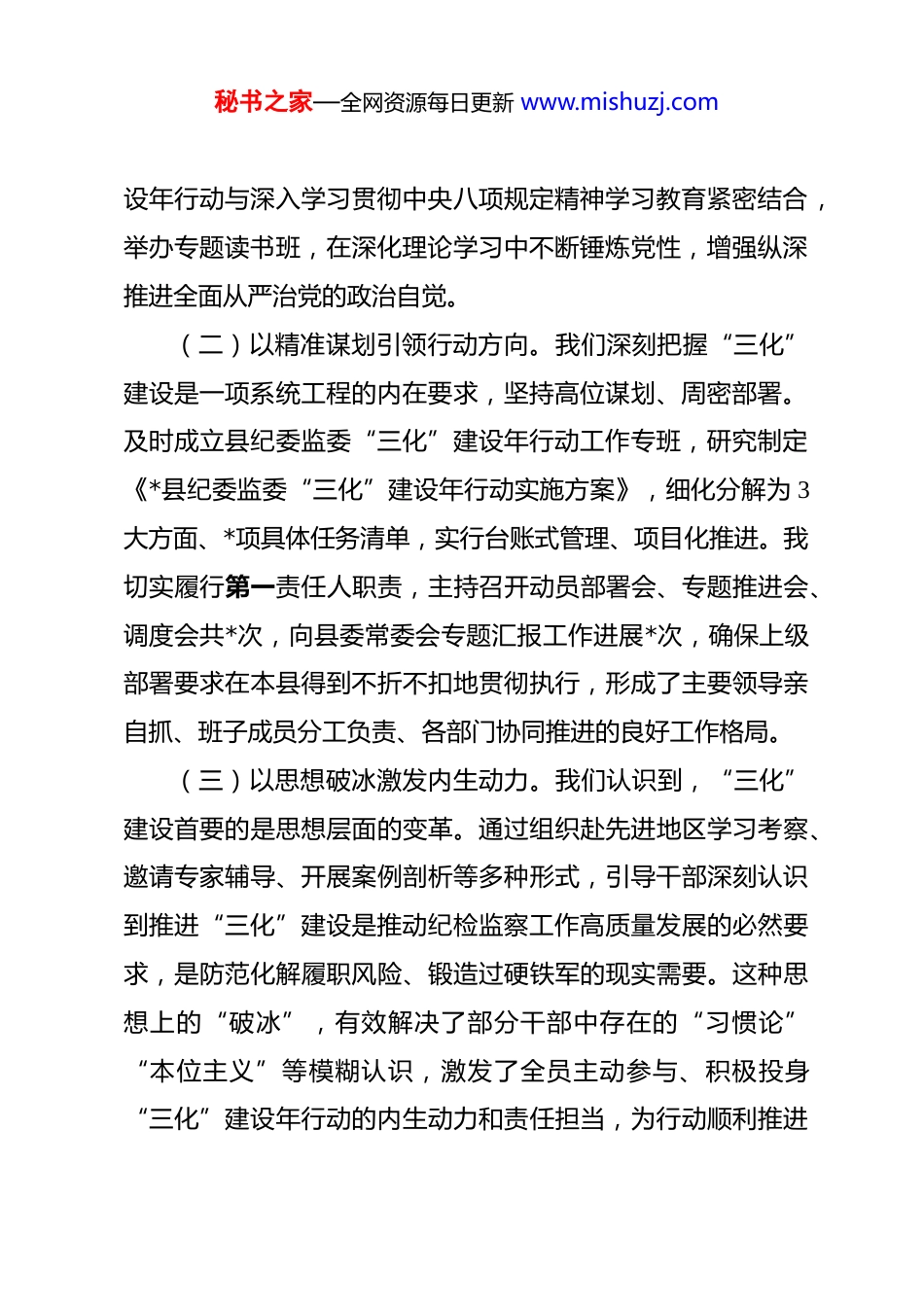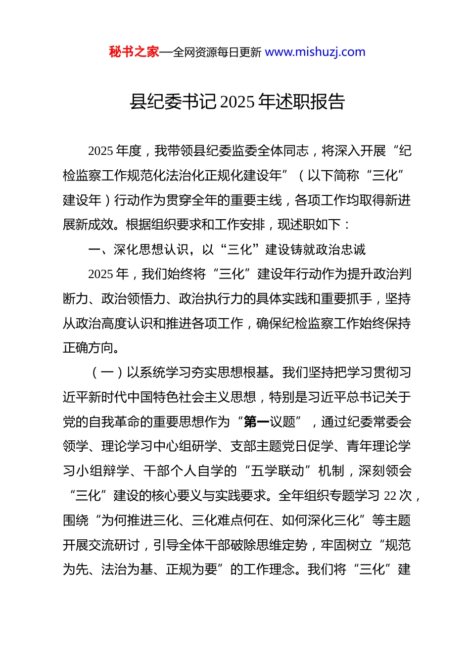 秘书之家—全网资源每日更新 www.mishuzj.com县纪委书记 2025 年述职报告 2025 年度,我带领县纪委监委全体同志,将深入开展“纪检监察工作规范化法治化正规化建设年”(以下简称“三化”建设年)行动作为贯穿全年的重要主线,各项工作均取得新进展新成效。根据组织要求和工作安排,现述职如下:一、深化思想认识,以“三化”建设铸就政治忠诚2025 年,我们始终将“三化”建设年行动作为提升政治判断力、政治领悟力、政治执行力的具体实践和重要抓手,坚持从政治高度认识和推进各项工作,确保纪检监察工作始终保持正确方向。(一)以系统学习夯实思想根基。我们坚持把学习贯彻习近平新时代中国特色社会主义思想,特别是习近平总书记关于党的自我革命的重要思想作为“第一议题”,通过纪委常委会领学、理论学习中心组研学、支部主题党日促学、青年理论学习小组辩学、干部个人自学的“五学联动”机制,深刻领会“三化”建设的核心要义与实践要求。全年组织专题学习 22 次,围绕“为何推进三化、三化难点何在、如何深化三化”等主题开展交流研讨,引导全体干部破除思维定势,牢固树立“规范为先、法治为基、正规为要”的工作理念。我们将“三化”建秘书之家—全网资源每日更新 www.mishuzj.com设年行动与深入学习贯彻中央八项规定精神学习教育紧密结合,举办专题读书班,在深化理论学习中不断锤炼党性,增强纵深推进全面从严治党的政治自觉。(二)以精准谋划引领行动方向。我们深刻把握“三化”建设是一项系统工程的内在要求,坚持高位谋划、周密部署。及时成立县纪委监委“三化”建设年行动工作专班,研究制定《*县纪委监委“三化”建设年行动实施方案》,细化分解为 3大方面、*项具体任务清单,实行台账式管理、项目化推进。我切实履行第一责任人职责,主持召开动员部署会、专题推进会、调度会共*次,向县委常委会专题汇报工作进展*次,确保上级部署要求在本县得到不折不扣地贯彻执行,形成了主要领导亲自抓、班子成员分工负责、各部门协同推进的良好工作格局。(三)以思想破冰激发内生动力。我们认识到,“三化”建设首要的是思想层面的变革。通过组织赴先进地区学习考察、邀请专家辅导、开展案例剖析等多种形式,引导干部深刻认识到推进“三化”建设是推动纪检监察工作高质量发展的必然要求,是防范化解履职风险、锻造过硬铁军的现实需要。这种思想上的“破冰”,有效解决了部分干部中存在的“习惯论”“本位主义”等模糊认识,激发了全员主动参与、积极投身“三化”建设年行动的内生动力和责任担当,为行动顺利推进秘书之家—全网资源每日更新 www.mishuzj.com奠定了坚实的思想基础。二、聚焦主责主业,以“三化”标准提升履职效能我们坚持将“三化”建设要求贯穿监督执纪执法全过程、各环节,以工作实效检验“三化”建设成果,努力实现高质量发展。(一)提升办案质效,彰显规范法治力量。我们将提升依规依纪依法办案水平作为“三化”建设的重中之重。一是优化办案流程。全面梳理并规范问题线索受理、初步核实、审查调查、案件审理等各环节工作流程,明确权限、时限和标准,为一线办案提供清晰指引。二是强化质量评查。建立健全案件质量常态化评查机制,采取日常评查、定期全面评查、重点领域专项评查相结合的方式,全年共评查案件 115 件,形成“问题清单”和“整改清单”,限时整改、对账销号,实现对案件质量的常态“把脉”和全面“体检”。三是深化以案促治。坚持“一案一剖析”“一案一反馈”,针对案件暴露出的问题,及时下发纪检监察建议书*份,并开展整改落实情况“回头看”,推动完善制度机制*项,努力实现“查处一案、警示一片、治理一域”的综合效果。全年共处置问题线索*件,立案*件,给予党纪政务处分*人,移送司法机关审查起诉*人,案件质量显著提升。秘书之家—全网资源每日更新 www.mishuzj.com(二)强化政治监督,保障决策部署落实。我们聚焦党中央重大决策部署和省委、市委、县委重点工作要求,将“三化”理念融入政治监督具体实践。围绕乡村振兴、生态环保、营商环境、安全生产等领域,制定年度政治监督清单,运用“室组地”联动监督、“组...