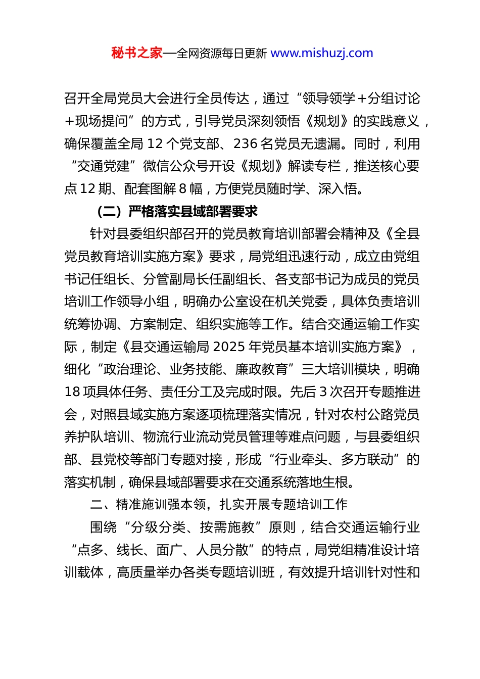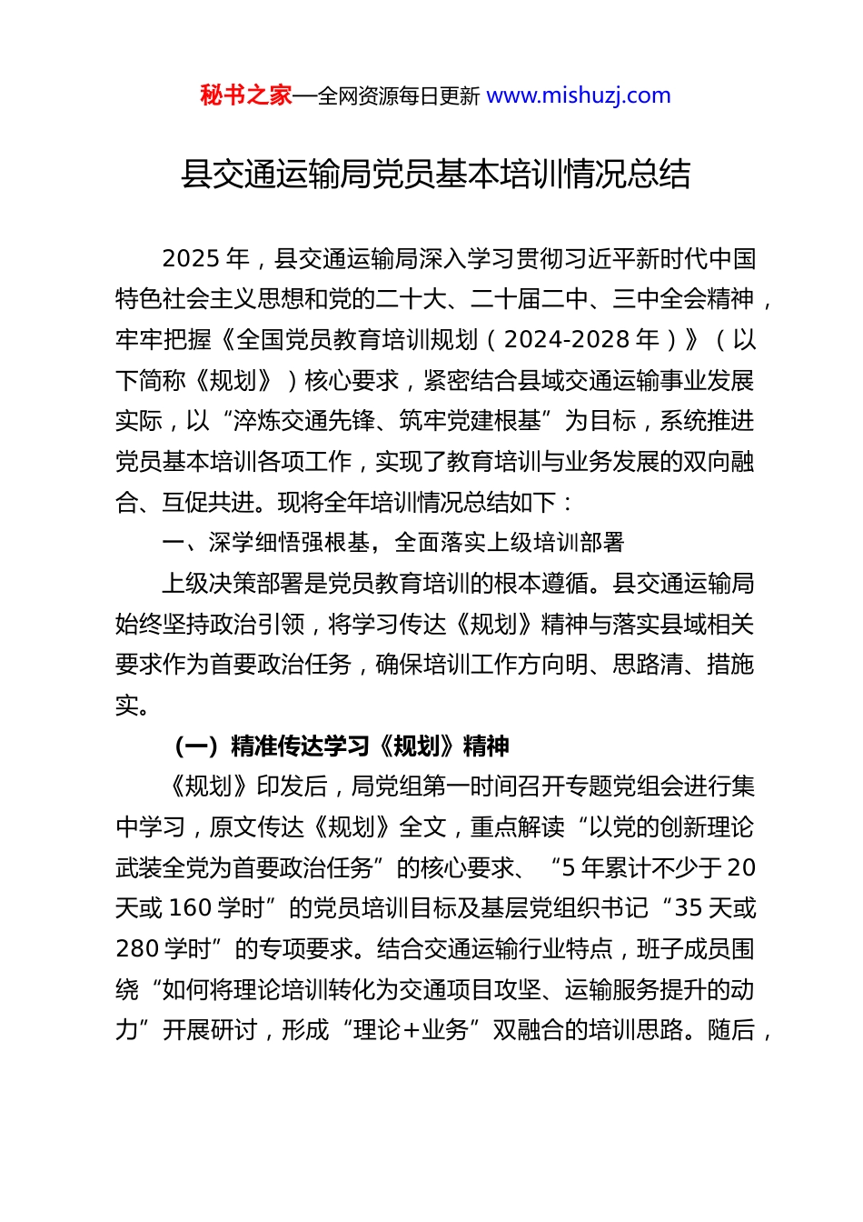 秘书之家—全网资源每日更新 www.mishuzj.com县交通运输局党员基本培训情况总结2025 年,县交通运输局深入学习贯彻习近平新时代中国特色社会主义思想和党的二十大、二十届二中、三中全会精神,牢牢把握《全国党员教育培训规划(2024-2028 年)》(以下简称《规划》)核心要求,紧密结合县域交通运输事业发展实际,以“淬炼交通先锋、筑牢党建根基”为目标,系统推进党员基本培训各项工作,实现了教育培训与业务发展的双向融合、互促共进。现将全年培训情况总结如下:一、深学细悟强根基,全面落实上级培训部署上级决策部署是党员教育培训的根本遵循。县交通运输局始终坚持政治引领,将学习传达《规划》精神与落实县域相关要求作为首要政治任务,确保培训工作方向明、思路清、措施实。(一)精准传达学习《规划》精神《规划》印发后,局党组第一时间召开专题党组会进行集中学习,原文传达《规划》全文,重点解读“以党的创新理论武装全党为首要政治任务”的核心要求、“5 年累计不少于 20天或 160 学时”的党员培训目标及基层党组织书记“35 天或280 学时”的专项要求。结合交通运输行业特点,班子成员围绕“如何将理论培训转化为交通项目攻坚、运输服务提升的动力”开展研讨,形成“理论+业务”双融合的培训思路。随后,秘书之家—全网资源每日更新 www.mishuzj.com召开全局党员大会进行全员传达,通过“领导领学+分组讨论+现场提问”的方式,引导党员深刻领悟《规划》的实践意义,确保覆盖全局 12 个党支部、236 名党员无遗漏。同时,利用“交通党建”微信公众号开设《规划》解读专栏,推送核心要点 12 期、配套图解 8 幅,方便党员随时学、深入悟。(二)严格落实县域部署要求针对县委组织部召开的党员教育培训部署会精神及《全县党员教育培训实施方案》要求,局党组迅速行动,成立由党组书记任组长、分管副局长任副组长、各支部书记为成员的党员培训工作领导小组,明确办公室设在机关党委,具体负责培训统筹协调、方案制定、组织实施等工作。结合交通运输工作实际,制定《县交通运输局 2025 年党员基本培训实施方案》,细化“政治理论、业务技能、廉政教育”三大培训模块,明确18 项具体任务、责任分工及完成时限。先后 3 次召开专题推进会,对照县域实施方案逐项梳理落实情况,针对农村公路党员养护队培训、物流行业流动党员管理等难点问题,与县委组织部、县党校等部门专题对接,形成“行业牵头、多方联动”的落实机制,确保县域部署要求在交通系统落地生根。二、精准施训强本领,扎实开展专题培训工作围绕“分级分类、按需施教”原则,结合交通运输行业“点多、线长、面广、人员分散”的特点,局党组精准设计培训载体,高质量举办各类专题培训班,有效提升培训针对性和秘书之家—全网资源每日更新 www.mishuzj.com实效性。(一)聚焦“关键少数”,举办党组织书记专题班以“提升政治领导力、组织凝聚力、发展推动力”为目标于 4 月和 10 月分两期举办党组织书记专题培训班,全局 12 名党支部书记及 2 名新任支部委员全部参训,培训时长累计 8 天64 学时。课程设置紧扣《规划》要求,涵盖“习近平总书记关于党的建设的重要思想”“党支部标准化规范化建设”“交通行业党建与业务融合路径”等核心内容,邀请县委党校副校长、市级交通系统优秀党支部书记授课 4 次,组织赴市交通局“先进基层党组织”观摩学习 2 次,开展“支部书记论坛”3 场,围绕“如何破解工程建设领域党建难题”“流动党员教育管理方法”等主题交流经验、碰撞思路。培训结束后组织闭卷测试,平均成绩达 92 分,确保培训成效入脑入心。(二)突出“一线需求”,举办业务骨干强化班针对执法、工程、运输等一线党员业务需求,分领域举办3 类专题强化班。一是交通运输执法党员培训班,于 6 月面向45 名执法一线党员开展为期 5 天的培训,邀请市交通运输综合行政执法支队专家讲解《道路运输条例》《公路安全保护条例》等新规,结合“以案释法”解析超限超载执法、网约车监管等典型案例,组织模拟执法演练 4 场,提升执法规范化水平。二是交通工程建设党员培训...