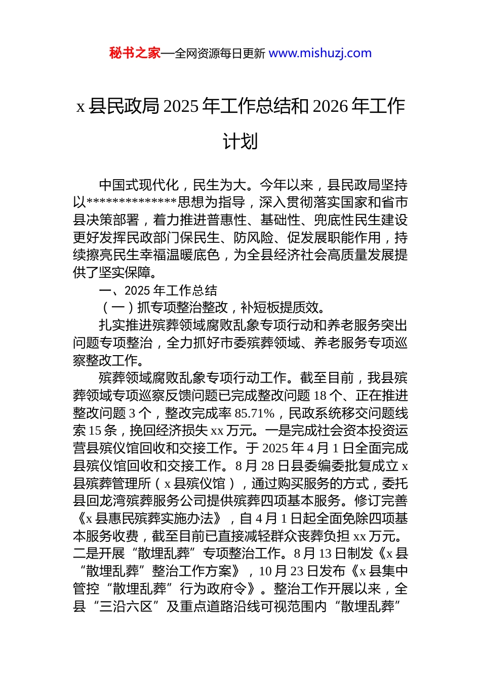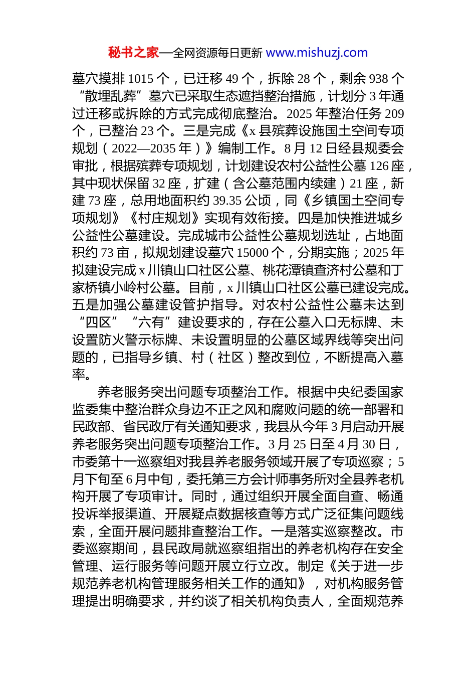 秘书之家—全网资源每日更新 www.mishuzj.comx 县民政局 2025 年工作总结和 2026 年工作计划中国式现代化,民生为大。今年以来,县民政局坚持以**************思想为指导,深入贯彻落实国家和省市县决策部署,着力推进普惠性、基础性、兜底性民生建设更好发挥民政部门保民生、防风险、促发展职能作用,持续擦亮民生幸福温暖底色,为全县经济社会高质量发展提供了坚实保障。一、2025 年工作总结(一)抓专项整治整改,补短板提质效。扎实推进殡葬领域腐败乱象专项行动和养老服务突出问题专项整治,全力抓好市委殡葬领域、养老服务专项巡察整改工作。殡葬领域腐败乱象专项行动工作。截至目前,我县殡葬领域专项巡察反馈问题已完成整改问题 18 个、正在推进整改问题 3 个,整改完成率 85.71%,民政系统移交问题线索 15 条,挽回经济损失 xx 万元。一是完成社会资本投资运营县殡仪馆回收和交接工作。于 2025 年 4 月 1 日全面完成县殡仪馆回收和交接工作。8 月 28 日县委编委批复成立 x县殡葬管理所(x 县殡仪馆),通过购买服务的方式,委托县回龙湾殡葬服务公司提供殡葬四项基本服务。修订完善《x 县惠民殡葬实施办法》,自 4 月 1 日起全面免除四项基本服务收费,截至目前已直接减轻群众丧葬负担 xx 万元。二是开展“散埋乱葬”专项整治工作。8 月 13 日制发《x 县“散埋乱葬”整治工作方案》,10 月 23 日发布《x 县集中管控“散埋乱葬”行为政府令》。整治工作开展以来,全县“三沿六区”及重点道路沿线可视范围内“散埋乱葬”秘书之家—全网资源每日更新 www.mishuzj.com墓穴摸排 1015 个,已迁移 49 个,拆除 28 个,剩余 938 个“散埋乱葬”墓穴已采取生态遮挡整治措施,计划分 3 年通过迁移或拆除的方式完成彻底整治。2025 年整治任务 209个,已整治 23 个。三是完成《x 县殡葬设施国土空间专项规划(2022—2035 年)》编制工作。8 月 12 日经县规委会审批,根据殡葬专项规划,计划建设农村公益性公墓 126 座,其中现状保留 32 座,扩建(含公墓范围内续建)21 座,新建 73 座,总用地面积约 39.35 公顷,同《乡镇国土空间专项规划》《村庄规划》实现有效衔接。四是加快推进城乡公益性公墓建设。完成城市公益性公墓规划选址,占地面积约 73 亩,拟规划建设墓穴 15000 个,分期实施;2025 年拟建设完成 x 川镇山口社区公墓、桃花潭镇查济村公墓和丁家桥镇小岭村公墓。目前,x 川镇山口社区公墓已建设完成。五是加强公墓建设管护指导。对农村公益性公墓未达到“四区”“六有”建设要求的,存在公墓入口无标牌、未设置防火警示标牌、未设置明显的公墓区域界线等突出问题的,已指导乡镇、村(社区)整改到位,不断提高入墓率。养老服务突出问题专项整治工作。根据中央纪委国家监委集中整治群众身边不正之风和腐败问题的统一部署和民政部、省民政厅有关通知要求,我县从今年 3 月启动开展养老服务突出问题专项整治工作。3 月 25 日至 4 月 30 日,市委第十一巡察组对我县养老服务领域开展了专项巡察;5月下旬至 6 月中旬,委托第三方会计师事务所对全县养老机构开展了专项审计。同时,通过组织开展全面自查、畅通投诉举报渠道、开展疑点数据核查等方式广泛征集问题线索,全面开展问题排查整治工作。一是落实巡察整改。市委巡察期间,县民政局就巡察组指出的养老机构存在安全管理、运行服务等问题开展立行立改。制定《关于进一步规范养老机构管理服务相关工作的通知》,对机构服务管理提出明确要求,并约谈了相关机构负责人,全面规范养秘书之家—全网资源每日更新 www.mishuzj.com老机构服务管理。及时研究制定《关于落实五届市委第九轮巡察第十一巡察组反馈意见的整改方案》,针对巡察反馈问题,制定整改措施 50 项。9 月 16 日,组织召开全县养老服务专项巡察整改动员部署会,全面推进整改工作,目前已完成整改措施 20 项。二是开展安全整治。制定印发《全县民政领域消防安全大排查大整治工作方案》,聚焦养老机构检查要点,组织开展摸底排查。通过乡镇机构自查、部门联合检...