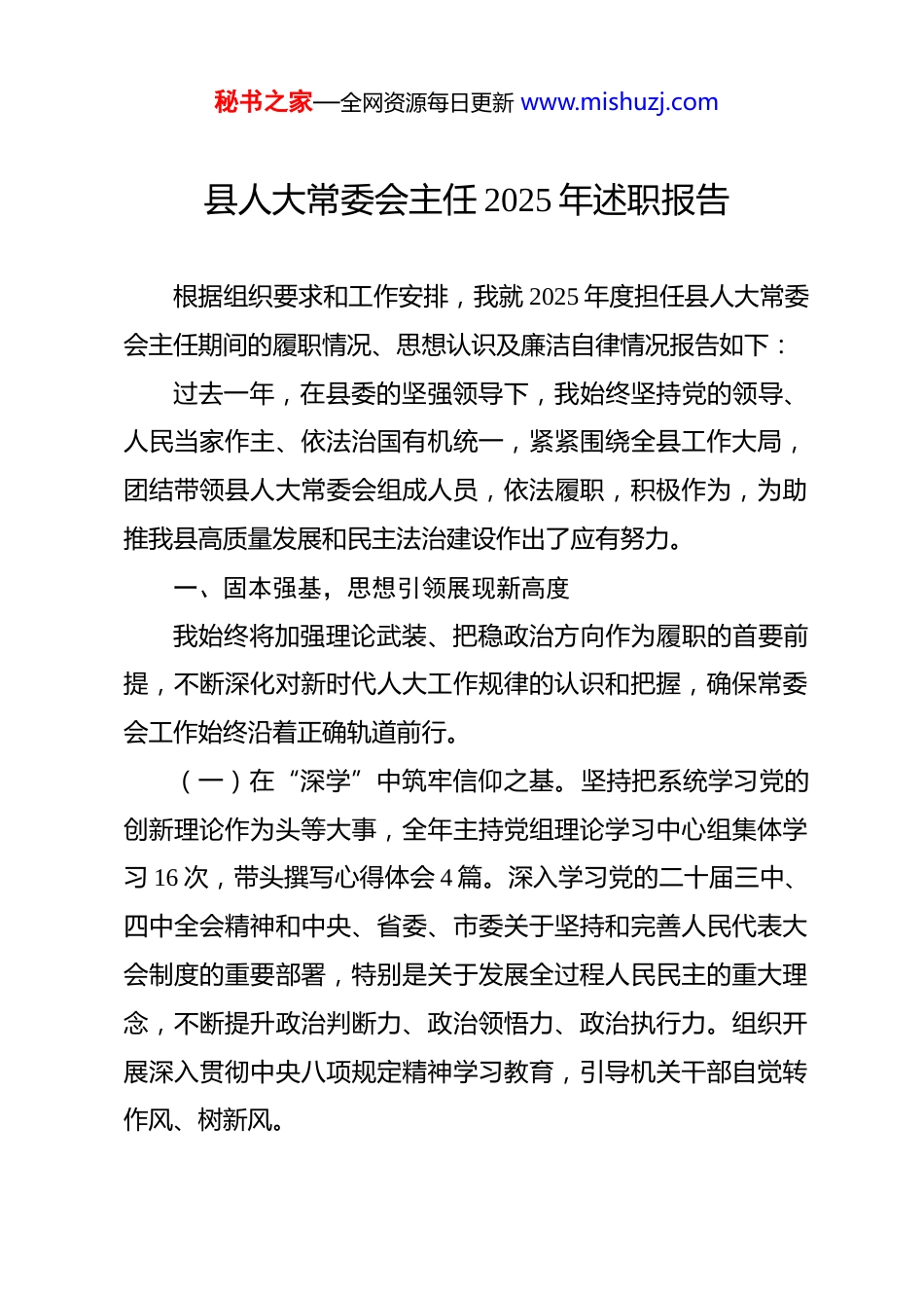 秘书之家—全网资源每日更新 www.mishuzj.com县人大常委会主任 2025 年述职报告 根据组织要求和工作安排,我就 2025 年度担任县人大常委会主任期间的履职情况、思想认识及廉洁自律情况报告如下:过去一年,在县委的坚强领导下,我始终坚持党的领导、人民当家作主、依法治国有机统一,紧紧围绕全县工作大局,团结带领县人大常委会组成人员,依法履职,积极作为,为助推我县高质量发展和民主法治建设作出了应有努力。一、固本强基,思想引领展现新高度我始终将加强理论武装、把稳政治方向作为履职的首要前提,不断深化对新时代人大工作规律的认识和把握,确保常委会工作始终沿着正确轨道前行。(一)在“深学”中筑牢信仰之基。坚持把系统学习党的创新理论作为头等大事,全年主持党组理论学习中心组集体学习 16 次,带头撰写心得体会 4 篇。深入学习党的二十届三中、四中全会精神和中央、省委、市委关于坚持和完善人民代表大会制度的重要部署,特别是关于发展全过程人民民主的重大理念,不断提升政治判断力、政治领悟力、政治执行力。组织开展深入贯彻中央八项规定精神学习教育,引导机关干部自觉转作风、树新风。秘书之家—全网资源每日更新 www.mishuzj.com(二)在“细悟”中把稳方向之舵。深刻领会党中央关于进一步全面深化改革的要求,结合我县实际,牵头研究制定了《县人大常委会关于在深化改革中充分发挥作用的实施意见》。围绕省委“三个年”活动、市委“五区”建设等中心任务,主动将人大工作融入大局思考谋划,确保常委会的各项工作与党委决策部署同频共振、同向发力。主持召开 16 次党组(扩大)会议、8 次常委会会议,及时传达学习上级精神,研究贯彻落实措施。(三)在“实干”中提升履职之能。积极参加上级人大组织的各类培训,同时利用“代表大讲堂”等平台,为县乡人大代表讲授履职知识 2 期。坚持理论联系实际,围绕基层治理、乡村振兴、营商环境等重大课题,牵头开展专题调研 12 次,形成《关于我县乡村产业发展情况的调研报告》等有分量的调研成果 5 篇,为县委决策提供了参考。二、依法履职,服务大局展现新担当我始终坚持“寓支持于监督之中”的理念,依法行使宪法和法律赋予的各项职权,推动解决了一批群众关心、社会关注的重点难点问题。(一)聚焦中心,增强监督实效。紧紧围绕全县高质量发展目标,精选监督议题 11 项。持续跟踪监督“加快农村环境整秘书之家—全网资源每日更新 www.mishuzj.com治助推乡村振兴”“提高 60 岁以上农村老人养老保险待遇”等代表建议的办理,推动 225 件代表意见建议落地见效。听取审议了县政府关于计划预算执行、国有资产管理、法治政府建设等专项工作报告 15 项,提出审议意见 40 余条。对《未成年人保护法》实施情况开展了执法检查,督促相关部门整改问题 8个。(二)优化服务,发挥代表作用。把尊重代表主体地位、充分发挥代表作用作为关键抓手。建成并规范运行代表联络站109 个,实现乡镇(街道)全覆盖,打造“群众常来、代表常在、实事常办”的民主阵地。推广“智慧人大”微信小程序,线上收集代表和群众意见建议超过 6500 条,办结率 92%。坚持邀请代表列席常委会会议,全年达 26 人次,组织代表参与视察调研、执法检查等活动 24 人次。举办代表履职能力提升培训班2 期,培训代表 137 人次。(三)夯实基础,推进民主实践。积极践行全过程人民民主理念,指导乡镇人大普遍推行民生实事项目代表票决制,形成了“群众提、代表定、政府办、人大评”的良好机制。全年通过票决确定的 58 个乡镇级民生实事项目,*的农产品仓储中心、移民健身广场等,均已完成,群众满意度高。坚持和完善公民旁听常委会会议制度,拓宽民意表达渠道。指导开展“人秘书之家—全网资源每日更新 www.mishuzj.com大代表向选区选民述职”活动 52 场次,直接听取选民意见,接受选民监督。(四)依法任免,规范权力运行。坚持党管干部原则与人大依法行使任免权相统一。全年共依法任免国家机关工作人员164 人次,其中任职 132 人次,免职 32 人次。严格执行任前法律知识考试和宪法宣誓制度,组织...