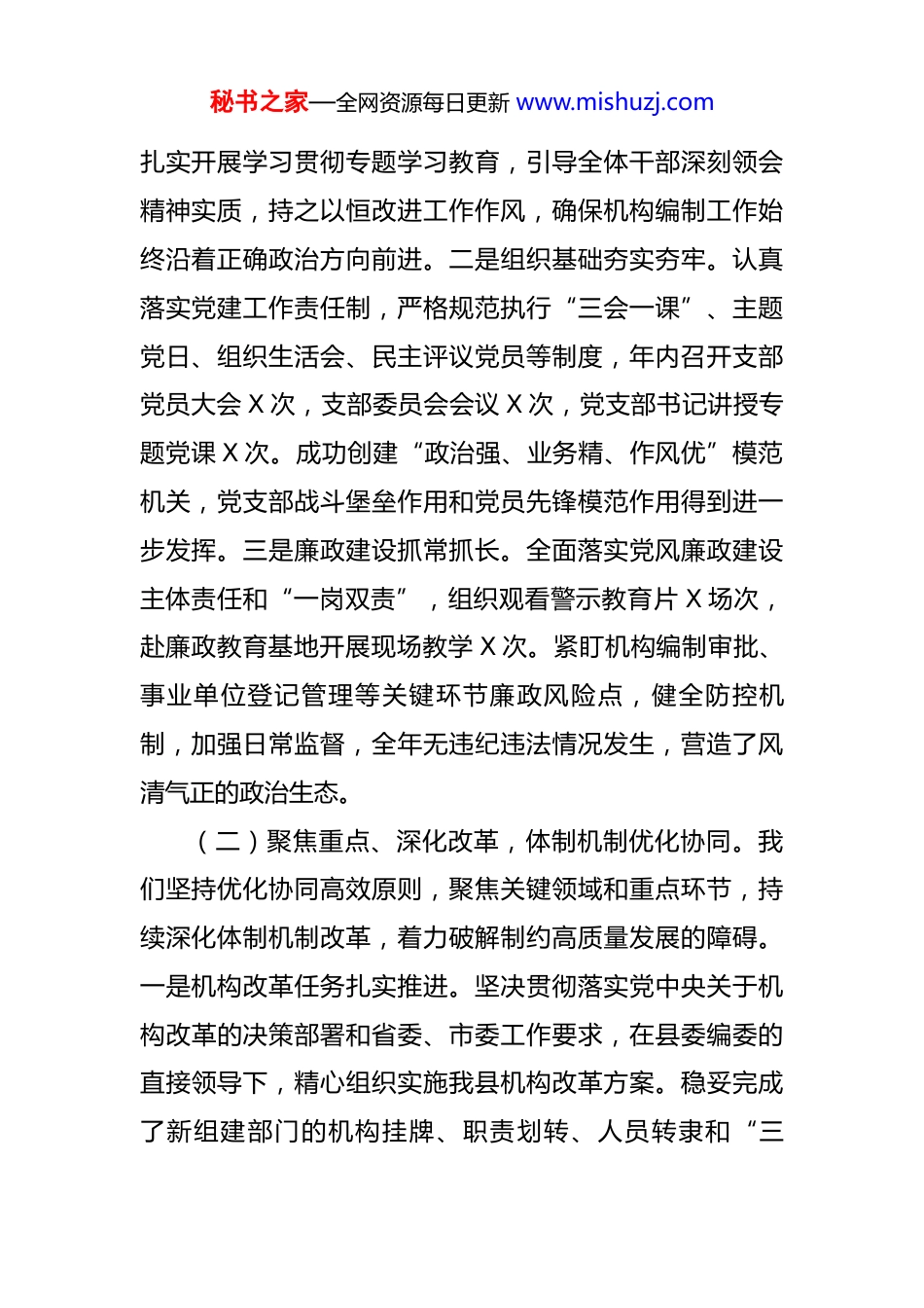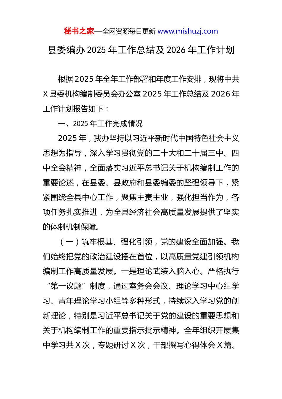 秘书之家—全网资源每日更新 www.mishuzj.com县委编办 2025 年工作总结及 2026 年工作计划 根据 2025 年全年工作部署和年度工作安排,现将中共X 县委机构编制委员会办公室 2025 年工作总结及 2026 年工作计划报告如下:一、2025 年工作完成情况2025 年,我办坚持以习近平新时代中国特色社会主义思想为指导,深入学习贯彻党的二十大和二十届三中、四中全会精神,全面落实习近平总书记关于机构编制工作的重要论述,在县委、县政府和县委编委的坚强领导下,紧紧围绕全县中心工作,聚焦主责主业,强化担当作为,各项任务扎实推进,为全县经济社会高质量发展提供了坚实的体制机制保障。(一)筑牢根基、强化引领,党的建设全面加强。我们始终把党的政治建设摆在首位,以高质量党建引领机构编制工作高质量发展。一是理论武装入脑入心。严格执行“第一议题”制度,通过室务会会议、理论学习中心组学习、青年理论学习小组等多种形式,持续深入学习党的创新理论,特别是习近平总书记关于党的建设的重要思想和关于机构编制工作的重要指示批示精神。全年组织开展集中学习共 X 次,专题研讨 X 次,干部撰写心得体会 X 篇。秘书之家—全网资源每日更新 www.mishuzj.com扎实开展学习贯彻专题学习教育,引导全体干部深刻领会精神实质,持之以恒改进工作作风,确保机构编制工作始终沿着正确政治方向前进。二是组织基础夯实夯牢。认真落实党建工作责任制,严格规范执行“三会一课”、主题党日、组织生活会、民主评议党员等制度,年内召开支部党员大会 X 次,支部委员会会议 X 次,党支部书记讲授专题党课 X 次。成功创建“政治强、业务精、作风优”模范机关,党支部战斗堡垒作用和党员先锋模范作用得到进一步发挥。三是廉政建设抓常抓长。全面落实党风廉政建设主体责任和“一岗双责”,组织观看警示教育片 X 场次,赴廉政教育基地开展现场教学 X 次。紧盯机构编制审批、事业单位登记管理等关键环节廉政风险点,健全防控机制,加强日常监督,全年无违纪违法情况发生,营造了风清气正的政治生态。(二)聚焦重点、深化改革,体制机制优化协同。我们坚持优化协同高效原则,聚焦关键领域和重点环节,持续深化体制机制改革,着力破解制约高质量发展的障碍。一是机构改革任务扎实推进。坚决贯彻落实党中央关于机构改革的决策部署和省委、市委工作要求,在县委编委的直接领导下,精心组织实施我县机构改革方案。稳妥完成了新组建部门的机构挂牌、职责划转、人员转隶和“三秘书之家—全网资源每日更新 www.mishuzj.com定”规定制定工作,确保了新机构迅速进入角色、高效有序运行。大幅精简规范县级议事协调机构,由原有的 139个精简至 20 个,精简比例达 86%,有效提升了议事协调效率。二是行政执法体制持续完善。深入推进应急管理、市场监管、文化市场、交通运输、农业等五个领域综合行政执法改革成果巩固提升工作。进一步理顺县乡两级执法职责关系,推动执法力量下沉。指导镇街综合执法办公室规范化运行,完善“县乡联动、属地管理、条块结合”的执法协作机制,基层治理能力得到增强。三是基层基础建设不断夯实。坚持大抓基层的鲜明导向,优化镇街机构设置,全面推行“5 办 2 中心 1 队”模式(即党政办公室、党建工作办公室、经济发展办公室、社会事务办公室、平安建设办公室;便民服务中心、农业综合服务中心;综合行政执法队),进一步整合资源、优化职能。印发了《X 县乡镇(街道)职责准入实施办法》,严格落实“权随事转、人随事走、费随事转”,推动资源、服务、管理真正下沉到基层,为基层扩权赋能,激发了基层活力。四是权责清单管理动态优化。按照“法定职责必须为、法无授权不可为”的原则,动态调整和完善县政府部门权责清单。年内,会同县司法局等部门,对 X 个部门的 X 项权责事项进行了规范调整(其中取消 X 项,新增 X 项,变更 X 项)。秘书之家—全网资源每日更新 www.mishuzj.com同步推进乡镇(街道)属地管理事项责任清单动态调整,积极探索“一镇街一清单”的精准赋权模式,目前已与部分镇街签订执法事项赋权确认书,下放执法...