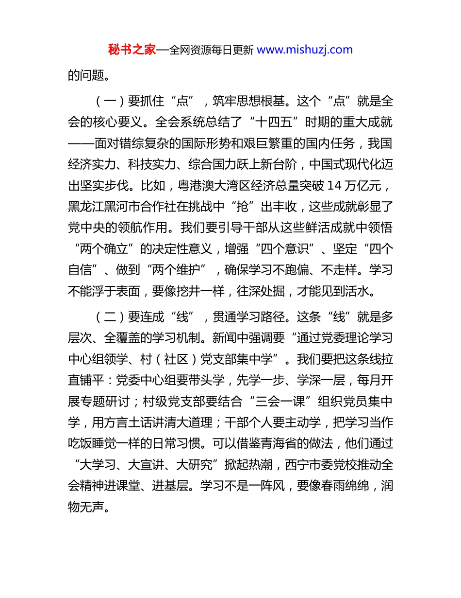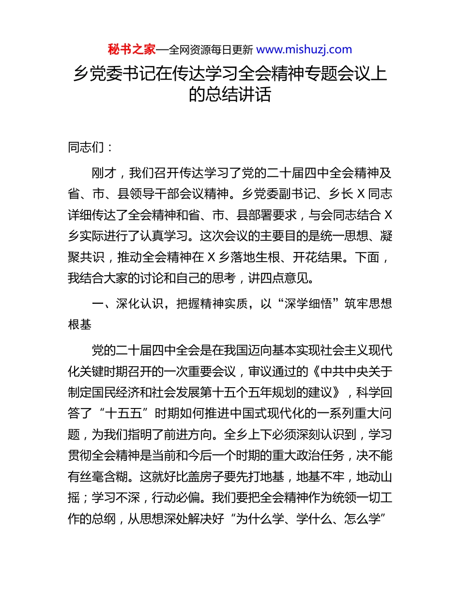 秘书之家—全网资源每日更新 www.mishuzj.com乡党委书记在传达学习全会精神专题会议上的总结讲话同志们:刚才,我们召开传达学习了党的二十届四中全会精神及省、市、县领导干部会议精神。乡党委副书记、乡长 X 同志详细传达了全会精神和省、市、县部署要求,与会同志结合 X乡实际进行了认真学习。这次会议的主要目的是统一思想、凝聚共识,推动全会精神在 X 乡落地生根、开花结果。下面,我结合大家的讨论和自己的思考,讲四点意见。一、深化认识,把握精神实质,以“深学细悟”筑牢思想根基党的二十届四中全会是在我国迈向基本实现社会主义现代化关键时期召开的一次重要会议,审议通过的《中共中央关于制定国民经济和社会发展第十五个五年规划的建议》,科学回答了“十五五”时期如何推进中国式现代化的一系列重大问题,为我们指明了前进方向。全乡上下必须深刻认识到,学习贯彻全会精神是当前和今后一个时期的重大政治任务,决不能有丝毫含糊。这就好比盖房子要先打地基,地基不牢,地动山摇;学习不深,行动必偏。我们要把全会精神作为统领一切工作的总纲,从思想深处解决好“为什么学、学什么、怎么学”秘书之家—全网资源每日更新 www.mishuzj.com的问题。(一)要抓住“点”,筑牢思想根基。这个“点”就是全会的核心要义。全会系统总结了“十四五”时期的重大成就——面对错综复杂的国际形势和艰巨繁重的国内任务,我国经济实力、科技实力、综合国力跃上新台阶,中国式现代化迈出坚实步伐。比如,粤港澳大湾区经济总量突破 14 万亿元,黑龙江黑河市合作社在挑战中“抢”出丰收,这些成就彰显了党中央的领航作用。我们要引导干部从这些鲜活成就中领悟“两个确立”的决定性意义,增强“四个意识”、坚定“四个自信”、做到“两个维护”,确保学习不跑偏、不走样。学习不能浮于表面,要像挖井一样,往深处掘,才能见到活水。(二)要连成“线”,贯通学习路径。这条“线”就是多层次、全覆盖的学习机制。新闻中强调要“通过党委理论学习中心组领学、村(社区)党支部集中学”。我们要把这条线拉直铺平:党委中心组要带头学,先学一步、学深一层,每月开展专题研讨;村级党支部要结合“三会一课”组织党员集中学,用方言土话讲清大道理;干部个人要主动学,把学习当作吃饭睡觉一样的日常习惯。可以借鉴青海省的做法,他们通过“大学习、大宣讲、大研究”掀起热潮,西宁市委党校推动全会精神进课堂、进基层。学习不是一阵风,要像春雨绵绵,润物无声。秘书之家—全网资源每日更新 www.mishuzj.com(三)要拓展“面”,覆盖全员参与。这个“面”就是让学习覆盖到每一个干部和群众。全会精神不是少数人的“专利”,而是全体人民的共同财富。我们要发挥“党建+网格”作用,组织乡干部包村、村干部包组、党员包户,送学上门、宣讲到人。新疆生产建设兵团第十师一八五团结合红色文化宣讲全会精神,云南大理松园村驻村书记把精神转化为扎根行动。X 乡也要这样,让田间地头、农家院落都成为学习课堂,确保全会精神像阳光一样洒满每个角落。二、锚定实际,谋划融合发展,以“因地制宜”绘制乡村蓝图全会指出,“十五五”时期是基本实现社会主义现代化夯实基础、全面发力的关键时期。对于 X 乡来说,这五年是承前启后的重要机遇期。我们不能“上下一般粗”地照搬照抄,而要像裁缝做衣服一样,量体裁衣,立足乡情实际。新闻中提出要“锚定实际谋融合”,牢记高质量发展等 7 大目标,落实乡村振兴等 12 项战略任务。这要求我们找准中央精神与乡村实际的结合点,让规划既接天线又接地气。(一)要立足“特色点”,发挥资源禀赋优势。每个地方都有独特的资源,就像每个人都有自己的指纹。X 乡有山水生态、农业基础等特色,我们要围绕“特色优势”做文章:比如,发展绿色有机农业,借鉴吉林梨树县黑土地保护的经验,秘书之家—全网资源每日更新 www.mishuzj.com提升农业综合生产能力;培育乡村旅游,像四川三星堆那样以文化赋能消费生态;招引契合本地实际的产业项目,避免“捡到篮子都是菜”。资源用好了,黄土能变金;用不好,金山也会变废铁。(二)要拉长“产业链”,推...