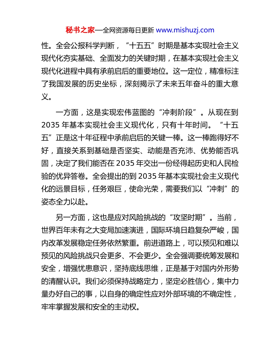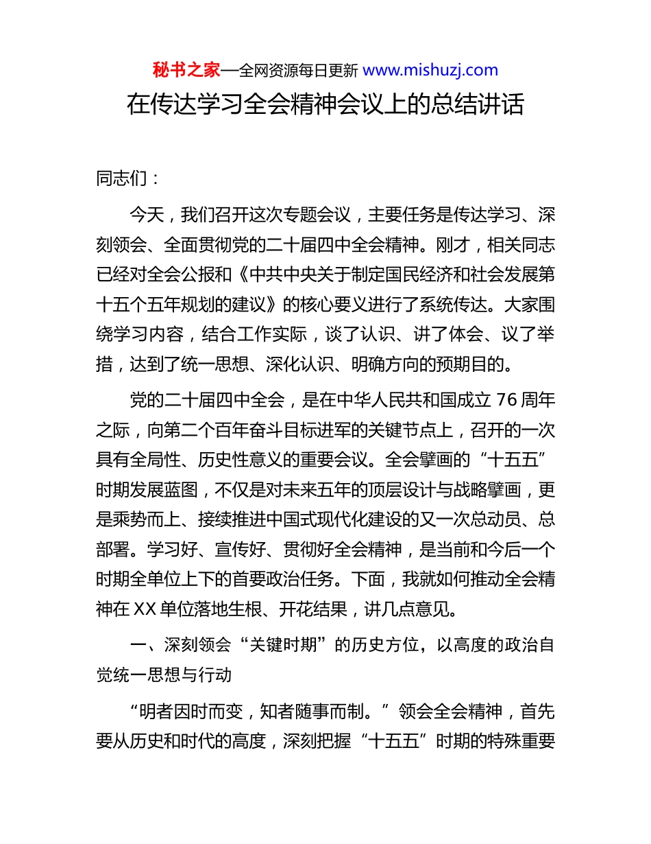 秘书之家—全网资源每日更新 www.mishuzj.com在传达学习全会精神会议上的总结讲话同志们:今天,我们召开这次专题会议,主要任务是传达学习、深刻领会、全面贯彻党的二十届四中全会精神。刚才,相关同志已经对全会公报和《中共中央关于制定国民经济和社会发展第十五个五年规划的建议》的核心要义进行了系统传达。大家围绕学习内容,结合工作实际,谈了认识、讲了体会、议了举措,达到了统一思想、深化认识、明确方向的预期目的。党的二十届四中全会,是在中华人民共和国成立 76 周年之际,向第二个百年奋斗目标进军的关键节点上,召开的一次具有全局性、历史性意义的重要会议。全会擘画的“十五五”时期发展蓝图,不仅是对未来五年的顶层设计与战略擘画,更是乘势而上、接续推进中国式现代化建设的又一次总动员、总部署。学习好、宣传好、贯彻好全会精神,是当前和今后一个时期全单位上下的首要政治任务。下面,我就如何推动全会精神在 XX 单位落地生根、开花结果,讲几点意见。一、深刻领会“关键时期”的历史方位,以高度的政治自觉统一思想与行动“明者因时而变,知者随事而制。”领会全会精神,首先要从历史和时代的高度,深刻把握“十五五”时期的特殊重要秘书之家—全网资源每日更新 www.mishuzj.com性。全会公报科学判断,“十五五”时期是基本实现社会主义现代化夯实基础、全面发力的关键时期,在基本实现社会主义现代化进程中具有承前启后的重要地位。这一定位,精准标注了我国发展的历史坐标,深刻揭示了未来五年奋斗的重大意义。一方面,这是实现宏伟蓝图的“冲刺阶段”。从现在到2035 年基本实现社会主义现代化,只有十年时间。“十五五”正是这十年征程中承前启后的关键一棒。这一棒跑得好不好,直接关系到基础是否坚实、动能是否充沛、优势能否巩固,决定了我们能否在 2035 年交出一份经得起历史和人民检验的优异答卷。全会提出的到 2035 年基本实现社会主义现代化的远景目标,任务艰巨,使命光荣,需要我们以“冲刺”的姿态全力以赴。另一方面,这也是应对风险挑战的“攻坚时期”。当前,世界百年未有之大变局加速演进,国际环境日趋复杂严峻,国内改革发展稳定任务依然繁重。前进道路上,可以预见和难以预见的风险挑战只会更多、不会更少。全会强调要统筹发展和安全,增强忧患意识,坚持底线思维,正是基于对国内外形势的清醒认识。我们必须保持战略定力,坚定必胜信心,集中力量办好自己的事,以自身的确定性应对外部环境的不确定性,牢牢掌握发展和安全的主动权。秘书之家—全网资源每日更新 www.mishuzj.com全单位各级干部职工要切实把思想和行动统一到党中央的重大判断和决策部署上来,将学习贯彻全会精神作为锤炼政治判断力、政治领悟力、政治执行力的重要实践。要坚持原原本本学、融会贯通学、联系实际学,深刻理解全会提出的一系列新思想、新论断、新部署、新要求真正做到内化于心、外化于行,把“两个确立”的决定性意义和“两个维护”的实践要求,体现到谋划工作的思路、推进工作的举措和检验工作的成效之中。二、精准把握“高质量发展”的核心要义,以扎实的工作成效服务国家大局高质量发展是全面建设社会主义现代化国家的首要任务,也是贯穿“十五五”规划建议的一条主线。全会围绕推动高质量发展,作出了一系列具有战略性、前瞻性的重大部署。我们必须胸怀“国之大者”,找准自身定位,将单位发展深度融入国家发展大局,在服务中心工作中彰显担当作为。第一,要在服务现代化产业体系建设上展现新作为。全会强调,要以科技创新引领现代化产业体系建设。XX 单位作为XX 领域的重要组成部分,必须主动对标这一要求。要围绕XX 地区的产业布局和发展规划,聚焦关键领域和薄弱环节,充分发挥自身职能优势。例如,我们的政策研究部门,要加强对前沿产业发展趋势的研判,为地方政府优化产业政策、布局秘书之家—全网资源每日更新 www.mishuzj.com未来产业提供高质量的决策参考。我们的项目服务部门,要持续优化工作流程,以“XX 护航”等机制为抓手,为高新技术企业、专精特新企业提供全周期、精细化的优质服务,助力营造稳定、公平、透明、可...