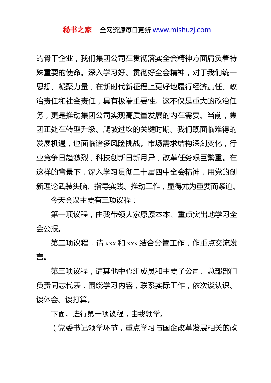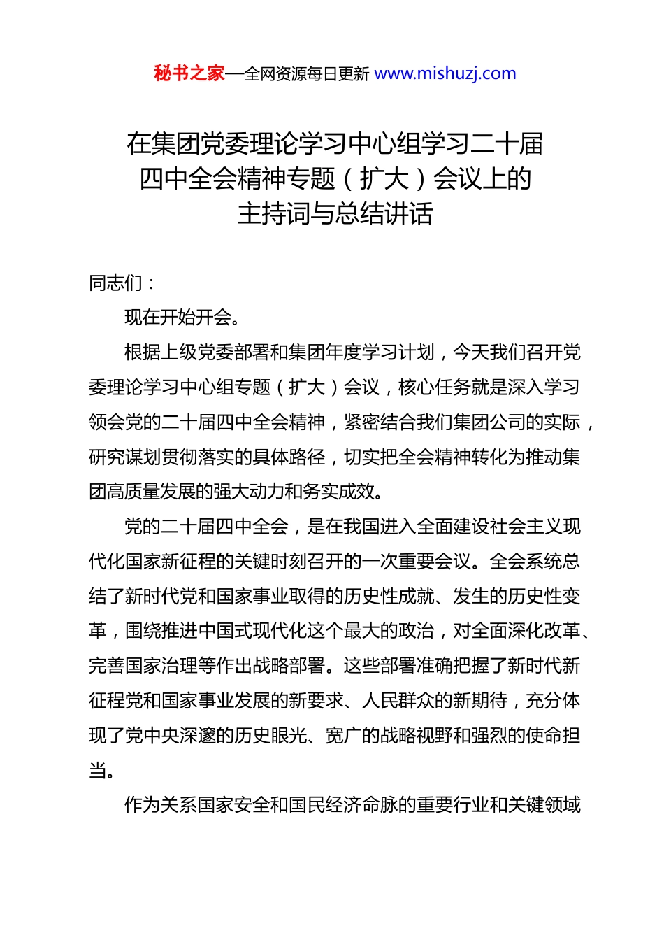 秘书之家—全网资源每日更新 www.mishuzj.com在集团党委理论学习中心组学习二十届四中全会精神专题(扩大)会议上的主持词与总结讲话同志们:现在开始开会。根据上级党委部署和集团年度学习计划,今天我们召开党委理论学习中心组专题(扩大)会议,核心任务就是深入学习领会党的二十届四中全会精神,紧密结合我们集团公司的实际,研究谋划贯彻落实的具体路径,切实把全会精神转化为推动集团高质量发展的强大动力和务实成效。党的二十届四中全会,是在我国进入全面建设社会主义现代化国家新征程的关键时刻召开的一次重要会议。全会系统总结了新时代党和国家事业取得的历史性成就、发生的历史性变革,围绕推进中国式现代化这个最大的政治,对全面深化改革、完善国家治理等作出战略部署。这些部署准确把握了新时代新征程党和国家事业发展的新要求、人民群众的新期待,充分体现了党中央深邃的历史眼光、宽广的战略视野和强烈的使命担当。作为关系国家安全和国民经济命脉的重要行业和关键领域秘书之家—全网资源每日更新 www.mishuzj.com的骨干企业,我们集团公司在贯彻落实全会精神方面肩负着特殊重要的使命。深入学习好、贯彻好全会精神,对于我们统一思想、凝聚力量,在新时代新征程上更好地履行经济责任、政治责任和社会责任,具有极端重要性。这不仅是重大的政治任务,更是推动集团公司实现高质量发展的内在需要。当前,集团正处在转型升级、爬坡过坎的关键时期。我们既面临难得的发展机遇,也面临诸多风险挑战。市场需求结构深刻变化,行业竞争日趋激烈,科技创新日新月异,改革任务艰巨繁重。在这样的背景下,深入学习贯彻二十届四中全会精神,用党的创新理论武装头脑、指导实践、推动工作,显得尤为重要而紧迫。今天会议主要有三项议程:第一项议程,由我带领大家原原本本、重点突出地学习全会公报。第二项议程,请 xxx 和 xxx 结合分管工作,作重点交流发言。第三项议程,请其他中心组成员和主要子公司、总部部门负责同志代表,围绕学习内容,联系实际工作,依次谈认识、谈体会、谈打算。下面,进行第一项议程,由我领学。(党委书记领学环节,重点学习与国企改革发展相关的政秘书之家—全网资源每日更新 www.mishuzj.com策导向和工作要求。)同志们,刚才我们共同学习了全会精神的核心内容。通过学习,大家对二十届四中全会的重大意义、精神实质和实践要求有了更深入的把握,特别是对全会关于国有企业改革发展的战略部署有了更清晰的认识。这为我们下一步的工作指明了方向,提供了遵循。下面进行第二项议程,请 xxx 和 xxx 作重点发言。大家欢迎!(.........)好,感谢两位同志的发言,很有启发。他们的发言紧密结合集团公司实际,既有理论思考,又有实践探索,提出的意见建议具有很强的针对性和可操作性。这为我们更好地贯彻落实全会精神提供了有益参考。现在进行第三项议程,交流研讨。请其他同志踊跃发言,时间请控制在 5 分钟左右。希望大家围绕学习贯彻全会精神,聚焦集团公司改革发展和党的建设的重点难点问题,畅谈学习体会和工作思考。(.........)同志们,刚才大家都谈了很好的学习体会和工作思考,听了很受启发。通过学习和交流,我们对全会精神的理解更深了,秘书之家—全网资源每日更新 www.mishuzj.com对集团面临的形势任务更清了,对下一步努力的方向也更明了。下面,我结合大家的发言和自己的学习思考,讲几点贯彻落实的意见。一、深刻领会全会精神对国企发展的重要性,增强贯彻落实的紧迫感和使命感这次全会,不是远在天边的政治口号,而是关系到我们企业生存发展的行动指南。我们要从三个方面深化认识:第一,这是我们必须抓住的重大战略机遇。全会擘画了国家发展的新蓝图,明确了“十五五”时期我国发展的指导思想、基本原则、主要目标和重点任务,是指导今后五年国民经济和社会发展的纲领性文件。这对于激励全党全国各族人民意气风发地推进中国式现代化、朝着第二个百年奋斗目标奋勇前进,具有重大而深远的影响。我们必须主动研究、积极对接,把各项政策机遇转化为发展动能。具体来说,就是要密切关注国家相关政策细则的出台,提前布局,...
