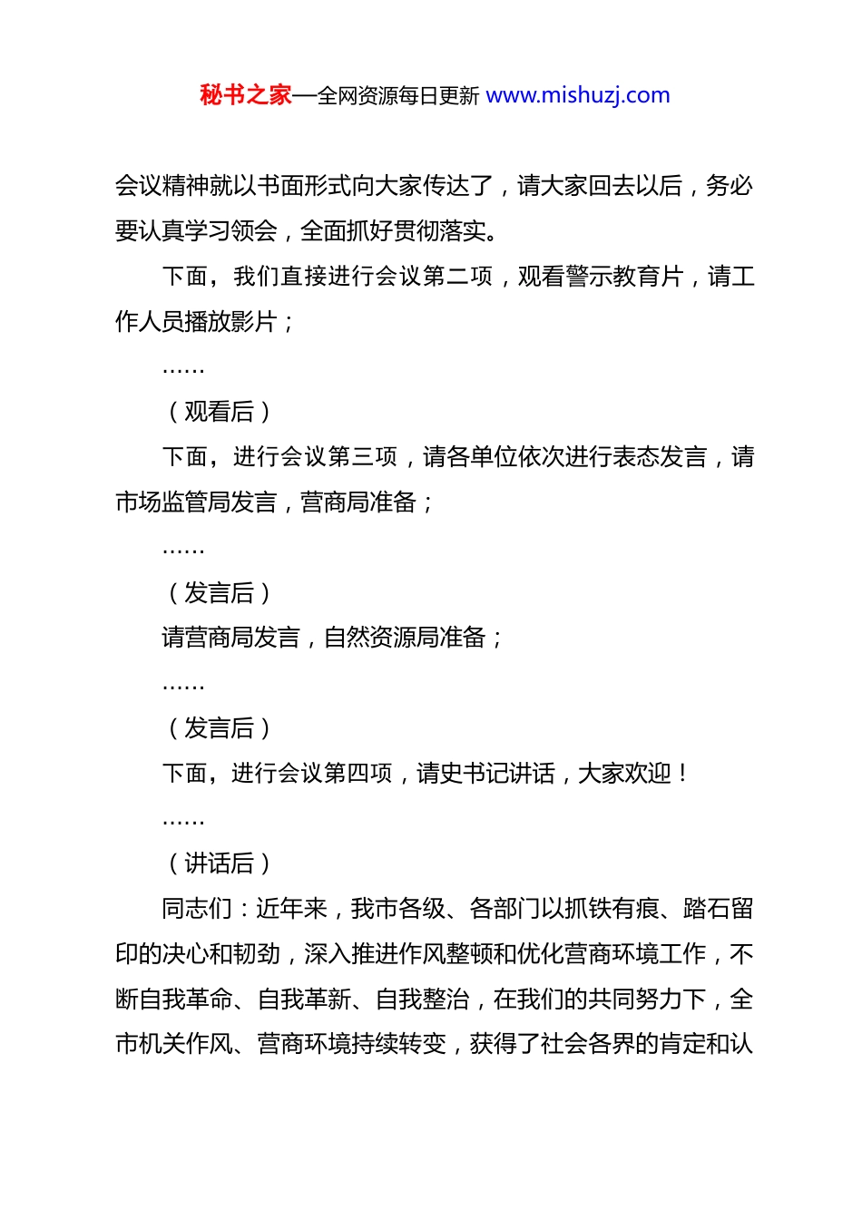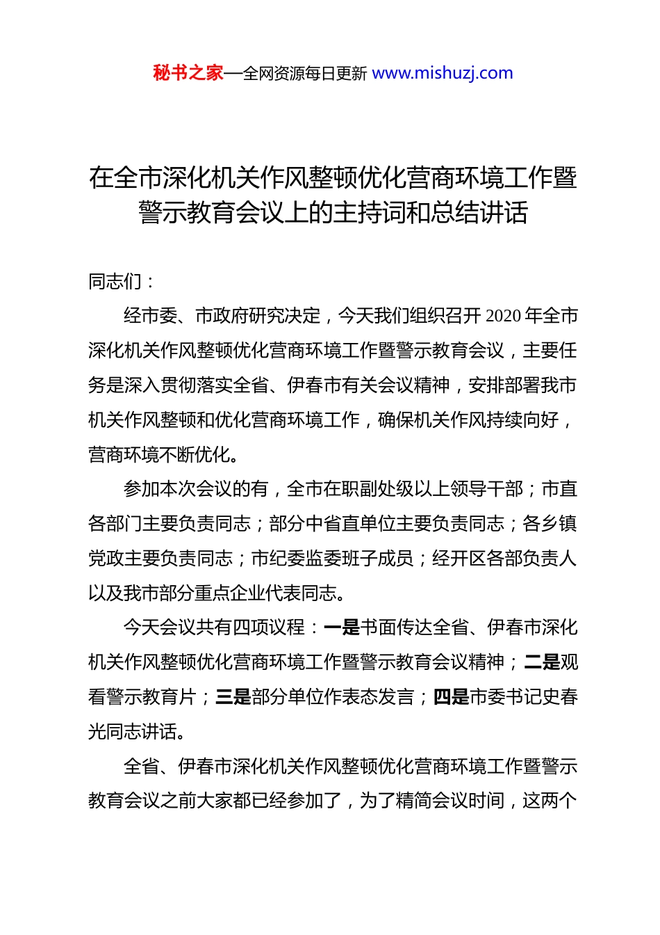 秘书之家—全网资源每日更新 www.mishuzj.com在全市深化机关作风整顿优化营商环境工作暨警示教育会议上的主持词和总结讲话同志们:经市委、市政府研究决定,今天我们组织召开 2020 年全市深化机关作风整顿优化营商环境工作暨警示教育会议,主要任务是深入贯彻落实全省、伊春市有关会议精神,安排部署我市机关作风整顿和优化营商环境工作,确保机关作风持续向好,营商环境不断优化。参加本次会议的有,全市在职副处级以上领导干部;市直各部门主要负责同志;部分中省直单位主要负责同志;各乡镇党政主要负责同志;市纪委监委班子成员;经开区各部负责人以及我市部分重点企业代表同志。今天会议共有四项议程:一是书面传达全省、伊春市深化机关作风整顿优化营商环境工作暨警示教育会议精神;二是观看警示教育片;三是部分单位作表态发言;四是市委书记史春光同志讲话。全省、伊春市深化机关作风整顿优化营商环境工作暨警示教育会议之前大家都已经参加了,为了精简会议时间,这两个秘书之家—全网资源每日更新 www.mishuzj.com会议精神就以书面形式向大家传达了,请大家回去以后,务必要认真学习领会,全面抓好贯彻落实。下面,我们直接进行会议第二项,观看警示教育片,请工作人员播放影片;......(观看后)下面,进行会议第三项,请各单位依次进行表态发言,请市场监管局发言,营商局准备;......(发言后)请营商局发言,自然资源局准备;......(发言后)下面,进行会议第四项,请史书记讲话,大家欢迎!......(讲话后)同志们:近年来,我市各级、各部门以抓铁有痕、踏石留印的决心和韧劲,深入推进作风整顿和优化营商环境工作,不断自我革命、自我革新、自我整治,在我们的共同努力下,全市机关作风、营商环境持续转变,获得了社会各界的肯定和认秘书之家—全网资源每日更新 www.mishuzj.com可。但不论何时,希望大家牢记,作风建设永远在路上,营商环境只有更好没有最好,希望同志们保持“咬定青山不放松”的定力,推动全市机关作风整顿和优化营商环境工作再上新台阶。下面,就贯彻落实好本次会议精神我再强调三点意见。第一,要立即行动,抓好会议精神的贯彻落实刚才,我们书面传达了全省、伊春市深化机关作风整顿优化营商环境工作暨警示教育会议精神,观看了警示教育片,几个部门的同志,结合各自工作实际,作了表态发言。特别是史春光书记的讲话,“病因”找的准,“药方”开的实,为我市深化机关作风整顿优化营商环境工作指明了方向,全市各级、各部门一定要深入学习、深刻领会、深化落实。会后,各单位主要负责同志要组织召开专题会议,迅速将本次会议精神传达下去。这里要强调一点,你们在贯彻落实会议精神时,决不能为了传达而传达,要坚决杜绝以会议贯彻会议的问题,要立足本部门、本领域工作实际,将会议精神同疫情防控、脱贫攻坚、污染防治、安全生产、项目建设、为企服务等各项重点工作结合起来,真正把会议精神落到实处。第二,要对标对表,补齐各自领域的短板弱项“以人为镜,可以明得失”,深化机关作风整顿优化营商环境要坚持以案为鉴、以案为戒。刚才史书记在讲话中指出了一秘书之家—全网资源每日更新 www.mishuzj.com些制约我市经济社会健康发展的问题,以及警示教育片里的案例,这些都需要我们高度重视、认真反思。今天参加会议的都是各部门的主要负责同志,针对这些问题,你们回去以后必须要对标对表,涉及本单位的要立即整改,不涉及的也不能沾沾自喜,更应举一反三、防微杜渐。会后,请市纪委监委的同志将警示教育片拷贝至各部门,我想各部门都应该看一看,特别是有窗口服务职能的部门。我们要学会透过现象看本质,挖掘深层次的问题,这才是解决问题、补齐短板的关键。特别有一些问题是不是因为思想不坚定、作风不扎实、制度不健全等因素导致的?能否通过建立健全相应制度来倒逼作风纪律的整体提升?这些都是需要各位深入思考,并付诸行动的。各单位要结合落实此次会议精神,认真开展一次自查,并制定整改台账,逐项销号。整改情况要报作风整顿办,请作风整顿办做好跟踪督办。第三,要抓好落实,推动营商环境的持续优化“一分部署,九分落实”,...