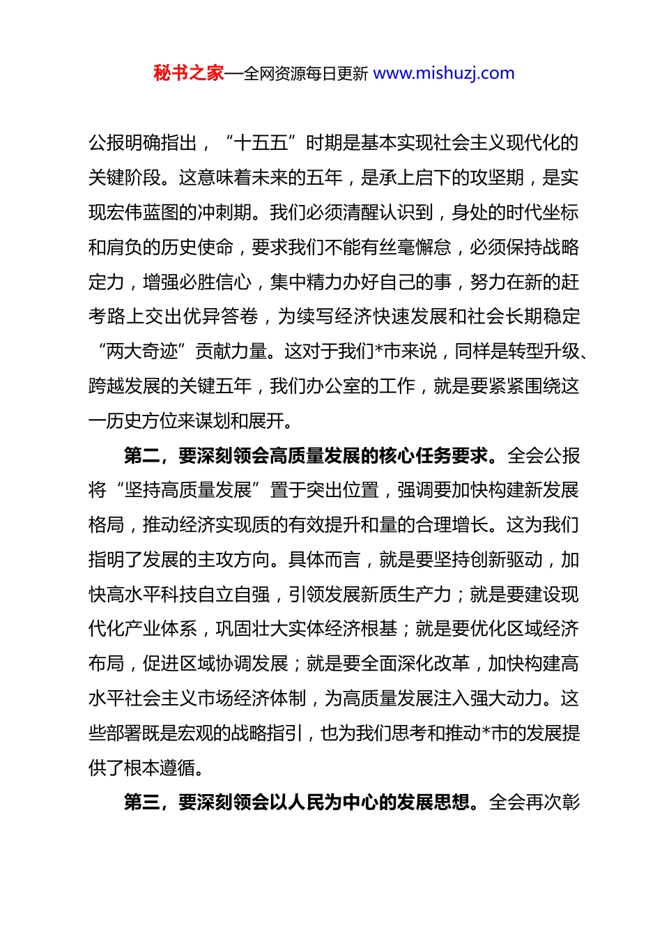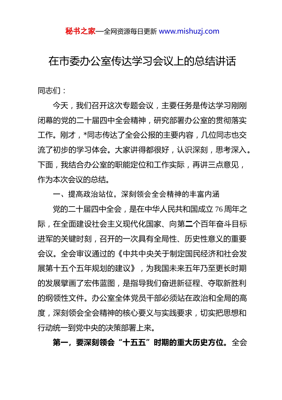 秘书之家—全网资源每日更新 www.mishuzj.com在市委办公室传达学习会议上的总结讲话同志们:今天,我们召开这次专题会议,主要任务是传达学习刚刚闭幕的党的二十届四中全会精神,研究部署办公室的贯彻落实工作。刚才,*同志传达了全会公报的主要内容,几位同志也交流了初步的学习体会。大家讲得都很好,认识深刻,思考深入。下面,我结合办公室的职能定位和工作实际,再讲三点意见,作为本次会议的总结。一、提高政治站位,深刻领会全会精神的丰富内涵党的二十届四中全会,是在中华人民共和国成立 76 周年之际,在全面建设社会主义现代化国家、向第二个百年奋斗目标进军的关键时刻,召开的一次具有全局性、历史性意义的重要会议。全会审议通过的《中共中央关于制定国民经济和社会发展第十五个五年规划的建议》,为我国未来五年乃至更长时期的发展擘画了宏伟蓝图,是指导我们奋进新征程、夺取新胜利的纲领性文件。办公室全体党员干部必须站在政治和全局的高度,深刻领会全会精神的核心要义与实践要求,切实把思想和行动统一到党中央的决策部署上来。第一,要深刻领会“十五五”时期的重大历史方位。全会秘书之家—全网资源每日更新 www.mishuzj.com公报明确指出,“十五五”时期是基本实现社会主义现代化的关键阶段。这意味着未来的五年,是承上启下的攻坚期,是实现宏伟蓝图的冲刺期。我们必须清醒认识到,身处的时代坐标和肩负的历史使命,要求我们不能有丝毫懈怠,必须保持战略定力,增强必胜信心,集中精力办好自己的事,努力在新的赶考路上交出优异答卷,为续写经济快速发展和社会长期稳定“两大奇迹”贡献力量。这对于我们*市来说,同样是转型升级、跨越发展的关键五年,我们办公室的工作,就是要紧紧围绕这一历史方位来谋划和展开。第二,要深刻领会高质量发展的核心任务要求。全会公报将“坚持高质量发展”置于突出位置,强调要加快构建新发展格局,推动经济实现质的有效提升和量的合理增长。这为我们指明了发展的主攻方向。具体而言,就是要坚持创新驱动,加快高水平科技自立自强,引领发展新质生产力;就是要建设现代化产业体系,巩固壮大实体经济根基;就是要优化区域经济布局,促进区域协调发展;就是要全面深化改革,加快构建高水平社会主义市场经济体制,为高质量发展注入强大动力。这些部署既是宏观的战略指引,也为我们思考和推动*市的发展提供了根本遵循。第三,要深刻领会以人民为中心的发展思想。全会再次彰秘书之家—全网资源每日更新 www.mishuzj.com显了我们党一以贯之的为民情怀,强调要加大保障和改善民生力度,扎实推进全体人民共同富裕,不断提高人民生活品质。无论是促进高质量充分就业,还是办好人民满意的教育、健全社会保障体系、推进健康中国建设,都体现了发展为了人民、发展依靠人民、发展成果由人民共享的价值追求。市委办公室作为离市委最近、服务群众最直接的部门之一,必须将这种思想融入血脉、见诸行动,始终把人民群众的安危冷暖放在心上。第四,要深刻领会统筹发展和安全的重大原则。安全是发展的前提,发展是安全的保障。全会强调要更好统筹发展和安全,推进国家安全体系和能力现代化。这要求我们在谋划工作、推进发展时,必须增强忧患意识,坚持底线思维,下好先手棋、打好主动仗,有效防范化解政治、经济、社会、生态等各领域风险挑战,确保*市在现代化建设的道路上行稳致远。二、聚焦职责使命,全力做好服务保障的各项工作学习贯彻全会精神,关键在于结合实际、推动工作。市委办公室作为市委的“坚强前哨”和“巩固后院”,承担着参谋辅政、统筹协调、督查督办、服务保障的重要职责。我们必须把全会精神转化为做好“三服务”工作的具体思路、务实举措和实际行动,在服务*市高质量发展大局中展现新担当、新作为。第一,围绕“高质量发展”这一首要任务,当好参谋助手秘书之家—全网资源每日更新 www.mishuzj.com全会为“十五五”时期的经济工作定下了基调。对照全会要求,我们必须清醒地看到*市当前发展面临的挑战。2024 年,我市地区生产总值增长 3.0%,虽然总量保持领先,但增速有所放缓。特别是第二产业增加值占比仅为 19.3...