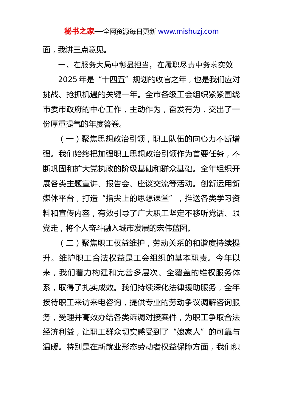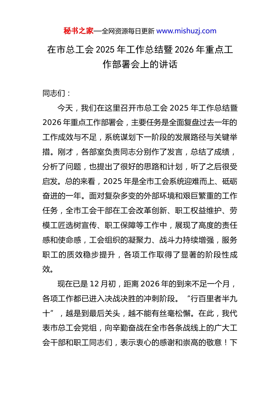 秘书之家—全网资源每日更新 www.mishuzj.com在市总工会 2025 年工作总结暨 2026 年重点工作部署会上的讲话 同志们:今天,我们在这里召开市总工会 2025 年工作总结暨2026 年重点工作部署会,主要任务是全面复盘过去一年的工作成效与不足,系统谋划下一阶段的发展路径与关键举措。刚才,各部室负责同志分别作了发言,总结了成绩,分析了问题,也提出了很好的思路和计划,听了之后很受启发。总的来看,2025 年是全市工会系统迎难而上、砥砺奋进的一年。面对复杂多变的外部环境和艰巨繁重的工作任务,全市工会干部在工会改革创新、职工权益维护、劳模工匠选树宣传、职工保障等工作中,展现了高度的责任感和使命感,工会组织的凝聚力、战斗力持续增强,服务职工的质效稳步提升,各项工作取得了显著的阶段性成效。现在已是 12 月初,距离 2026 年的到来不足一个月,各项工作都已进入决战决胜的冲刺阶段。“行百里者半九十”,越是到最后关头,越不能有丝毫松懈。在此,我代表市总工会党组,向辛勤奋战在全市各条战线上的广大工会干部和职工同志们,表示衷心的感谢和崇高的敬意!下秘书之家—全网资源每日更新 www.mishuzj.com面,我讲三点意见。一、在服务大局中彰显担当,在履职尽责中务求实效2025 年是“十四五”规划的收官之年,也是我们应对挑战、抢抓机遇的关键一年。全市各级工会组织紧紧围绕市委市政府的中心工作,主动作为,奋发有为,交出了一份厚重提气的年度答卷。(一)聚焦思想政治引领,职工队伍的向心力不断增强。我们始终把加强职工思想政治引领作为首要任务,不断巩固和扩大党执政的阶级基础和群众基础。全年组织开展各类主题宣讲、报告会、座谈交流等活动。创新运用新媒体平台,打造“指尖上的思想课堂”,推送各类学习资料和宣传内容,有效引导了广大职工坚定不移听党话、跟党走,将个人奋斗融入城市发展的宏伟蓝图。(二)聚焦职工权益维护,劳动关系的和谐度持续提升。维护职工合法权益是工会组织的基本职责。今年以来,我们着力构建和完善多层次、全覆盖的维权服务体系,取得了扎实成效。我们持续深化法律援助服务,全年接待职工来访来电咨询,提供专业的劳动争议调解咨询服务,受理并高效办结各类诉调对接案件,为职工争取合法经济利益,让职工群众切实感受到了“娘家人”的可靠与温暖。特别是在新就业形态劳动者权益保障方面,我们积秘书之家—全网资源每日更新 www.mishuzj.com极探索,推动建立了多个行业性劳动争议调解委员会,有效化解了多起因平台算法、薪酬结算等引发的新型劳动纠纷,维护了行业的稳定与发展。(三)聚焦劳模精神弘扬,工匠队伍的引领力更加彰显。榜样的力量是无穷的。我们大力弘扬劳模精神、劳动精 神 、 工 匠 精 神 , 持 续 深 化 先 进 典 型 的 选 树 培 育 工作。2025 年,我们成功推荐并评选出全国劳动模范和先进工作者,省级劳动模范,市级劳动模范。我们不仅把先进人物评选出来,更注重把他们的事迹宣传出去。通过举办劳模事迹报告会、开辟“工匠风采”专栏、拍摄宣传短片等多种形式,让劳模工匠的故事家喻户晓,在全社会营造了劳动光荣、技能宝贵、创造伟大的时代风尚。同时,我们积极发挥劳模创新工作室的“传帮带”作用,全市新建市级劳模(职工)创新工作室 15 个,这些工作室围绕技术攻关、工艺革新、人才培养等方面,开展技术创新项目,成为推动我市产业转型升级的重要力量。(四)聚焦职工服务保障,广大职工的获得感更加充实。我们始终坚持以职工为中心的工作导向,织密扎牢职工服务保障网。在职工互助保障方面,有效减轻了患病职工的医疗负担,成为基本医疗保险的有力补充。在困难职工帮扶方面,我们精准施策,全年累计为困难职工家庭发秘书之家—全网资源每日更新 www.mishuzj.com放各类补助和慰问金,帮助他们解决了就医、子女上学等燃眉之急。同时,我们积极拓展服务领域,建成市级“爱心驿站”,为户外劳动者提供了“冷可取暖、热可纳凉、渴可喝水、累可歇脚”的温馨港湾。这些具体而实在的举措,切实把党和政府的关怀与温暖送到了广大职工的心坎上。在肯定成绩的同时...