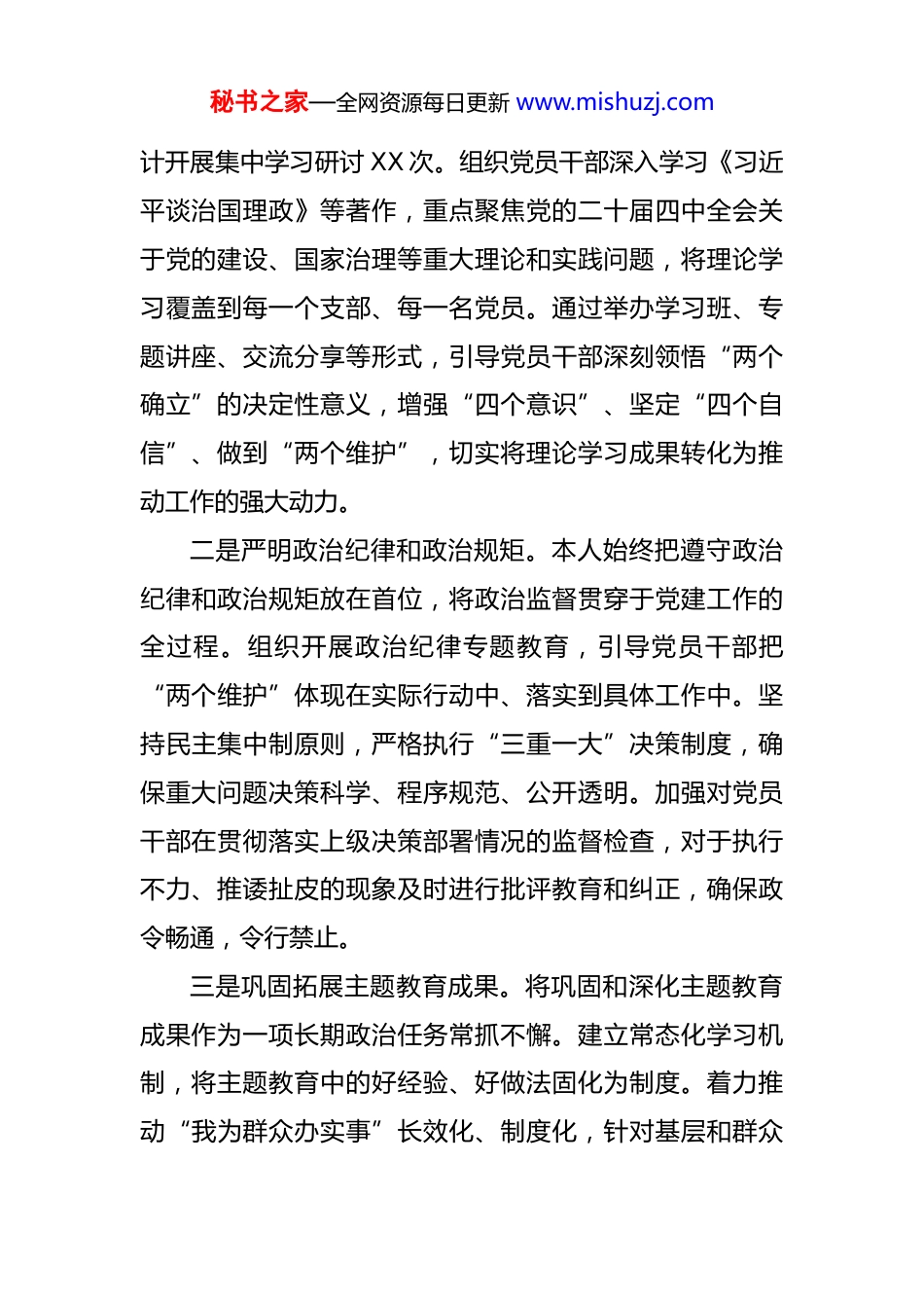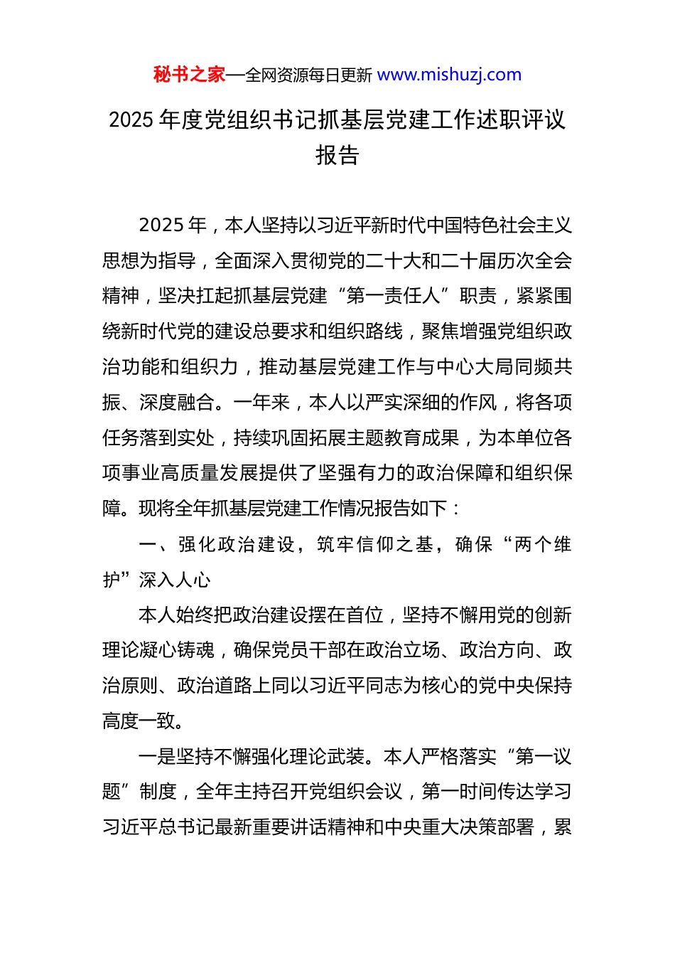 秘书之家—全网资源每日更新 www.mishuzj.com2025 年度党组织书记抓基层党建工作述职评议报告 2025 年,本人坚持以习近平新时代中国特色社会主义思想为指导,全面深入贯彻党的二十大和二十届历次全会精神,坚决扛起抓基层党建“第一责任人”职责,紧紧围绕新时代党的建设总要求和组织路线,聚焦增强党组织政治功能和组织力,推动基层党建工作与中心大局同频共振、深度融合。一年来,本人以严实深细的作风,将各项任务落到实处,持续巩固拓展主题教育成果,为本单位各项事业高质量发展提供了坚强有力的政治保障和组织保障。现将全年抓基层党建工作情况报告如下:一、强化政治建设,筑牢信仰之基,确保“两个维护”深入人心本人始终把政治建设摆在首位,坚持不懈用党的创新理论凝心铸魂,确保党员干部在政治立场、政治方向、政治原则、政治道路上同以习近平同志为核心的党中央保持高度一致。一是坚持不懈强化理论武装。本人严格落实“第一议题”制度,全年主持召开党组织会议,第一时间传达学习习近平总书记最新重要讲话精神和中央重大决策部署,累秘书之家—全网资源每日更新 www.mishuzj.com计开展集中学习研讨 XX 次。组织党员干部深入学习《习近平谈治国理政》等著作,重点聚焦党的二十届四中全会关于党的建设、国家治理等重大理论和实践问题,将理论学习覆盖到每一个支部、每一名党员。通过举办学习班、专题讲座、交流分享等形式,引导党员干部深刻领悟“两个确立”的决定性意义,增强“四个意识”、坚定“四个自信”、做到“两个维护”,切实将理论学习成果转化为推动工作的强大动力。二是严明政治纪律和政治规矩。本人始终把遵守政治纪律和政治规矩放在首位,将政治监督贯穿于党建工作的全过程。组织开展政治纪律专题教育,引导党员干部把“两个维护”体现在实际行动中、落实到具体工作中。坚持民主集中制原则,严格执行“三重一大”决策制度,确保重大问题决策科学、程序规范、公开透明。加强对党员干部在贯彻落实上级决策部署情况的监督检查,对于执行不力、推诿扯皮的现象及时进行批评教育和纠正,确保政令畅通,令行禁止。三是巩固拓展主题教育成果。将巩固和深化主题教育成果作为一项长期政治任务常抓不懈。建立常态化学习机制,将主题教育中的好经验、好做法固化为制度。着力推动“我为群众办实事”长效化、制度化,针对基层和群众秘书之家—全网资源每日更新 www.mishuzj.com反映的突出问题,本人亲自带队开展调研,制定并实施年度为民办实事清单 XX 项,已全部完成。例如,针对 XX(具体问题,如老年人办事不便),组织党员志愿者提供上门服务,受到群众广泛好评。通过持续用力,确保主题教育成效转化为党员干部担当作为、服务人民的实际行动。二、聚力强基固本,严密组织体系,提升党组织政治功能和组织力基层党组织是党的全部工作和战斗力的基础。本人着力推动组织体系建设全面过硬,有效激发基层党组织和党员队伍的生机活力。一是推动组织设置和功能优化。根据本单位人员结构变化和业务发展需求,及时优化调整党支部设置,确保支部建在业务一线、覆盖到最小单元。例如,在 XX(具体业务部门或项目)成立了临时党支部/党员攻坚队,使党组织的功能与中心工作更加匹配。严格落实《中国共产党支部工作条例(试行)》,推行党支部标准化规范化建设,从组织设置、班子建设、活动开展、制度执行等方面进行量化考核,全年 XX 个党支部已全部达到“五星级”或“示范型”标准。二是规范党内政治生活。严格执行“三会一课”、组秘书之家—全网资源每日更新 www.mishuzj.com织生活会、民主评议党员等基本制度,确保党内政治生活基本规范。本人带头落实双重组织生活制度,以普通党员身份参加所在支部的组织生活会,开展批评与自我批评,起到了模范带头作用。创新主题党日活动形式,将党性教育与红色资源、业务实践相结合,例如组织党员赴 XX(红色教育基地)开展“重走长征路,汲取奋进力量”主题党日活动,增强了政治生活的吸引力和感染力。三是锻造过硬党员干部队伍。坚持严把“入口关”,严格程序、规范培养,全年发展新党员 XX 名,培养入党积极分子 XX...