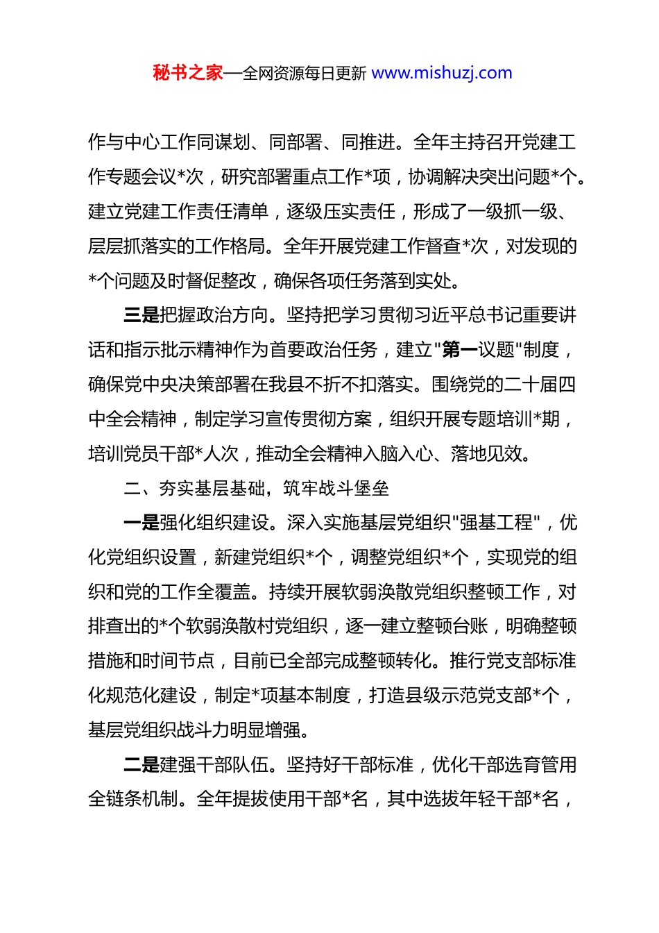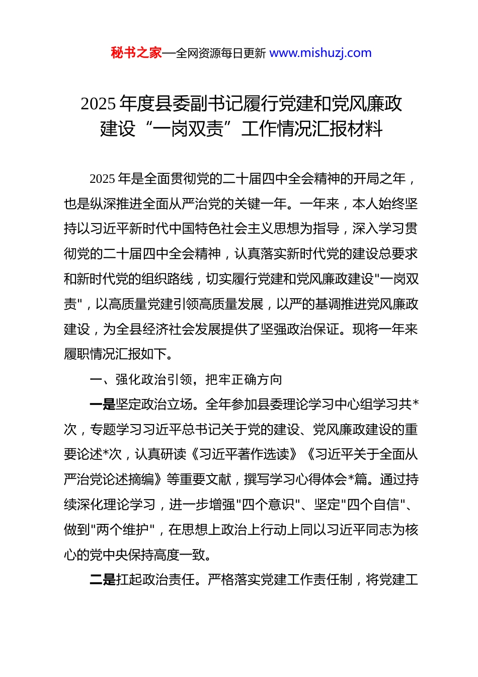 秘书之家—全网资源每日更新 www.mishuzj.com2025 年度县委副书记履行党建和党风廉政建设“一岗双责”工作情况汇报材料 2025 年是全面贯彻党的二十届四中全会精神的开局之年,也是纵深推进全面从严治党的关键一年。一年来,本人始终坚持以习近平新时代中国特色社会主义思想为指导,深入学习贯彻党的二十届四中全会精神,认真落实新时代党的建设总要求和新时代党的组织路线,切实履行党建和党风廉政建设"一岗双责",以高质量党建引领高质量发展,以严的基调推进党风廉政建设,为全县经济社会发展提供了坚强政治保证。现将一年来履职情况汇报如下。一、强化政治引领,把牢正确方向一是坚定政治立场。全年参加县委理论学习中心组学习共*次,专题学习习近平总书记关于党的建设、党风廉政建设的重要论述*次,认真研读《习近平著作选读》《习近平关于全面从严治党论述摘编》等重要文献,撰写学习心得体会*篇。通过持续深化理论学习,进一步增强"四个意识"、坚定"四个自信"、做到"两个维护",在思想上政治上行动上同以习近平同志为核心的党中央保持高度一致。二是扛起政治责任。严格落实党建工作责任制,将党建工秘书之家—全网资源每日更新 www.mishuzj.com作与中心工作同谋划、同部署、同推进。全年主持召开党建工作专题会议*次,研究部署重点工作*项,协调解决突出问题*个。建立党建工作责任清单,逐级压实责任,形成了一级抓一级、层层抓落实的工作格局。全年开展党建工作督查*次,对发现的*个问题及时督促整改,确保各项任务落到实处。三是把握政治方向。坚持把学习贯彻习近平总书记重要讲话和指示批示精神作为首要政治任务,建立"第一议题"制度,确保党中央决策部署在我县不折不扣落实。围绕党的二十届四中全会精神,制定学习宣传贯彻方案,组织开展专题培训*期,培训党员干部*人次,推动全会精神入脑入心、落地见效。二、夯实基层基础,筑牢战斗堡垒一是强化组织建设。深入实施基层党组织"强基工程",优化党组织设置,新建党组织*个,调整党组织*个,实现党的组织和党的工作全覆盖。持续开展软弱涣散党组织整顿工作,对排查出的*个软弱涣散村党组织,逐一建立整顿台账,明确整顿措施和时间节点,目前已全部完成整顿转化。推行党支部标准化规范化建设,制定*项基本制度,打造县级示范党支部*个,基层党组织战斗力明显增强。二是建强干部队伍。坚持好干部标准,优化干部选育管用全链条机制。全年提拔使用干部*名,其中选拔年轻干部*名,秘书之家—全网资源每日更新 www.mishuzj.com女干部*名,少数民族干部*名,干部队伍结构持续优化。加强干部教育培训,举办各类培训班*期,培训干部*人次,干部履职能力明显提升。强化干部日常管理监督,建立干部考核评价体系,开展平时考核*次,对*名考核不合格干部进行了诫勉谈话。三是激发党员活力。严格党员发展标准,全年发展党员*名,其中 35 岁以下党员*名,大专以上学历党员*名,生产一线党员*名,党员队伍结构不断优化。规范党员教育管理,组织开展主题党日活动*次,参与党员*人次,党员意识明显增强。深化党员积分管理,建立党员先锋指数考评体系,评选表彰优秀共产党员*名,树立了学习标杆。建立健全党内关怀帮扶机制,走访慰问困难党员*名,发放帮扶资金*万元,让党员感受到组织温暖。三、创新工作方法,提升党建质效一是推进智慧党建。顺应信息化发展趋势,建设"智慧党建"平台,整合党员信息*条,开发学习教育、组织管理、党务公开等功能模块*个,实现党建工作数字化、网络化、智能化。推行"互联网+党建"模式,建立网上党支部*个,开展线上组织生活*次,参与党员*人次,有效解决了流动党员管理难题。利用微信公众号、视频号等新媒体平台,推送党建资讯*条,阅读秘书之家—全网资源每日更新 www.mishuzj.com量达*万次,扩大了党建工作影响力。二是深化结对共建。推行机关事业单位党组织与村(社区)党组织结对共建,建立结对关系*对,开展共建活动*次,帮助解决实际困难*个。探索"党建+产业"模式,选派*名机关党员干部担任产业发展指导员,帮助*个村发展特色产业,带动*户群众增收致富。开展"双报到双服务"活动,组织*名在职党...