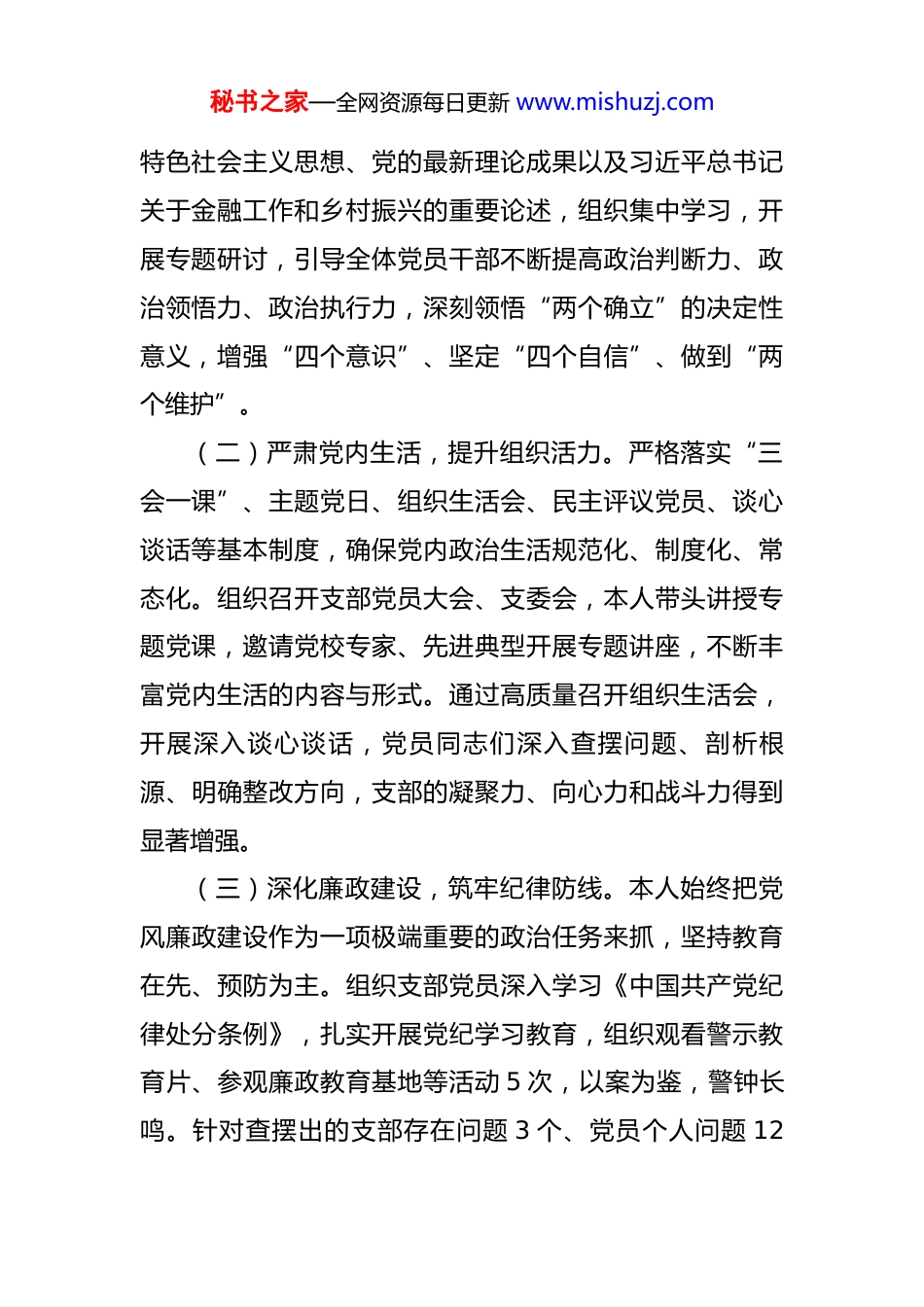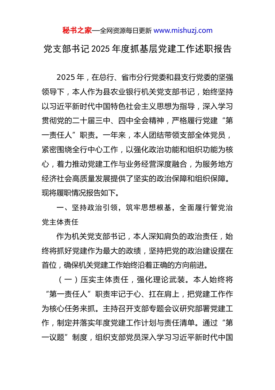 秘书之家—全网资源每日更新 www.mishuzj.com党支部书记 2025 年度抓基层党建工作述职报告 2025 年,在总行、省市分行党委和县支行党委的坚强领导下,本人作为县农业银行机关党支部书记,始终坚持以习近平新时代中国特色社会主义思想为指导,深入学习贯彻党的二十届三中、四中全会精神,严格履行党建“第一责任人”职责。一年来,本人团结带领支部全体党员,紧密围绕全行中心工作,以强化政治功能和组织功能为核心,着力推动党建工作与业务经营深度融合,为服务地方经济社会高质量发展提供了坚实的政治保障和组织保障。现将履职情况报告如下。一、坚持政治引领,筑牢思想根基,全面履行管党治党主体责任作为机关党支部书记,本人深知肩负的政治责任,始终将抓好党建作为最大的政绩,坚持把党的政治建设摆在首位,确保机关党建工作始终沿着正确的方向前进。(一)压实主体责任,强化理论武装。本人始终将“第一责任人”职责牢记于心、扛在肩上,把党建工作作为核心任务来抓。主持召开支部专题会议研究部署党建工作,制定并落实年度党建工作计划与责任清单。通过“第一议题”制度,组织支部党员深入学习习近平新时代中国秘书之家—全网资源每日更新 www.mishuzj.com特色社会主义思想、党的最新理论成果以及习近平总书记关于金融工作和乡村振兴的重要论述,组织集中学习,开展专题研讨,引导全体党员干部不断提高政治判断力、政治领悟力、政治执行力,深刻领悟“两个确立”的决定性意义,增强“四个意识”、坚定“四个自信”、做到“两个维护”。(二)严肃党内生活,提升组织活力。严格落实“三会一课”、主题党日、组织生活会、民主评议党员、谈心谈话等基本制度,确保党内政治生活规范化、制度化、常态化。组织召开支部党员大会、支委会,本人带头讲授专题党课,邀请党校专家、先进典型开展专题讲座,不断丰富党内生活的内容与形式。通过高质量召开组织生活会,开展深入谈心谈话,党员同志们深入查摆问题、剖析根源、明确整改方向,支部的凝聚力、向心力和战斗力得到显著增强。(三)深化廉政建设,筑牢纪律防线。本人始终把党风廉政建设作为一项极端重要的政治任务来抓,坚持教育在先、预防为主。组织支部党员深入学习《中国共产党纪律处分条例》,扎实开展党纪学习教育,组织观看警示教育片、参观廉政教育基地等活动 5 次,以案为鉴,警钟长鸣。针对查摆出的支部存在问题 3 个、党员个人问题 12秘书之家—全网资源每日更新 www.mishuzj.com个,均已建立台账、明确责任、限期整改,确保问题整改见底清零。同时,畅通群众监督渠道,设立举报箱和监督电话,全年未发生党员干部违规违纪问题,营造了风清气正的政治生态。二、聚焦中心大局,深化融合发展,以高质量党建引领高质量发展本人深刻认识到,机关党建工作的生命力在于服务中心、建设队伍。为此,党支部始终坚持党建工作与业务经营同谋划、同部署、同推进,以“党建+”模式为重要抓手,破解“两张皮”难题,将党的政治优势、组织优势转化为推动全行高质量发展的强大动能。(一)党建引领服务“三农”展现新作为。作为服务“三农”的国家队和主力军,党支部将党建工作的落脚点放在坚决扛起金融服务乡村振兴的政治责任上。支部牵头成立了“党员金融服务先锋队”,聚焦*县茶叶、中药材、生态畜牧等特色优势产业,主动对接地方政府与新型农业经营主体。这一成绩的取得,正是支部将党建工作深度融入服务国家粮食安全和乡村振兴核心业务的生动体现。(二)党建赋能业务经营实现新突破。支部坚持“围绕中心抓党建,抓好党建促发展”的理念,将党建工作融入业务发展的各环节、全过程。面对激烈的市场竞争环境,秘书之家—全网资源每日更新 www.mishuzj.com党支部设立了“党员责任区”“党员示范岗”,组织党员骨干成立营销突击队,在对公业务、普惠金融、数字化转型等重点领域攻坚克难。通过党员的模范带头作用,有效激发了全员干事创业的热情。这些经营成果,是支部坚持党建与业务“一本账”,实现目标同向、工作同步的直接体现。(三)党建创新优化服务取得新成效。为切实解决服务群众“最后一公里”问题,党支部探索创新了...