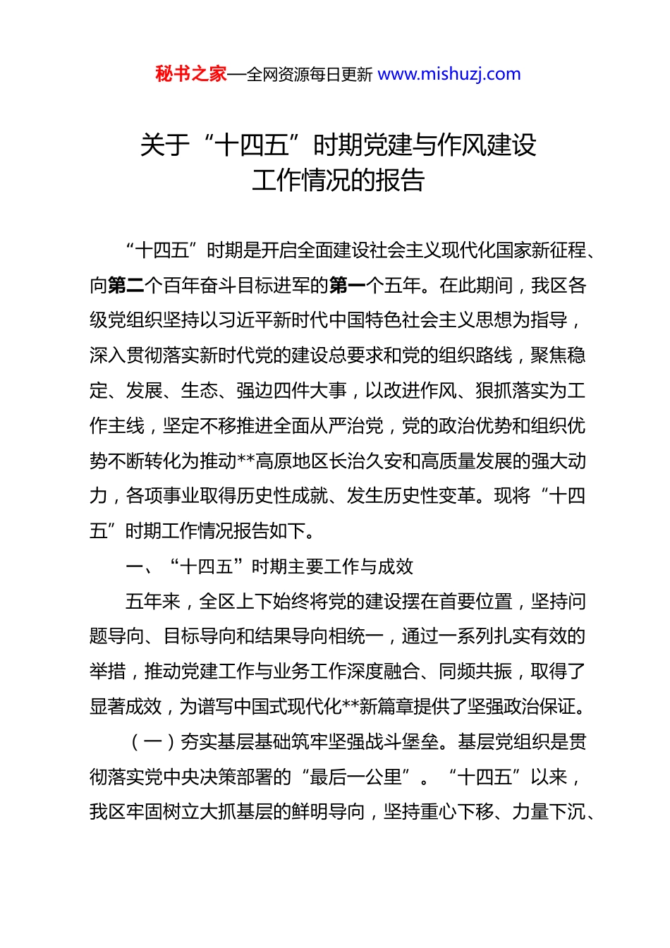 秘书之家—全网资源每日更新 www.mishuzj.com关于“十四五”时期党建与作风建设工作情况的报告 “十四五”时期是开启全面建设社会主义现代化国家新征程、向第二个百年奋斗目标进军的第一个五年。在此期间,我区各级党组织坚持以习近平新时代中国特色社会主义思想为指导,深入贯彻落实新时代党的建设总要求和党的组织路线,聚焦稳定、发展、生态、强边四件大事,以改进作风、狠抓落实为工作主线,坚定不移推进全面从严治党,党的政治优势和组织优势不断转化为推动**高原地区长治久安和高质量发展的强大动力,各项事业取得历史性成就、发生历史性变革。现将“十四五”时期工作情况报告如下。一、“十四五”时期主要工作与成效五年来,全区上下始终将党的建设摆在首要位置,坚持问题导向、目标导向和结果导向相统一,通过一系列扎实有效的举措,推动党建工作与业务工作深度融合、同频共振,取得了显著成效,为谱写中国式现代化**新篇章提供了坚强政治保证。(一)夯实基层基础筑牢坚强战斗堡垒。基层党组织是贯彻落实党中央决策部署的“最后一公里”。“十四五”以来,我区牢固树立大抓基层的鲜明导向,坚持重心下移、力量下沉、秘书之家—全网资源每日更新 www.mishuzj.com保障下倾,着力将每一个基层党组织都建设成为听党话、跟党走,善团结、会发展,能致富、保稳定,遇事不糊涂、关键时刻起作用的坚强战斗堡垒。一是优化组织设置,实现党的领导全覆盖。针对我区地广人稀、党员群众居住分散的特殊区情,坚持“支部建在连上”的优良传统,大力推进党的组织和工作覆盖。在巩固传统领域党组织的基础上,将组织链条向新兴领域、关键部位、重点环节延伸。无论是在繁忙的国道**沿线服务区,还是在偏远的季节性放牧点、工程项目建设一线,都及时建立起党的组织,确保党中央的决策部署和区党委的工作要求能够第一时间传达到“神经末梢”,有效杜绝了组织覆盖的“空白点”和“盲区”,确保了党的领导无处不在、无时不在。二是建强骨干队伍,提升基层治理效能。坚持把建强村居“两委”班子作为固本之基,通过严格选拔、集中培训、交流挂职、实践锻炼等多种方式,持续优化班子年龄、学历和专业结构,一大批政治过硬、视野开阔、有干劲、会干事的年轻干部走上领导岗位。**市**县**乡党委负责人曾表示:“过去我们乡各村‘两委’班子成员年龄偏大,思路不够开阔。通过结构优化,现在的班子成员普遍年轻化,思想眼界也开阔了不少,带领群众发展的能力显著增强。”同时,创新驻村工作模式,建立起“一县一驻村总领队、一乡一临时党支部、一村一第一书记”秘书之家—全网资源每日更新 www.mishuzj.com的精细化工作体系,使驻村干部的职责定位更明确,管理考核更科学,作用发挥更充分。三是完善治理体系,推动服务重心下沉。全面落实党建引领城市基层治理的 21 条措施,稳妥推进镇改街道、村改社区、网格优化等改革任务,构建起区域统筹、条块协同、上下联动、共建共享的城市基层党建新格局。健全完善矛盾纠纷排查化解机制,推动资源、管理、服务向网格下沉,确保群众的诉求在基层得到及时响应,问题在萌芽状态得到有效解决。**市**区**社区党支部书记对此深有感触:“现在的网格划分更细了,网格员的责任更清晰了,老百姓遇到急事难事,我们能更早知道、更快处理,党和群众的联系比以往任何时候都更加紧密了。”(二)强化铸魂赋能锻造过硬党员队伍。党员是党的肌体细胞和活动主体。我区始终将党员教育管理作为一项基础性、经常性工程来抓,着力锻造一支信念坚定、素质优良、纪律严明、作用突出的高素质党员队伍,让党的旗帜在雪域高原高高飘扬。一是创新教育载体,增强学习吸引力。针对传统党课模式吸引力不足的问题,大力推广“党课开讲啦”等活动,将课堂从会议室搬到红色教育基地、改革发展一线、乡村振兴现场。在**农场的田间地头开展的沉浸式党课,让年轻党员卓嘎深受触动,她表示:“这种现场教学,让我们对老**精神和铸牢中秘书之家—全网资源每日更新 www.mishuzj.com华民族共同体意识的理解更加深刻,思想受到了极大洗礼。”同时,充分运用信息化手段,建强用好“**党员教育”网站...