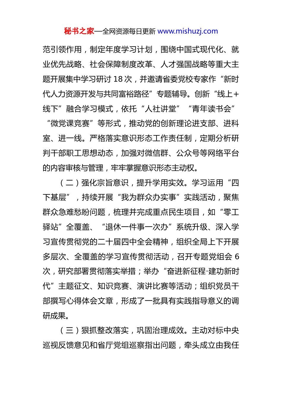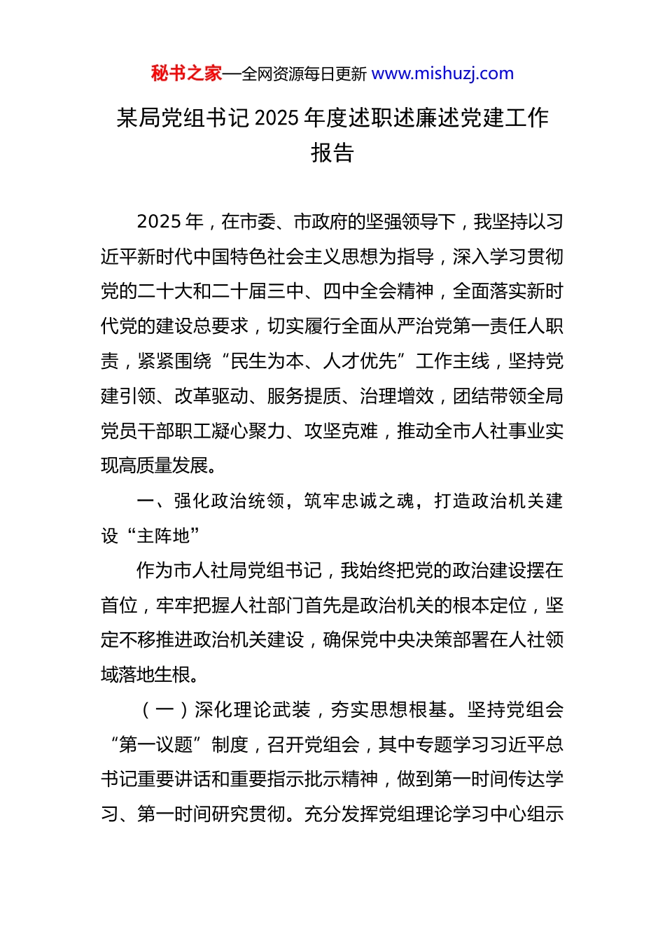 秘书之家—全网资源每日更新 www.mishuzj.com某局党组书记 2025 年度述职述廉述党建工作报告 2025 年,在市委、市政府的坚强领导下,我坚持以习近平新时代中国特色社会主义思想为指导,深入学习贯彻党的二十大和二十届三中、四中全会精神,全面落实新时代党的建设总要求,切实履行全面从严治党第一责任人职责,紧紧围绕“民生为本、人才优先”工作主线,坚持党建引领、改革驱动、服务提质、治理增效,团结带领全局党员干部职工凝心聚力、攻坚克难,推动全市人社事业实现高质量发展。一、强化政治统领,筑牢忠诚之魂,打造政治机关建设“主阵地”作为市人社局党组书记,我始终把党的政治建设摆在首位,牢牢把握人社部门首先是政治机关的根本定位,坚定不移推进政治机关建设,确保党中央决策部署在人社领域落地生根。(一)深化理论武装,夯实思想根基。坚持党组会“第一议题”制度,召开党组会,其中专题学习习近平总书记重要讲话和重要指示批示精神,做到第一时间传达学习、第一时间研究贯彻。充分发挥党组理论学习中心组示秘书之家—全网资源每日更新 www.mishuzj.com范引领作用,制定年度学习计划,围绕中国式现代化、就业优先战略、社会保障制度改革、人才强国战略等重大主题开展集中学习研讨 18 次,并邀请省委党校专家作“新时代人力资源开发与共同富裕路径”专题辅导。创新“线上+线下”融合学习模式,依托“人社讲堂”“青年读书会”“微党课竞赛”等形式,推动党的创新理论进支部、进科室、进一线。严格落实意识形态工作责任制,定期分析研判干部职工思想动态,加强对微信群、公众号等网络平台的内容审核与管理,牢牢掌握意识形态主动权。(二)强化宗旨意识,提升学用实效。学习运用“四下基层”,持续开展“我为群众办实事”实践活动,聚焦群众急难愁盼问题,梳理并完成重点民生项目,如“零工驿站”全覆盖、“退休一件事一次办”系统升级、深入学习宣传贯彻党的二十届四中全会精神,组织全局上下开展多层次、全覆盖的学习宣传贯彻活动,召开专题党组会 6次,研究部署贯彻落实举措;举办“奋进新征程·建功新时代”主题征文、知识竞赛、演讲比赛等活动;组织党员干部撰写心得体会文章,形成了一批具有实践指导意义的调研成果。(三)狠抓整改落实,巩固治理成效。主动对标中央巡视反馈意见和省厅党组巡察指出问题,牵头成立由我任秘书之家—全网资源每日更新 www.mishuzj.com组长的整改工作领导小组,设立专项整改工作组和 8 个工作专班,建立“问题清单、任务清单、责任清单、时限清单”四张台账,实行挂图作战、对账销号。针对巡察反馈的 15 个具体问题,已全部完成阶段性整改。同步开展“以案促改、以巡促治”专项行动,围绕社保基金管理、人事考试安全、就业资金使用等重点领域开展系统反思,推动建章立制 23 项,进一步扎紧制度笼子,提升治理效能。二、聚焦组织建设,锻造先锋队伍,激活基层党建“动力源”坚持把抓好党建作为最大政绩,突出党组织战斗堡垒作用和党员先锋模范作用发挥,着力打造一支政治过硬、本领高强、作风优良的人社铁军。(一)实施“品牌强基”工程,增强组织引领力。围绕“党建+业务”深度融合目标,深入开展“一支部一品牌”创建活动。机关第一党支部打造“就业先锋·服务到家”品牌,组建“就业服务小分队”深入社区、园区开展岗位对接;社保中心党支部推出“暖心社保·情系万家”服务品牌,推行“帮办代办+上门认证”机制;人才开发科党支部创建“才聚泉城·智汇未来”品牌,搭建高层次人才一站式服务平台。通过品牌创建,有效激发了基层党组织活力,实现了党建工作从“有形覆盖”向“有效覆盖”转秘书之家—全网资源每日更新 www.mishuzj.com变。全年共创建党建品牌 6 个,获评市级优秀党建案例 2项。(二)优化干部选育机制,提升队伍组织力。坚持新时代好干部标准,注重在重大任务、基层一线考察识别干部。年内完成干部轮岗交流 9 人,其中 4 名科长跨科室交流任职,促进复合型人才培养。实施年轻干部“青蓝接力”培养计划,选派 8 名“90 后”干部到县区人社部门、重点项目单位挂职锻炼。完善绩效考核体系...