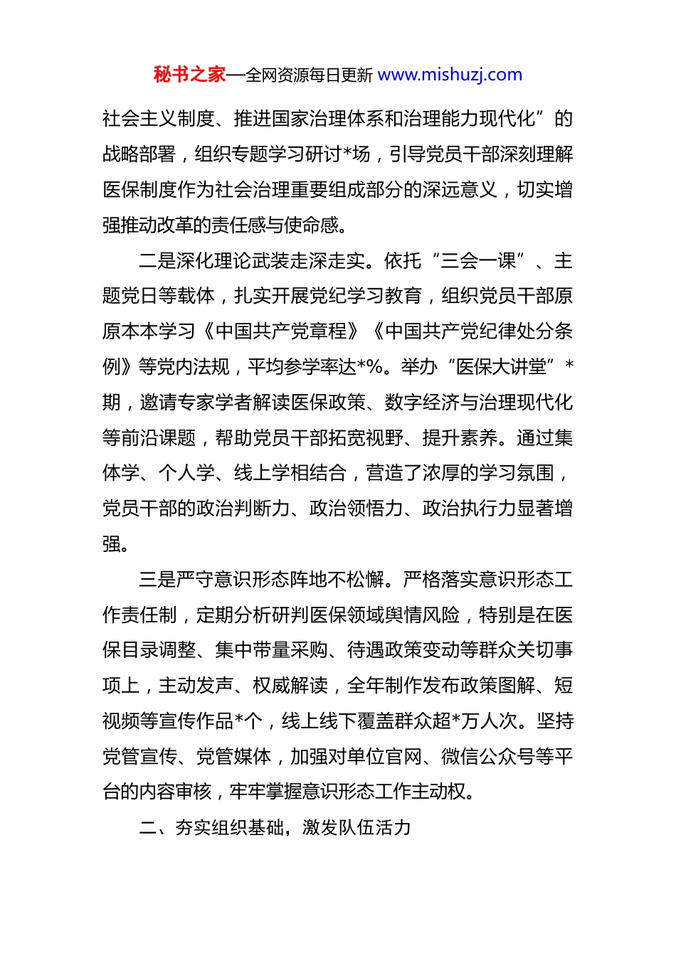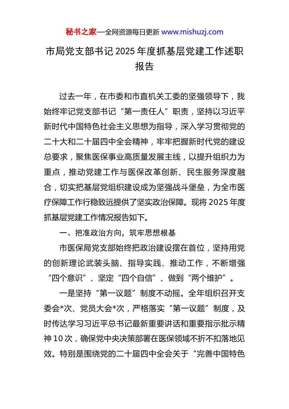 秘书之家—全网资源每日更新 www.mishuzj.com市局党支部书记 2025 年度抓基层党建工作述职报告 过去一年,在市委和市直机关工委的坚强领导下,我始终牢记党支部书记“第一责任人”职责,坚持以习近平新时代中国特色社会主义思想为指导,深入学习贯彻党的二十大和二十届四中全会精神,牢牢把握新时代党的建设总要求,聚焦医保事业高质量发展主线,以提升组织力为重点,推动党建工作与医保改革创新、民生服务深度融合,切实把基层党组织建设成为坚强战斗堡垒,为全市医疗保障工作行稳致远提供了坚实政治保障。现将 2025 年度抓基层党建工作情况报告如下。一、把准政治方向,筑牢思想根基市医保局党支部始终把政治建设摆在首位,坚持用党的创新理论武装头脑、指导实践、推动工作,不断增强“四个意识”、坚定“四个自信”、做到“两个维护”。一是坚持“第一议题”制度不动摇。全年组织召开支委会*次、党员大会*次,严格落实“第一议题”制度,及时传达学习习近平总书记最新重要讲话和重要指示批示精神 10 次,确保党中央决策部署在医保领域不折不扣落地见效。特别是围绕党的二十届四中全会关于“完善中国特色秘书之家—全网资源每日更新 www.mishuzj.com社会主义制度、推进国家治理体系和治理能力现代化”的战略部署,组织专题学习研讨*场,引导党员干部深刻理解医保制度作为社会治理重要组成部分的深远意义,切实增强推动改革的责任感与使命感。二是深化理论武装走深走实。依托“三会一课”、主题党日等载体,扎实开展党纪学习教育,组织党员干部原原本本学习《中国共产党章程》《中国共产党纪律处分条例》等党内法规,平均参学率达*%。举办“医保大讲堂”*期,邀请专家学者解读医保政策、数字经济与治理现代化等前沿课题,帮助党员干部拓宽视野、提升素养。通过集体学、个人学、线上学相结合,营造了浓厚的学习氛围,党员干部的政治判断力、政治领悟力、政治执行力显著增强。三是严守意识形态阵地不松懈。严格落实意识形态工作责任制,定期分析研判医保领域舆情风险,特别是在医保目录调整、集中带量采购、待遇政策变动等群众关切事项上,主动发声、权威解读,全年制作发布政策图解、短视频等宣传作品*个,线上线下覆盖群众超*万人次。坚持党管宣传、党管媒体,加强对单位官网、微信公众号等平台的内容审核,牢牢掌握意识形态工作主动权。二、夯实组织基础,激发队伍活力秘书之家—全网资源每日更新 www.mishuzj.com坚持把党支部建设作为基础工程来抓,持续推进标准化、规范化建设,不断提升基层党组织凝聚力和战斗力。一是规范组织生活提质增效。严格 执行“三会一课”、组织生活会、民主评议党员等制度,全年召开组织生活会*次,开展谈心谈话*人次,党员之间坦诚交流思想、查摆问题、明确方向。创新主题党日形式,组织开展“我为参保群众办实事”“医保政策进社区、进企业、进医院”等活动*场次,组织党员深入基层一线,面对面解答群众疑问、手把手指导操作流程,让组织生活有温度、接地气、见实效。二是发挥先锋作用示范引领。在医保支付方式改革、基金智能监管、异地就医结算等重点任务中设立“党员先锋岗”*个、“党员责任区”*个,组建党员突击队*支,引导党员干部在攻坚克难中亮身份、当先锋、作表率。在 DIP支付方式改革扩面工作中,党员骨干带头下沉医疗机构开展培训指导*次,协调解决实际问题*个,保障了改革平稳推进。全年有*名业务骨干向党组织递交入党申请书,*名同志被确定为发展对象,党员队伍结构持续优化。三是关心关爱干部凝聚人心。注重加强党员干部的思想动态掌握和心理疏导,定期开展谈心谈话,帮助解决工作生活中的实际困难。组织走访慰问困难党员、退休老党秘书之家—全网资源每日更新 www.mishuzj.com员*人次,传递组织温暖。积极营造团结协作、奋发有为的工作氛围,干部职工归属感、荣誉感不断增强,单位内部风清气正、干事创业的良好生态进一步巩固。三、聚焦主责主业,推动深度融合坚持围绕中心抓党建、抓好党建促业务,找准党建与医保工作的结合点,推动党建工作从“有形覆盖”向“有效引领”转变。一是以党建引领基金安全,守护群众“救...