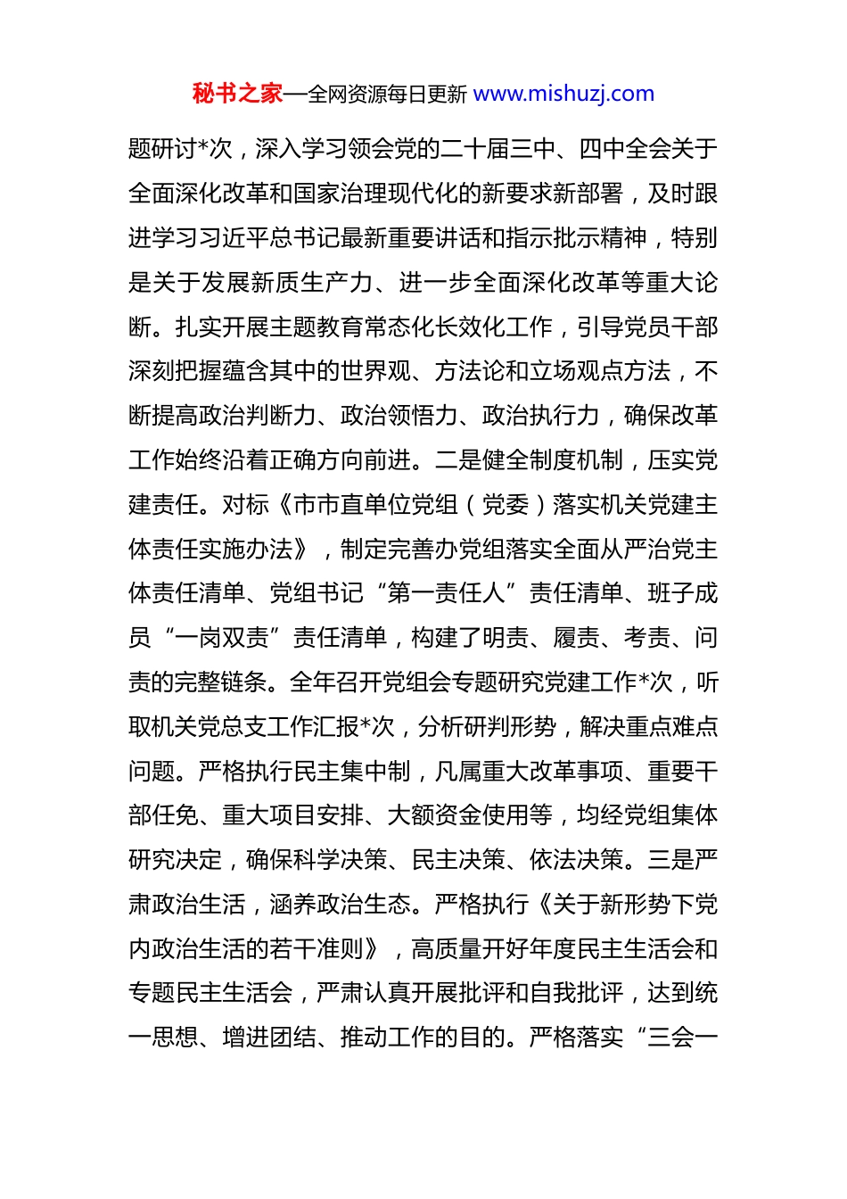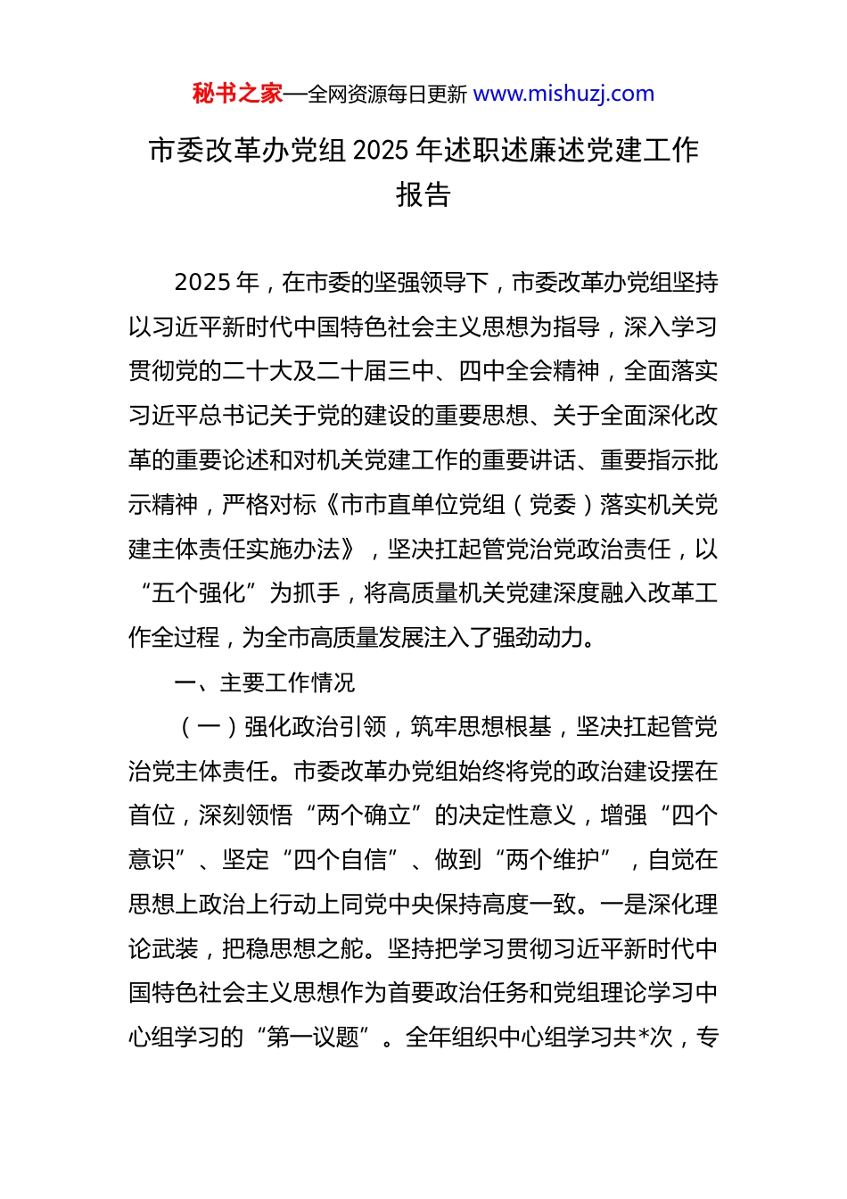 秘书之家—全网资源每日更新 www.mishuzj.com市委改革办党组 2025 年述职述廉述党建工作报告 2025 年,在市委的坚强领导下,市委改革办党组坚持以习近平新时代中国特色社会主义思想为指导,深入学习贯彻党的二十大及二十届三中、四中全会精神,全面落实习近平总书记关于党的建设的重要思想、关于全面深化改革的重要论述和对机关党建工作的重要讲话、重要指示批示精神,严格对标《市市直单位党组(党委)落实机关党建主体责任实施办法》,坚决扛起管党治党政治责任,以“五个强化”为抓手,将高质量机关党建深度融入改革工作全过程,为全市高质量发展注入了强劲动力。一、主要工作情况(一)强化政治引领,筑牢思想根基,坚决扛起管党治党主体责任。市委改革办党组始终将党的政治建设摆在首位,深刻领悟“两个确立”的决定性意义,增强“四个意识”、坚定“四个自信”、做到“两个维护”,自觉在思想上政治上行动上同党中央保持高度一致。一是深化理论武装,把稳思想之舵。坚持把学习贯彻习近平新时代中国特色社会主义思想作为首要政治任务和党组理论学习中心组学习的“第一议题”。全年组织中心组学习共*次,专秘书之家—全网资源每日更新 www.mishuzj.com题研讨*次,深入学习领会党的二十届三中、四中全会关于全面深化改革和国家治理现代化的新要求新部署,及时跟进学习习近平总书记最新重要讲话和指示批示精神,特别是关于发展新质生产力、进一步全面深化改革等重大论断。扎实开展主题教育常态化长效化工作,引导党员干部深刻把握蕴含其中的世界观、方法论和立场观点方法,不断提高政治判断力、政治领悟力、政治执行力,确保改革工作始终沿着正确方向前进。二是健全制度机制,压实党建责任。对标《市市直单位党组(党委)落实机关党建主体责任实施办法》,制定完善办党组落实全面从严治党主体责任清单、党组书记“第一责任人”责任清单、班子成员“一岗双责”责任清单,构建了明责、履责、考责、问责的完整链条。全年召开党组会专题研究党建工作*次,听取机关党总支工作汇报*次,分析研判形势,解决重点难点问题。严格执行民主集中制,凡属重大改革事项、重要干部任免、重大项目安排、大额资金使用等,均经党组集体研究决定,确保科学决策、民主决策、依法决策。三是严肃政治生活,涵养政治生态。严格执行《关于新形势下党内政治生活的若干准则》,高质量开好年度民主生活会和专题民主生活会,严肃认真开展批评和自我批评,达到统一思想、增进团结、推动工作的目的。严格落实“三会一秘书之家—全网资源每日更新 www.mishuzj.com课”、主题党日、组织生活会、民主评议党员、谈心谈话等制度,党组成员带头以普通党员身份参加所在支部活动,带头讲党课*次。加强党内政治文化建设,弘扬忠诚老实、公道正派、实事求是、清正廉洁等价值观,营造风清气正的良好政治生态。(二)聚焦主责主业,勇于攻坚克难,以高质量党建引领改革任务落地见效。市委改革办党组坚持围绕中心抓党建、抓好党建促业务,将党建优势转化为改革攻坚的强大动能,推动各项改革任务落地生根、开花结果。一是以制度建设为主线,构建改革落实“全链条”机制。强化顶层设计。深入学习领会习近平总书记关于狠抓落实的重要论述精神,全面贯彻中央深改委会议关于完善改革落实机制的部署要求,立足我市实际,牵头研究起草了《关于进一步抓好改革落实的若干措施》(以下简称《若干措施》)。《若干措施》经市委深改委会议审议通过后正式印发实施,成为全市抓改革落实的纲领性文件。创新机制举措。《若干措施》系统构建了涵盖改革任务“分类推进、常态调度、协同联动、督察问效、评估反馈、激励约束”六大方面、共 17 条具体措施的闭环管理体系。重点突出改革事前科学谋划与风险评估、事中高效协同与动态调整、事后成效评估与经验推广的全过程贯通,着力打造秘书之家—全网资源每日更新 www.mishuzj.com“全过程、高效率、可核实”的改革推进落实机制,有效破解改革落地“最后一公里”难题。细化操作规范。配套制定《若干措施》实施细则和操作指引,明确各项机制的责任主体、工作流程、时限要求和标准规范,确保...