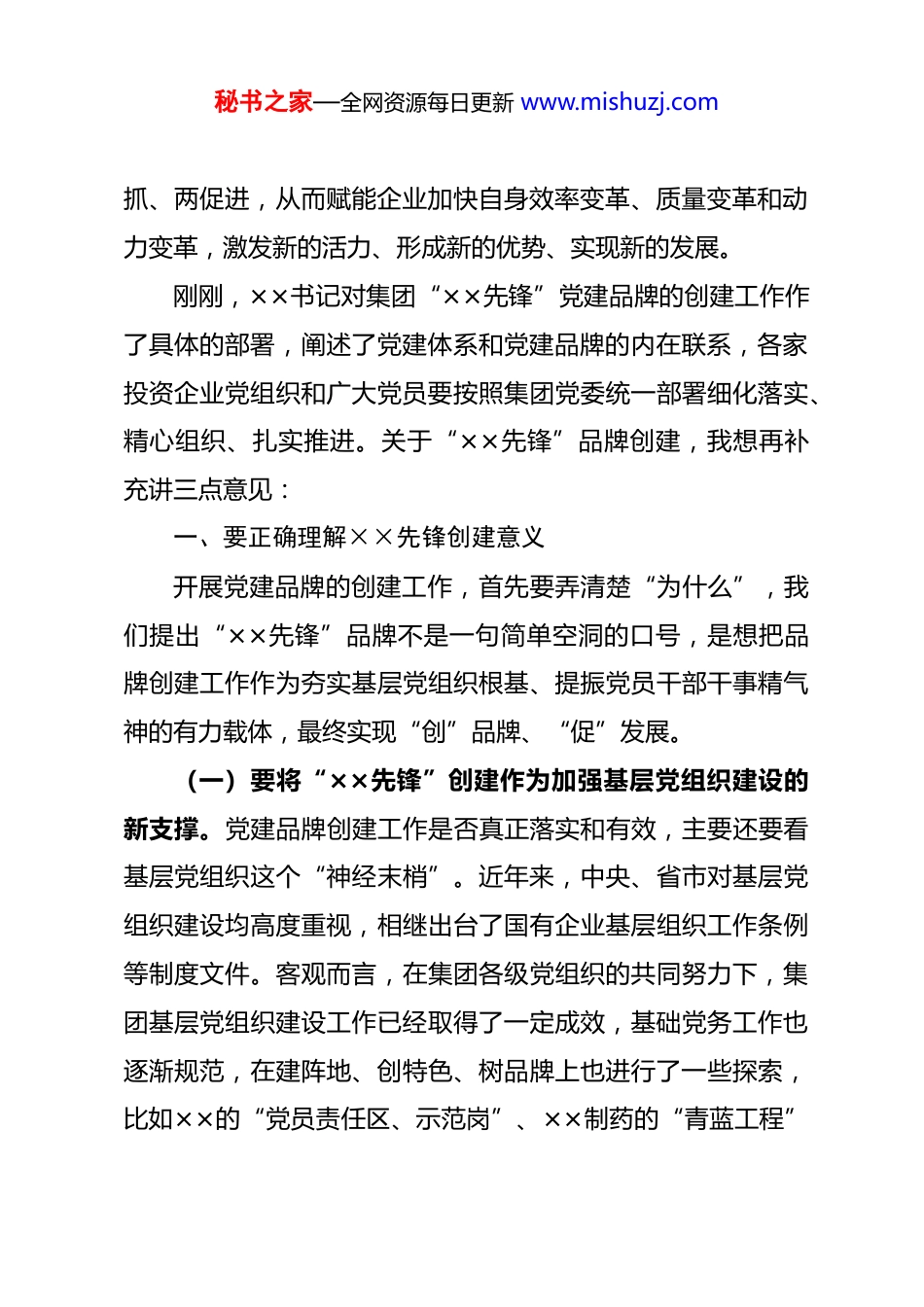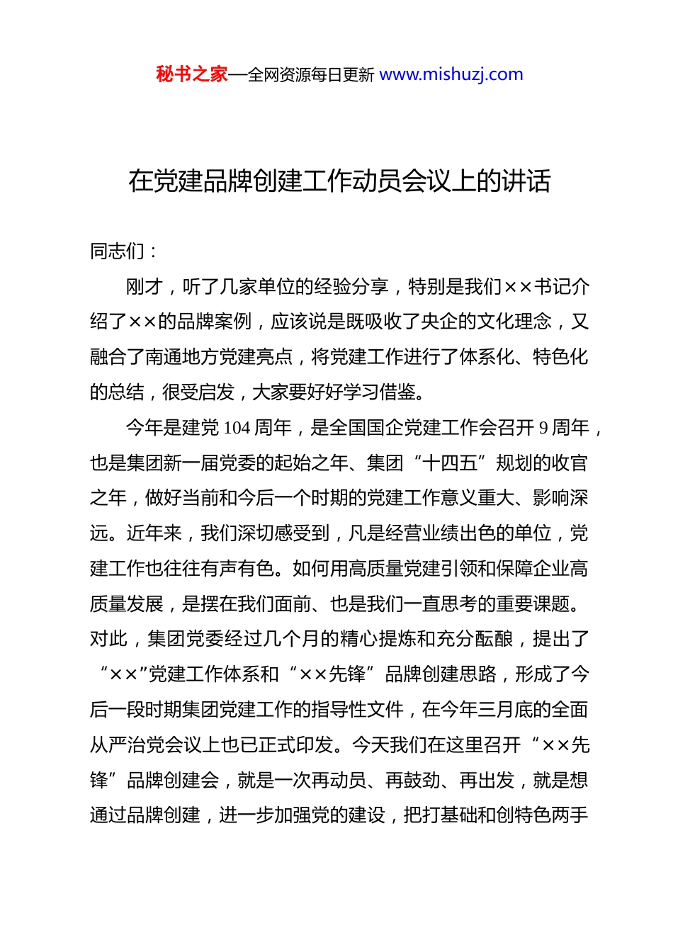 秘书之家—全网资源每日更新 www.mishuzj.com在党建品牌创建工作动员会议上的讲话同志们:刚才,听了几家单位的经验分享,特别是我们××书记介绍了××的品牌案例,应该说是既吸收了央企的文化理念,又融合了南通地方党建亮点,将党建工作进行了体系化、特色化的总结,很受启发,大家要好好学习借鉴。今年是建党 104 周年,是全国国企党建工作会召开 9 周年,也是集团新一届党委的起始之年、集团“十四五”规划的收官之年,做好当前和今后一个时期的党建工作意义重大、影响深远。近年来,我们深切感受到,凡是经营业绩出色的单位,党建工作也往往有声有色。如何用高质量党建引领和保障企业高质量发展,是摆在我们面前、也是我们一直思考的重要课题。对此,集团党委经过几个月的精心提炼和充分酝酿,提出了“××”党建工作体系和“××先锋”品牌创建思路,形成了今后一段时期集团党建工作的指导性文件,在今年三月底的全面从严治党会议上也已正式印发。今天我们在这里召开“××先锋”品牌创建会,就是一次再动员、再鼓劲、再出发,就是想通过品牌创建,进一步加强党的建设,把打基础和创特色两手秘书之家—全网资源每日更新 www.mishuzj.com抓、两促进,从而赋能企业加快自身效率变革、质量变革和动力变革,激发新的活力、形成新的优势、实现新的发展。刚刚,××书记对集团“××先锋”党建品牌的创建工作作了具体的部署,阐述了党建体系和党建品牌的内在联系,各家投资企业党组织和广大党员要按照集团党委统一部署细化落实、精心组织、扎实推进。关于“××先锋”品牌创建,我想再补充讲三点意见:一、要正确理解××先锋创建意义开展党建品牌的创建工作,首先要弄清楚“为什么”,我们提出“××先锋”品牌不是一句简单空洞的口号,是想把品牌创建工作作为夯实基层党组织根基、提振党员干部干事精气神的有力载体,最终实现“创”品牌、“促”发展。(一)要将“××先锋”创建作为加强基层党组织建设的新支撑。党建品牌创建工作是否真正落实和有效,主要还要看基层党组织这个“神经末梢”。近年来,中央、省市对基层党组织建设均高度重视,相继出台了国有企业基层组织工作条例等制度文件。客观而言,在集团各级党组织的共同努力下,集团基层党组织建设工作已经取得了一定成效,基础党务工作也逐渐规范,在建阵地、创特色、树品牌上也进行了一些探索,比如××的“党员责任区、示范岗”、××制药的“青蓝工程”秘书之家—全网资源每日更新 www.mishuzj.com等等,但总体还存在面上不平衡、特色不鲜明、“有盆景无风景”的问题。所以我们要把党建品牌的创建作为加强基层党组织建设的载体,将集团党建品牌创建工作从“点上盆景”向“面上风景”跃升。在执行“××”党建工作体系的基础上,更好地促进理论和实践紧密融合,党务与业务工作同行共步,通过有的放矢的开展创建活动,将品牌创建贯穿于基层党组织建设的全过程,进一步建强支部堡垒、强化党员担当,全面提升党组织组织力、凝聚力、战斗力,推动党建工作整体上水平,为企业做大做强提供坚实的组织保障。(二)要将“××先锋”创建作为提振干事创业精气神的新动力。不管是创建党建品牌还是发展企业,关键在人,要通过品牌的创建,引导全体干部职工将个人的发展自觉融入到党组织的建设和企业新一轮发展中来。创建党建品牌要不断加强党的创新理论的宣传教育,强化全体干部职工的理想信念,充分发挥广大党员骨干在工作中“打头阵、当先锋、做表率”的先锋引领作用,使党建工作成为推动发展实实在在的生产力。要把品牌创建过程,作为锤炼全体干部职工工作作风的过程,在大事急事面前要培养“撸起袖子加油干”、“越是艰险越向前”的坚强品质,在平常工作中,要坚持简单的事情重复做,重复的事情用心做,在平凡中追求卓越,以钉钉子精神把工作秘书之家—全网资源每日更新 www.mishuzj.com干出实效、展示风采。要通过扎实创建,增强党员干部职工对品牌文化的理解和感悟,引导党员自觉把品牌精神内化于心、外化于行,内强素质、外树形象,为全面达成企业“十四五”任务目标凝聚集体智慧、提振精神。(三)要将“××先锋...