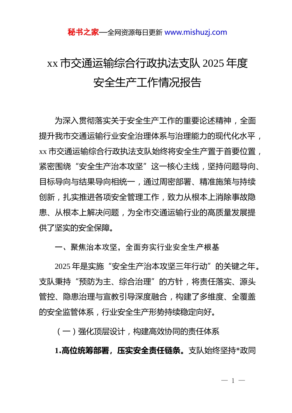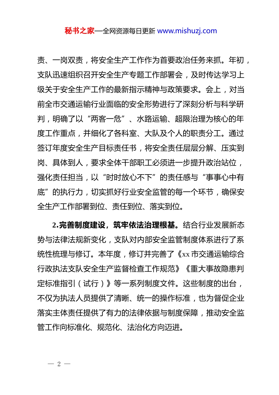 秘书之家—全网资源每日更新 www.mishuzj.comxx 市交通运输综合行政执法支队 2025 年度安全生产工作情况报告为深入贯彻落实关于安全生产工作的重要论述精神,全面提升我市交通运输行业安全治理体系与治理能力的现代化水平,xx 市交通运输综合行政执法支队始终将安全生产置于首要位置,紧密围绕“安全生产治本攻坚”这一核心主线,坚持问题导向、目标导向与结果导向相统一,通过周密部署、精准施策与持续创新,扎实推进各项安全管理工作,致力从根本上消除事故隐患、从根本上解决问题,为全市交通运输行业的高质量发展提供了坚实的安全保障。一、聚焦治本攻坚,全面夯实行业安全生产根基2025 年是实施“安全生产治本攻坚三年行动”的关键之年。支队秉持“预防为主、综合治理”的方针,将责任落实、源头管控、隐患治理与宣教引导深度融合,构建了多维度、全覆盖的安全监管体系,行业安全生产形势持续稳定向好。(一)强化顶层设计,构建高效协同的责任体系1.高位统筹部署,压实安全责任链条。支队始终坚持*政同— 1 —秘书之家—全网资源每日更新 www.mishuzj.com责、一岗双责,将安全生产工作作为首要政治任务来抓。年初,支队迅速组织召开安全生产专题工作部署会,及时传达学习上级关于安全生产工作的最新指示精神与政策要求。会上,对当前全市交通运输行业面临的安全形势进行了深刻分析与科学研判,明确了以“两客一危”、水路运输、超限治理为核心的年度工作重点,并细化了各科室、大队及个人的职责分工。通过签订年度安全生产目标责任书,将安全责任层层分解、压实到岗、具体到人,要求全体干部职工必须进一步提升政治站位,强化责任担当,以“时时放心不下”的责任感与“事事心中有底”的执行力,切实抓好行业安全监管的每一个环节,确保安全生产工作部署到位、责任到位、落实到位。2.完善制度建设,筑牢依法治理根基。结合行业发展新态势与法律法规新变化,支队对内部安全监管制度体系进行了系统性梳理与修订。本年度,修订并完善了《xx 市交通运输综合行政执法支队安全生产监督检查工作规范》《重大事故隐患判定标准指引(试行)》等一系列制度文件。这些制度的出台,不仅为执法人员提供了清晰、统一的操作标准,也为督促企业落实主体责任提供了有力的法律依据与制度保障,推动安全监管工作向标准化、规范化、法治化方向迈进。— 2 —秘书之家—全网资源每日更新 www.mishuzj.com(二)深化源头管控,提升企业本质安全水平1.实施精准帮扶,强化企业主体责任。为变“监管”为“服务”,变“处罚”为“预防”,支队创新工作模式,成立了多个由支队领导班子成员带队的督导帮扶专家小组。自 2025年 3 月起,各小组分片区对全市 120 家重点道路运输企业开展了为期三个月的“一对一”驻点式督导帮扶。帮扶工作聚焦企业安全生产主体责任的全面落实,围绕以下关键环节展开:全员安全生产责任制:重点检查并指导企业建立从主要负责人到一线从业人员的全员安全生产责任清单,确保责任制不仅“挂在墙上”,更能“落在实处”。重大事故隐患排查整治:协助企业对照《重大事故隐患判定标准》,开展系统性风险辨识与隐患自查自纠,建立隐患台账,明确整改责任人、措施与时限。治本攻坚行动推进:对照“安全生产治本攻坚三年行动”方案,指导企业逐项落实任务,特别是在安全设施设备更新、技术改造等方面提供政策咨询与技术支持。应急预案体系建设:帮助企业完善应急预案,并组织开展了至少 2 次覆盖不同场景的应急演练,检验预案的科学性与可— 3 —秘书之家—全网资源每日更新 www.mishuzj.com操作性,提升应急处置能力。通过精准帮扶,有效推动了企业安全管理体系的规范化、常态化运行,显著提升了企业的自主安全管理水平与风险防控能力。2.狠抓资质管理,严把行业准入关口。支队严格执行从业人员与运输工具的准入标准,从源头上防范安全风险。在从业人员管理方面,全年累计核查“两客一危”驾驶员、押运员等重点岗位从业人员资质信息 8000 余人次,确保所有从业人员持证上岗、人证相符。督促企业严格落实“一人一档”管理制度,动态记录从业人员的安全培训、违...