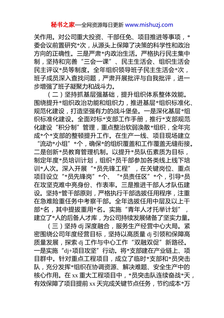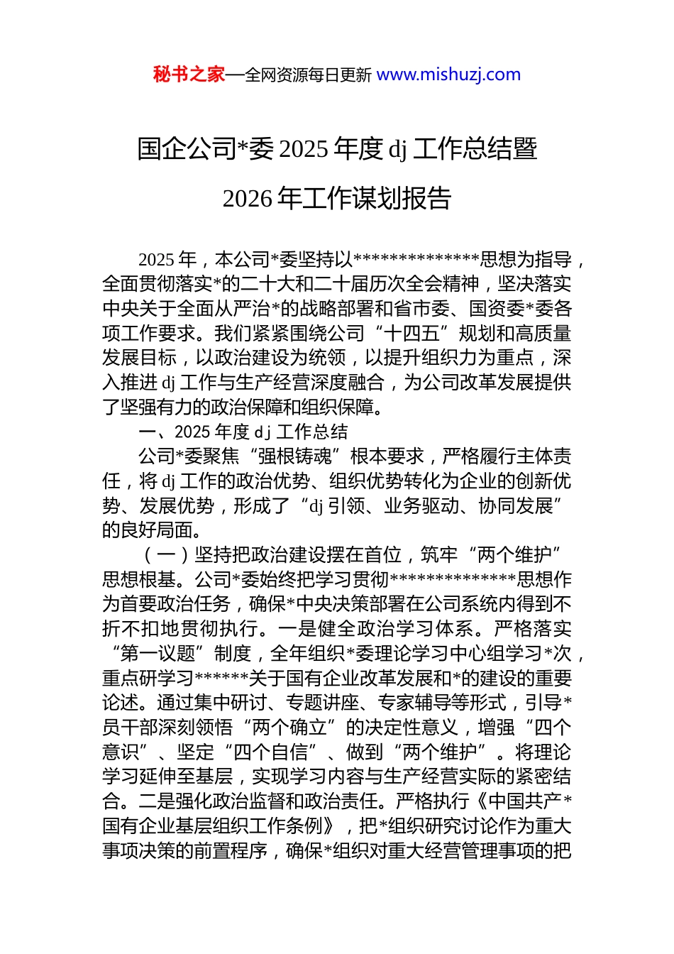 秘书之家—全网资源每日更新 www.mishuzj.com国企公司*委 2025 年度 dj 工作总结暨2026 年工作谋划报告2025 年,本公司*委坚持以**************思想为指导,全面贯彻落实*的二十大和二十届历次全会精神,坚决落实中央关于全面从严治*的战略部署和省市委、国资委*委各项工作要求。我们紧紧围绕公司“十四五”规划和高质量发展目标,以政治建设为统领,以提升组织力为重点,深入推进 dj 工作与生产经营深度融合,为公司改革发展提供了坚强有力的政治保障和组织保障。一、2025 年度 dj 工作总结公司*委聚焦“强根铸魂”根本要求,严格履行主体责任,将 dj 工作的政治优势、组织优势转化为企业的创新优势、发展优势,形成了“dj 引领、业务驱动、协同发展”的良好局面。(一)坚持把政治建设摆在首位,筑牢“两个维护”思想根基。公司*委始终把学习贯彻**************思想作为首要政治任务,确保*中央决策部署在公司系统内得到不折不扣地贯彻执行。一是健全政治学习体系。严格落实“第一议题”制度,全年组织*委理论学习中心组学习*次,重点研学习******关于国有企业改革发展和*的建设的重要论述。通过集中研讨、专题讲座、专家辅导等形式,引导*员干部深刻领悟“两个确立”的决定性意义,增强“四个意识”、坚定“四个自信”、做到“两个维护”。将理论学习延伸至基层,实现学习内容与生产经营实际的紧密结合。二是强化政治监督和政治责任。严格执行《中国共产*国有企业基层组织工作条例》,把*组织研究讨论作为重大事项决策的前置程序,确保*组织对重大经营管理事项的把秘书之家—全网资源每日更新 www.mishuzj.com关作用。对公司重大投资、干部任免、项目推进等事项,*委会议前置研究*次,从源头上保障了决策的科学性和政治方向的正确性。三是严肃*内政治生活。严格执行民主集中制,坚持和完善“三会一课”、民主生活会、组织生活会民主评议*员等制度。全年组织领导班子民主生活会*次,班子成员深入查找问题,严肃开展批评与自我批评,进一步增强了班子凝聚力和战斗力。(二)坚持抓基层强基础,提升组织体系整体效能。围绕提升*组织政治功能和组织力,推进基层*组织标准化、规范化建设,打造坚强有力的战斗堡垒。一是深化基层*组织标准化建设。全面对标*支部工作手册,推行*支部规范化建设“积分制”管理,重点整治软弱涣散*组织,全年完成*个*支部的整顿提升工作。在生产一线、项目现场建立“流动*小组”*个,确保*的组织覆盖和工作覆盖无缝衔接。二是创新*员教育管理机制。以提升*员队伍素质为目标,制定年度*员培训计划,组织*员干部参加各类线上线下培训*人次。深入开展“*员先锋工程”,在关键岗位、重点项目设立“*员先锋岗”*个、“*员责任区”*个,引导*员在攻坚克难中亮身份、作表率。三是推进干部人才队伍建设。坚持*管干部原则,严格执行干部选拔任用程序,注重在急难险重任务中考察干部。全年选拔任用中层及以上干部*名,其中提拔重用*名。实施“青年人才托举计划”,建立了*人的后备人才库,为公司持续发展储备了坚实力量。(三)坚持 dj 深度融合,服务生产经营中心大局。紧密围绕公司年度经营目标,坚持以高质量 dj 引领和保障高质量发展,探索 dj 工作与中心工作“双融双促”新路径。一是实施“dj+项目攻坚”行动。将*支部建在产业链上、项目群中。针对重点工程项目,成立了临时*支部和*员突击队,充分发挥*组织在协调资源、解决难题、安全生产中的核心作用。在 xx 重大工程项目中,*员突击队连续奋战*天,有效保障了项目提前 xx 天完成关键节点任务,节约成本*万秘书之家—全网资源每日更新 www.mishuzj.com元。二是推动创新发展融入 dj。将 dj 主题活动与技术创新、提质增效相结合,开展“金点子”征集活动和“技术比武”竞赛,其中*项创新成果在公司得到推广应用,产生了显著的经济效益。积极引导*员工程师在解决“卡脖子”技术难题中发挥作用,全年由*员骨干牵头申报专利 xx 项。三是助力深化国企改革。*委发挥政治引领作用,主动研判改革中的思想动态和风险点,确保各项改革措施平稳落地。在推进“三项制度”改革中,各*支部...