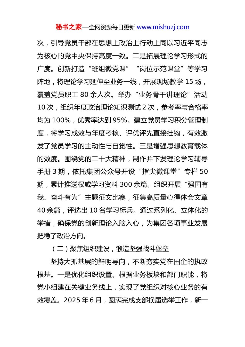 秘书之家—全网资源每日更新 www.mishuzj.com集团某部党支部书记 2025 年度抓基层党建工作述职报告 2025 年是全面贯彻落实党的二十大精神的关键之年,也是实施“十四五”规划的收官之年。一年来,作为**集团**部党支部书记,我严格履行抓基层党建第一责任人职责,坚持以习近平新时代中国特色社会主义思想为指导,深入学习贯彻党的二十大和二十届三中、四中全会精神,全面落实新时代党的建设总要求,紧密结合集团改革发展与部门中心工作实际,以提升组织力为重点,着力推动党建工作与业务工作深度融合,为集团高质量发展提供了坚强的政治保证和组织保障。现将履职情况报告如下。一、2025 年度抓基层党建工作主要成效(一)聚焦政治引领,筑牢思想理论根基始终把党的政治建设摆在首位,确保支部工作方向不偏、焦点不散。一是突出政治理论学习的深度。严格落实“第一议题”制度和“三会一课”制度,全年组织支委会集中学习 24 次,专题学习研讨习近平总书记重要讲话和重要指示批示精神 30 余篇,确保党的创新理论第一时间传达、第一时间学习。组织全体党员赴**红色教育基地开展沉浸式教学 1 次,举行“重温入党誓词”等政治仪式 2秘书之家—全网资源每日更新 www.mishuzj.com次,引导党员干部在思想上政治上行动上同以习近平同志为核心的党中央保持高度一致。二是拓展理论学习形式的广度。创新打造“班组微党课”“岗位示范课堂”等学习阵地,将理论学习延伸至业务一线,开展现场教学 15 场,覆盖党员职工 80 余人次。举办“业务骨干讲理论”活动10 次,组织年度政治理论知识测试 2 次,参考率与合格率均为 100%,优秀率达到 95%。建立党员学习积分管理制度,将学习成效与年度考核、评优评先直接挂钩,有效激发了党员学习的主动性与自觉性。三是增强思想教育载体的效度。围绕党的二十大精神,制作并下发理论学习辅导手册 3 期,依托集团公众号开设“指尖微课堂”专栏 50期,累计推送权威学习资料 300 余篇。组织开展“强国有我、奋斗有为”主题征文比赛,征集高质量心得体会文章40 余篇,评选出 10 名学习标兵。通过系列化、立体化的举措,确保党的创新理论入脑入心,为集团各项事业发展把稳了政治方向。(二)聚焦组织建设,锻造坚强战斗堡垒坚持大抓基层的鲜明导向,不断夯实党在国企的执政根基。一是优化组织设置。根据业务板块和部门职能,将党小组建在关键业务线上,实现了党组织对核心业务的有效覆盖。2025 年 6 月,圆满完成支部换届选举工作,新一秘书之家—全网资源每日更新 www.mishuzj.com届支委会成员中,业务骨干占比达到 80%,平均年龄 38岁,本科以上学历占比 100%,班子结构更加优化、战斗力显著增强。二是严格党员管理。严格遵循“控制总量、优化结构、提高质量、发挥作用”的总要求,全年重点发展生产一线和关键技术岗位骨干 2 名成为预备党员,培养入党积极分子 5 名。深入开展“党员先锋指数”量化考评,设立党员责任区 8 个、党员示范岗 15 个,实现了关键核心岗位党员 100%覆盖,有效激励党员在急难险重任务中亮身份、当先锋、作表率。三是建强活动阵地。全年规范召开党员大会 4 次、支委会 24 次、党小组会 48 次,高质量开展主题党日活动 12 次。支部成功获评市级“五星级党支部”荣誉称号,3 名党员荣获集团“技术能手”称号。投入专项资金升级改造党员活动室 1 个,购置专业书籍300 余册,完善了电教设备等硬件设施,显著提升了组织生活的质量和吸引力。(三)聚焦深度融合,赋能企业高质量发展坚持围绕中心抓党建、抓好党建促业务,推动党建工作与生产经营同频共振。一是创新融合工作机制。建立并推行“党建+业务”双向融合清单化管理模式,将党建工作要求有机嵌入业务流程、项目管理和绩效考核全过程,梳理制定年度融合任务清单 25 项。组织开展“技术攻关党旗秘书之家—全网资源每日更新 www.mishuzj.com红”专项行动,成立党员技术攻关小组 5 个,成功解决长期困扰生产经营的技术难题 12 项,直接创造经济效益超过300 万元。二是搭建融合活动平台。广泛开展“我为发展献一策”金点...