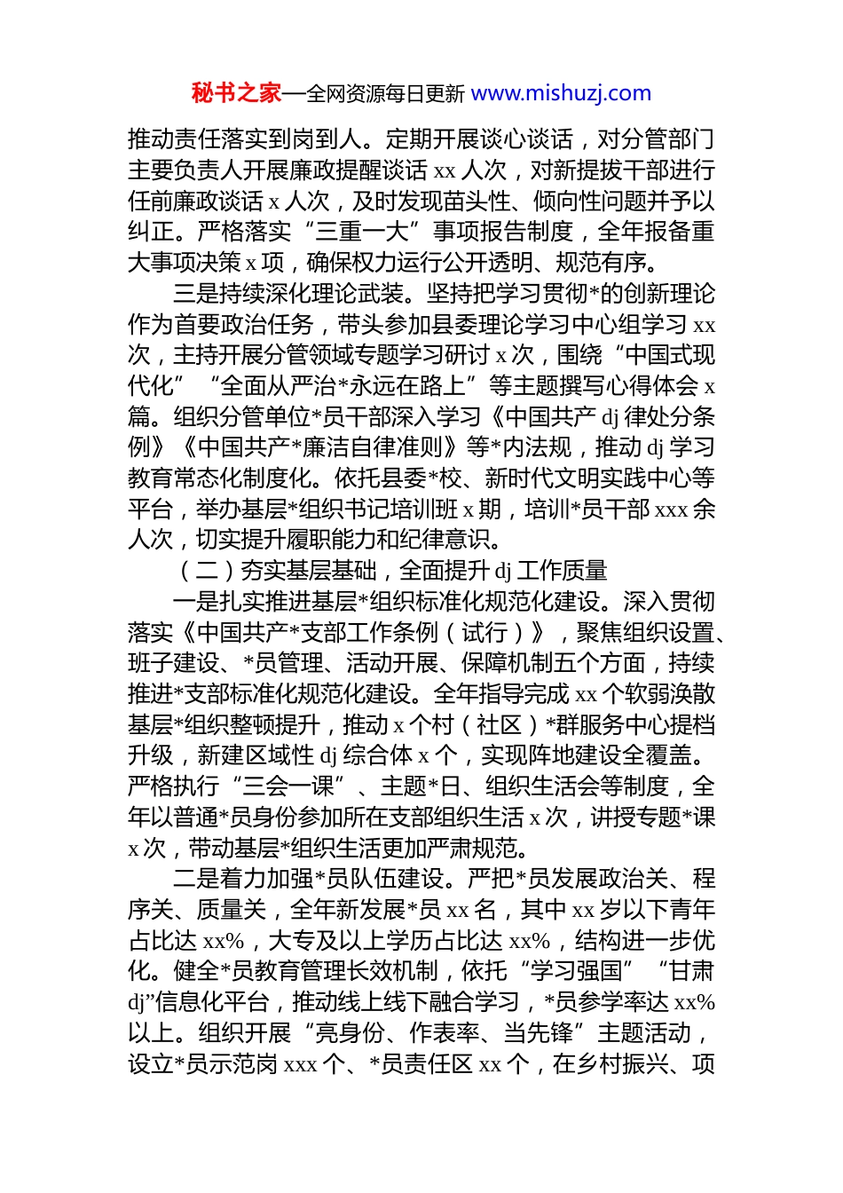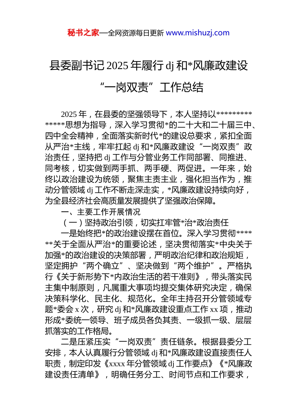 秘书之家—全网资源每日更新 www.mishuzj.com县委副书记 2025 年履行 dj 和*风廉政建设“一岗双责”工作总结2025 年,在县委的坚强领导下,本人坚持以**************思想为指导,深入学习贯彻*的二十大和二十届三中、四中全会精神,全面落实新时代*的建设总要求,紧扣全面从严治*主线,牢牢扛起 dj 和*风廉政建设“一岗双责”政治责任,坚持把 dj 工作与分管业务工作同部署、同推进、同考核,切实做到两手抓、两手硬、两促进。一年来,始终以政治建设为统领,聚焦主责主业,强化担当作为,推动分管领域 dj 工作不断走深走实,*风廉政建设持续向好,为全县经济社会高质量发展提供了坚强政治保障。一、主要工作开展情况(一)坚持政治引领,切实扛牢管*治*政治责任一是始终把*的政治建设摆在首位。深入学习贯彻******关于全面从严治*的重要论述,坚决贯彻落实*中央关于加强*的政治建设的决策部署,严明政治纪律和政治规矩,坚定拥护“两个确立”、坚决做到“两个维护”。严格执行《关于新形势下*内政治生活的若干准则》,带头落实民主集中制原则,凡属重大事项均提交集体研究决定,确保决策科学化、民主化、规范化。全年主持召开分管领域专题*委会 x 次,研究 dj 和*风廉政建设重点工作 xx 项,推动形成*委统一领导、班子成员各负其责、一级抓一级、层层抓落实的工作格局。二是压紧压实“一岗双责”责任链条。根据县委分工安排,本人认真履行分管领域 dj 和*风廉政建设直接责任人职责,制定印发《xxxx 年分管领域 dj 工作要点》《*风廉政建设责任清单》,明确任务分工、时间节点和工作要求,秘书之家—全网资源每日更新 www.mishuzj.com推动责任落实到岗到人。定期开展谈心谈话,对分管部门主要负责人开展廉政提醒谈话 xx 人次,对新提拔干部进行任前廉政谈话 x 人次,及时发现苗头性、倾向性问题并予以纠正。严格落实“三重一大”事项报告制度,全年报备重大事项决策 x 项,确保权力运行公开透明、规范有序。三是持续深化理论武装。坚持把学习贯彻*的创新理论作为首要政治任务,带头参加县委理论学习中心组学习 xx次,主持开展分管领域专题学习研讨 x 次,围绕“中国式现代化”“全面从严治*永远在路上”等主题撰写心得体会 x篇。组织分管单位*员干部深入学习《中国共产 dj 律处分条例》《中国共产*廉洁自律准则》等*内法规,推动 dj 学习教育常态化制度化。依托县委*校、新时代文明实践中心等平台,举办基层*组织书记培训班 x 期,培训*员干部 xxx 余人次,切实提升履职能力和纪律意识。(二)夯实基层基础,全面提升 dj 工作质量一是扎实推进基层*组织标准化规范化建设。深入贯彻落实《中国共产*支部工作条例(试行)》,聚焦组织设置、班子建设、*员管理、活动开展、保障机制五个方面,持续推进*支部标准化规范化建设。全年指导完成 xx 个软弱涣散基层*组织整顿提升,推动 x 个村(社区)*群服务中心提档升级,新建区域性 dj 综合体 x 个,实现阵地建设全覆盖。严格执行“三会一课”、主题*日、组织生活会等制度,全年以普通*员身份参加所在支部组织生活 x 次,讲授专题*课x 次,带动基层*组织生活更加严肃规范。二是着力加强*员队伍建设。严把*员发展政治关、程序关、质量关,全年新发展*员 xx 名,其中 xx 岁以下青年占比达 xx%,大专及以上学历占比达 xx%,结构进一步优化。健全*员教育管理长效机制,依托“学习强国”“甘肃dj”信息化平台,推动线上线下融合学习,*员参学率达 xx%以上。组织开展“亮身份、作表率、当先锋”主题活动,设立*员示范岗 xxx 个、*员责任区 xx 个,在乡村振兴、项秘书之家—全网资源每日更新 www.mishuzj.com目建设、基层治理一线发挥先锋模范作用。深化农村*员“双带头”行动,培育致富带头人*员 xx 名,带动群众发展特色种植养殖项目 xx 个,户均年增收超 x.x 万元。三是创新推进 dj 引领基层治理。坚持把 dj 贯穿基层治理全过程,深化“dj+网格”管理模式,全县划分城乡网格xxxx 个,配备专兼职网格员 xxxx 名,实现“人在格中走、事在格中办”。推广“红色...
