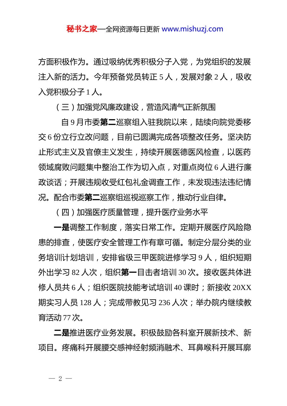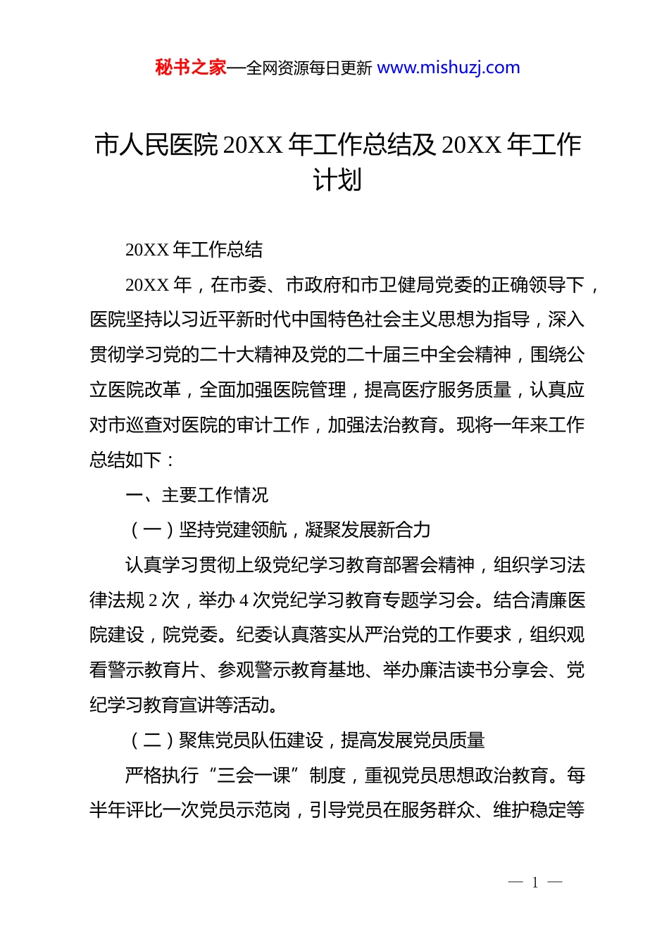 秘书之家—全网资源每日更新 www.mishuzj.com市人民医院 20XX 年工作总结及 20XX 年工作计划20XX 年工作总结20XX 年,在市委、市政府和市卫健局党委的正确领导下,医院坚持以习近平新时代中国特色社会主义思想为指导,深入贯彻学习党的二十大精神及党的二十届三中全会精神,围绕公立医院改革,全面加强医院管理,提高医疗服务质量,认真应对市巡查对医院的审计工作,加强法治教育。现将一年来工作总结如下:一、主要工作情况(一)坚持党建领航,凝聚发展新合力认真学习贯彻上级党纪学习教育部署会精神,组织学习法律法规 2 次,举办 4 次党纪学习教育专题学习会。结合清廉医院建设,院党委。纪委认真落实从严治党的工作要求,组织观看警示教育片、参观警示教育基地、举办廉洁读书分享会、党纪学习教育宣讲等活动。(二)聚焦党员队伍建设,提高发展党员质量严格执行“三会一课”制度,重视党员思想政治教育。每半年评比一次党员示范岗,引导党员在服务群众、维护稳定等— 1 —秘书之家—全网资源每日更新 www.mishuzj.com方面积极作为。通过吸纳优秀积极分子入党,为党组织的发展注入新的活力。今年预备党员转正 5 人,发展对象 2 人,吸收入党积极分子 1 人。(三)加强党风廉政建设,营造风清气正新氛围 自 9 月市委第二巡察组入驻我院以来,陆续向院党委移交 6 份立行立改问题,目前已圆满完成各项整改任务。坚决防止形式主义及官僚主义发生,持续开展医德医风检查,以医药领域腐败问题集中整治工作为切入点,对重点岗位 6 人进行廉政谈话;开展违规收受红包礼金调查工作,未发现违法违纪情况。配合市委第二巡察组巡视巡察工作,推动行业自律。(四)加强医疗质量管理,提升医疗业务水平一是调整工作制度,落实日常工作。定期开展医疗风险隐患的排查,使医疗安全管理工作有章可循。制定分层分类的业务培训计划培训,安排省级三甲医院进修学习 9 人,组织短期外出学习 82 人次,组织第一目击者培训 30 次。接收医共体进修人员共 6 人;组织医院技能考试培训 40 课时;新接收 20XX期实习人员 128 人;完成带教见习 236 人次;举办院内继续教育活动 77 次。二是推进医疗业务发展。积极鼓励各科室开展新技术、新项目。疼痛科开展腰交感神经射频消融术、耳鼻喉科开展耳廓— 2 —秘书之家—全网资源每日更新 www.mishuzj.com畸形矫形术、鼻前庭肿物切除术、超声科联合骨二科开展超声引导下椎间孔阻滞治疗神经根性腰腿疼等。建立日间护理服务,开展儿科日间输液、日间雾化、日间蓝光治疗,为患者提供更加灵活、个性化的医疗护理服务。三是加强护理管理,提升护理质量新高度。召开护理质量管理委员会会议 13 次,加强护理人员的专业培训,共选送 50名护理骨干参加各类短期学习培训和进修,护士院外培训率16.4%。完成了“三基”培训任务,共组织了 10 次三基理论考试,参考率 100%,考试合格率 99.7%。组织开展 5 次业务知识讲座,10 次护理业务、教学查房。四是创新服务理念,提升患者就医体验。优化门诊流程设计,提供多种付费渠道,推行“一次就诊一次付费”;为门诊病人提供爱心雨伞、针线盒、轮椅/平车、母婴室、尿布台等设施设备和便民措施;提供免费 120 车接诊服务,接诊三无、急危重症患者实行先诊疗后付费的服务流程,提升患者急诊急救体验;为无陪人患者就诊提供无偿陪护检查等服务,为留观输液患者提供输液报警器,有效降低药液滴空、减少回血的发生率;进一步推行入院手续办理、医保审核、出院结算、出院患者健康教育等系列流程在护士站“一站式”服务。(五)破局医疗资源不均,创新服务理念— 3 —秘书之家—全网资源每日更新 www.mishuzj.com1、破局医疗资源不均,大力推进紧密型医共体建设。牵头制定 XX 市医共体运行机制,开展上下联动的医疗服务。累计开展 24 次医疗活动,服务群众约 6000 人次,双向转诊患者约450 人次。优化总院医疗资源配置,精简科室及中层干部,整合医疗资源、推动分级诊疗、使优质医疗资源下沉。向吉凤街道社区卫生服务中心及市中医院派驻医护 19 人;定期派遣医疗专...