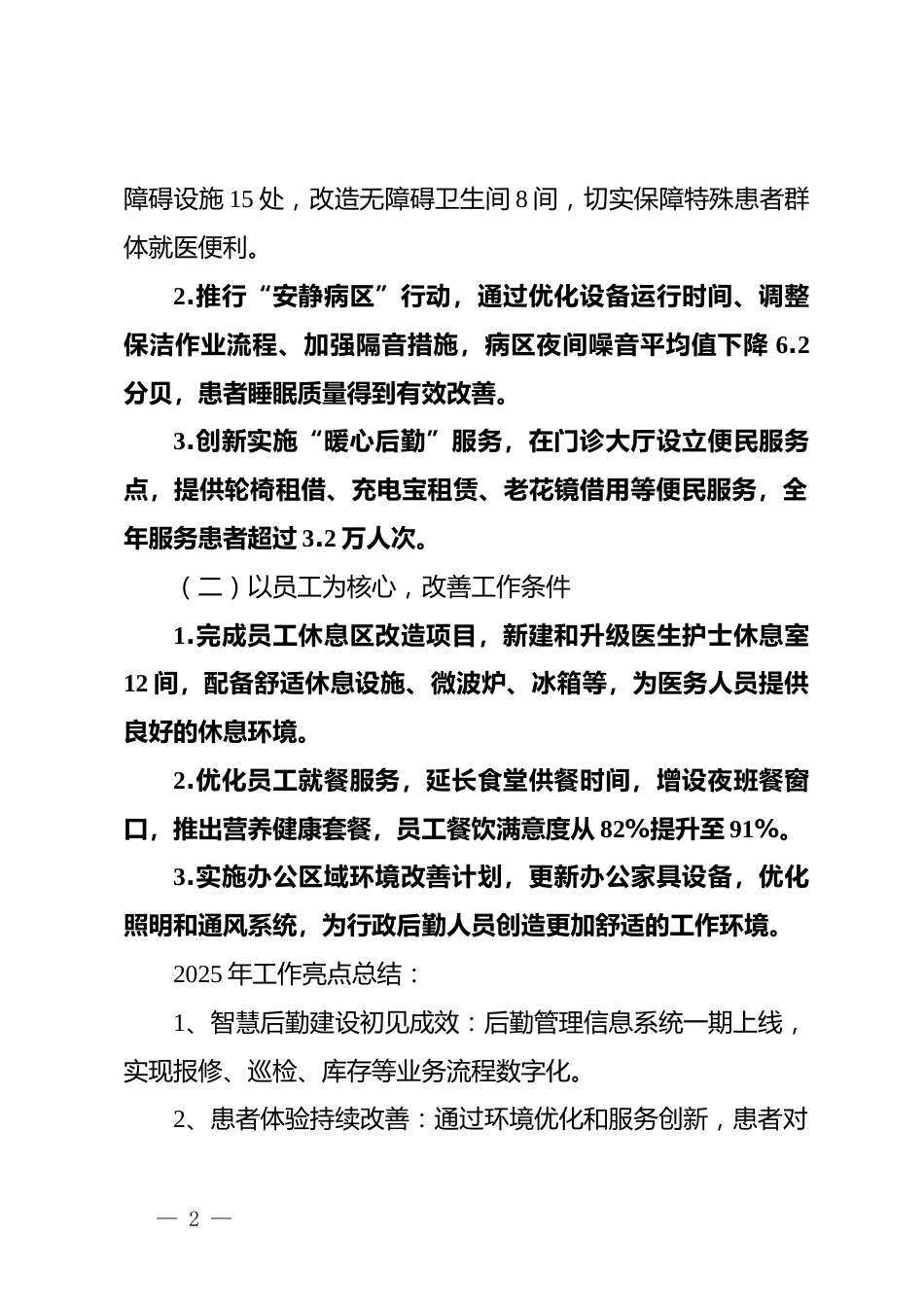 秘书之家—全网资源每日更新 www.mishuzj.comXX 医院总务科 2025 年工作总结与 2026 年工作计划第一部分:2025 年工作总结一、年度工作总体概述2025 年,医院总务科在院党委和院领导的正确领导下,深入贯彻'以患者为中心,以员工为核心'的服务理念,紧紧围绕医院年度工作目标,以提升后勤服务质量为主线,以保障医疗安全为重点,全面加强后勤精细化、标准化、智能化管理。通过全体后勤员工的共同努力,圆满完成了各项工作任务,为医院医疗业务的顺利开展提供了坚实可靠的后勤保障。主要工作成效数据统计:1、后勤服务满意度:96.5%(较去年提升 2.3%)2、设备故障率:降低 18%(同比下降明显)3、能源节约成效:水电燃气综合节约 12.7%4、应急响应时间:≤8 分钟(关键区域平均响应)二、主要工作成效与亮点(一)以患者为中心,优化就医环境1.实施门诊楼环境改造工程,完成候诊区座椅更新、标识系统优化、照明系统升级,患者候诊舒适度显著提升。新增无— 1 —障碍设施 15 处,改造无障碍卫生间 8 间,切实保障特殊患者群体就医便利。2.推行“安静病区”行动,通过优化设备运行时间、调整保洁作业流程、加强隔音措施,病区夜间噪音平均值下降 6.2分贝,患者睡眠质量得到有效改善。3.创新实施“暖心后勤”服务,在门诊大厅设立便民服务点,提供轮椅租借、充电宝租赁、老花镜借用等便民服务,全年服务患者超过 3.2 万人次。(二)以员工为核心,改善工作条件1.完成员工休息区改造项目,新建和升级医生护士休息室12 间,配备舒适休息设施、微波炉、冰箱等,为医务人员提供良好的休息环境。2.优化员工就餐服务,延长食堂供餐时间,增设夜班餐窗口,推出营养健康套餐,员工餐饮满意度从 82%提升至 91%。3.实施办公区域环境改善计划,更新办公家具设备,优化照明和通风系统,为行政后勤人员创造更加舒适的工作环境。2025 年工作亮点总结:1、智慧后勤建设初见成效:后勤管理信息系统一期上线,实现报修、巡检、库存等业务流程数字化。2、患者体验持续改善:通过环境优化和服务创新,患者对— 2 —秘书之家—全网资源每日更新 www.mishuzj.com后勤服务的投诉率下降 42%。3、员工满意度显著提升:后勤保障员工满意度调查得分达92.5 分,创历史新高。4、应急保障能力增强:在多次突发公共卫生事件中,后勤保障迅速到位,得到临床科室一致好评。三、存在的问题与不足1.后勤信息化水平仍有提升空间,各系统间数据共享不充分,智慧化管理有待深化。2.部分老旧建筑基础设施老化严重,维修维护成本逐年增加,亟待系统性改造。3.后勤队伍专业化水平不均衡,高技术技能人才相对缺乏,影响服务质量的持续提升。4.节能技术应用覆盖面不够广,新能源利用比例偏低,绿色医院建设任重道远。5.后勤服务精细化程度有待提高,个性化、差异化服务供给能力不足。第二部分:2026 年工作计划一、指导思想与工作目标指导思想:深入贯彻落实'以患者为中心,以员工为核心'的服务理念,以推动医院高质量发展为主题,以智慧后勤建设为— 3 —主线,以精细化管理为抓手,全面提升后勤保障能力和服务水平,为医院建设与发展提供坚实支撑。总体目标:1.患者后勤服务满意度达到 98%以上,员工后勤保障满意度达到 95%以上。2.医疗设备完好率保持在 98%以上,关键设备应急响应时间不超过 5 分钟。3.实现能源消耗总量下降 5%,单位建筑面积能耗下降8%。4.安全生产零事故,安全隐患整改率达到 100%。5.智慧后勤系统覆盖率达到 80%,主要业务流程实现数字化管理。二、重点任务与措施(一)深化“以患者为中心”服务创新1.实施'舒适就医'环境提升工程:对门诊、急诊、医技等公共区域进行环境美化改造,引入绿色植物墙、艺术装饰等元素,营造温馨就医氛围。2.推进'无声后勤'服务模式:进一步优化设备运行和作业流程,严格控制病区噪音,确保患者休息环境安静舒适。3.拓展便民服务内容:在现有便民服务基础上,增设母婴— 4 —秘书之家—全网资源每日更新 www.mishuzj.com护理室、患者休闲书吧、电子导览系统等,提升患者就医体验。4.建立患者需求快速响应机制:通过信息化手段收集...