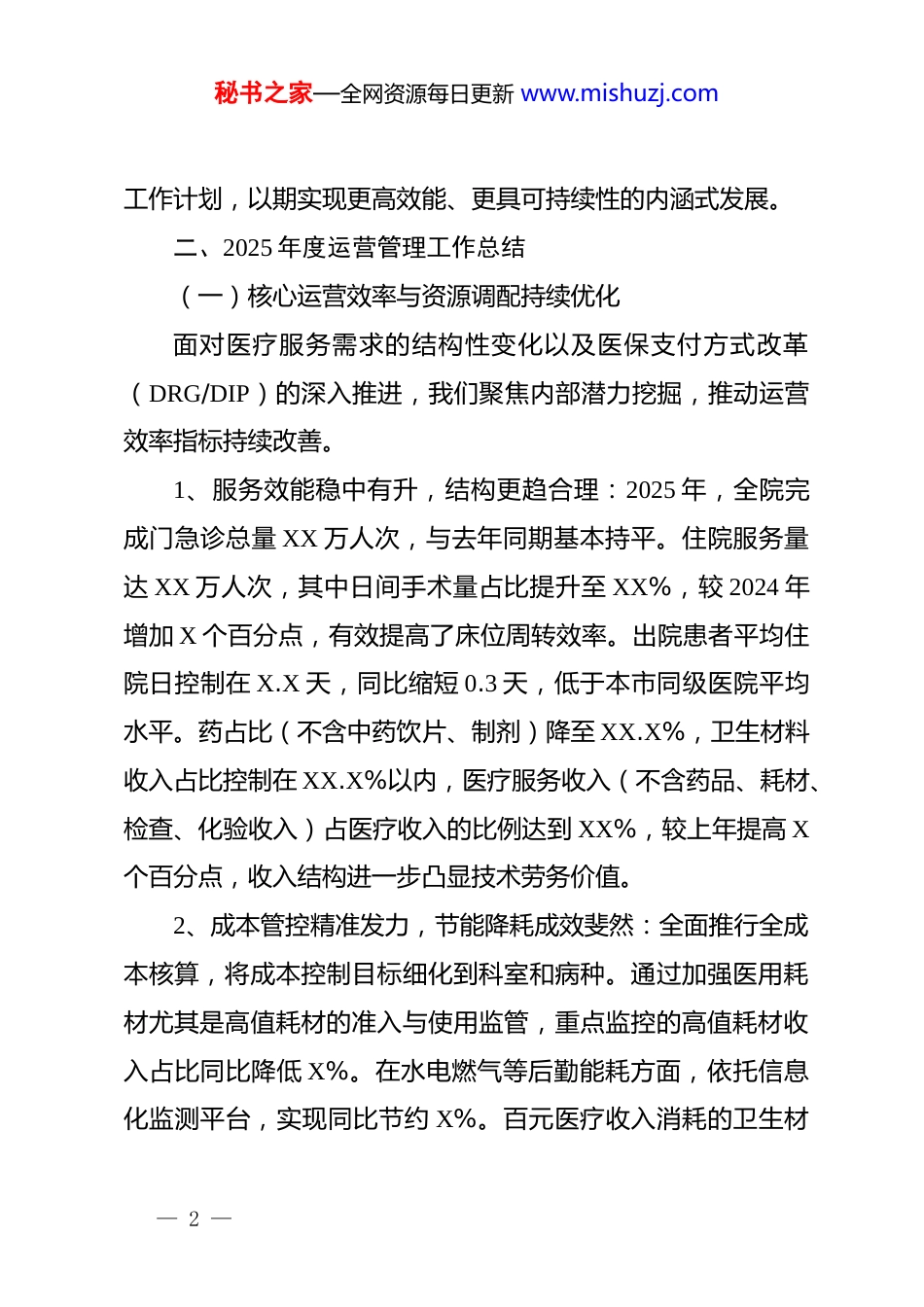 秘书之家—全网资源每日更新 www.mishuzj.comXX 医院 2025 年运营管理工作总结与 2026 年工作计划报告 一、前言:立足新阶段,贯彻新理念,构建新格局2025 年是“十四五”规划的收官之年,也是我院深入推进公立医院高质量发展的关键一年。一年来,医院运营管理科在院党委和领导班子的坚强引领下,以《国务院办公厅关于推动公立医院高质量发展的意见》为根本准则,紧密围绕《国家二级公立医院绩效监测操作手册(2025 版)》这一最新指引,以《公立医院运营管理信息化功能指引》为技术蓝图,全面落实国家及本市关于深化医改、加强运营管理的一系列决策部署。我们深刻领会公立医院发展方式从“规模扩张”向“提质增效”转变的核心内涵,将运营管理深度融入医疗服务各个环节,以数据驱动决策,凭借精细化管理促进效能提升。在复杂严峻的形势下,基本达成了医疗资源有效利用、收支结构持续优化、发展动能稳步转换的年度目标,为“十五五”时期的高质量发展筑牢了坚实基础。本报告旨在系统回顾 2025 年医院运营管理的成效,剖析存在的问题,并依据国家政策导向和医院战略规划,制定 2026 年— 1 —秘书之家—全网资源每日更新 www.mishuzj.com工作计划,以期实现更高效能、更具可持续性的内涵式发展。二、2025 年度运营管理工作总结(一)核心运营效率与资源调配持续优化面对医疗服务需求的结构性变化以及医保支付方式改革(DRG/DIP)的深入推进,我们聚焦内部潜力挖掘,推动运营效率指标持续改善。1、服务效能稳中有升,结构更趋合理:2025 年,全院完成门急诊总量 XX 万人次,与去年同期基本持平。住院服务量达 XX 万人次,其中日间手术量占比提升至 XX%,较 2024 年增加 X 个百分点,有效提高了床位周转效率。出院患者平均住院日控制在 X.X 天,同比缩短 0.3 天,低于本市同级医院平均水平。药占比(不含中药饮片、制剂)降至 XX.X%,卫生材料收入占比控制在 XX.X%以内,医疗服务收入(不含药品、耗材、检查、化验收入)占医疗收入的比例达到 XX%,较上年提高 X个百分点,收入结构进一步凸显技术劳务价值。2、成本管控精准发力,节能降耗成效斐然:全面推行全成本核算,将成本控制目标细化到科室和病种。通过加强医用耗材尤其是高值耗材的准入与使用监管,重点监控的高值耗材收入占比同比降低 X%。在水电燃气等后勤能耗方面,依托信息化监测平台,实现同比节约 X%。百元医疗收入消耗的卫生材— 2 —秘书之家—全网资源每日更新 www.mishuzj.com料费用降至 XX 元,达成年度预算控制目标。3、资产运营效率提升,资源配置更为科学合理:大型医疗设备(单价在 50 万元以上)平均开机使用率提升至 XX%,设备维修保养成本同比降低 X%。通过搭建资产共享调配平台,盘活闲置及利用率较低的设备资产 XX 台(套),价值约 XXX万元。(二)医疗质量与安全基石得以全面夯实我们坚持将运营管理与医疗质量安全深度融合,以管理推动规范,以规范保障安全。1、全面质控体系有效运转:健全院科两级医疗质量管理体系,对照《2025 年上海市医政工作要点》要求,将 XX 个主要临床专业和重点技术纳入统一质控网络。全年开展数字化质控督查 XX 次,发现并整改问题 XXX 项。低风险组病例死亡率为0,中低风险组死亡率维持在本市较低水平,这表明基础医疗质量稳定可靠。我们尤其强化了病案首页质量管理,因其数据质量直接关乎 DRG 分组和绩效监测的准确性。2、规范诊疗与合理用药协同推进:国家组织药品集中采购(国采)中选药品的采购金额占比达 XX%,超额完成既定目标。国家基本药物配备使用金额占比稳定在 XX%以上。严格落实重点监控合理用药药品目录(第一批)管理,其收入占比严格控— 3 —秘书之家—全网资源每日更新 www.mishuzj.com制在较低水平。同时,我们积极响应国家绩效监测新导向,在内部考核中,对“医疗收入增幅”等指标的监测,已主动剔除“纳入创新药应用指导目录中药品收入”的影响,以更真实地反映医院常规运营能力和成本控制水平,并引导临床在创新药使用上更注重规范性与合理性。3、检查检验结果互认稳步推进:作为区域...