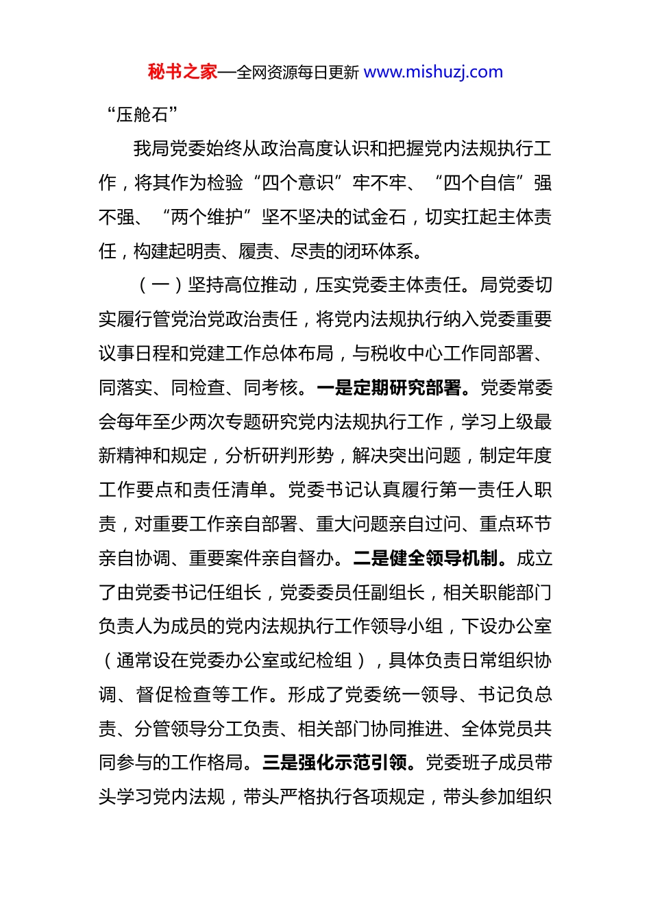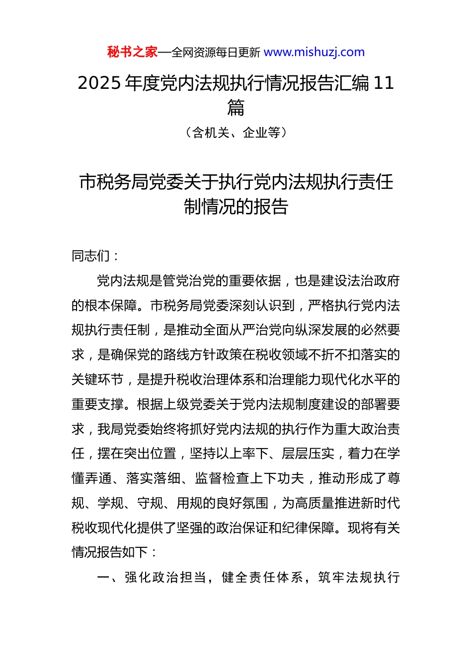 秘书之家—全网资源每日更新 www.mishuzj.com2025 年度党内法规执行情况报告汇编 11篇(含机关、企业等)市税务局党委关于执行党内法规执行责任制情况的报告同志们:党内法规是管党治党的重要依据,也是建设法治政府的根本保障。市税务局党委深刻认识到,严格执行党内法规执行责任制,是推动全面从严治党向纵深发展的必然要求,是确保党的路线方针政策在税收领域不折不扣落实的关键环节,是提升税收治理体系和治理能力现代化水平的重要支撑。根据上级党委关于党内法规制度建设的部署要求,我局党委始终将抓好党内法规的执行作为重大政治责任,摆在突出位置,坚持以上率下、层层压实,着力在学懂弄通、落实落细、监督检查上下功夫,推动形成了尊规、学规、守规、用规的良好氛围,为高质量推进新时代税收现代化提供了坚强的政治保证和纪律保障。现将有关情况报告如下:一、强化政治担当,健全责任体系,筑牢法规执行秘书之家—全网资源每日更新 www.mishuzj.com“压舱石”我局党委始终从政治高度认识和把握党内法规执行工作,将其作为检验“四个意识”牢不牢、“四个自信”强不强、“两个维护”坚不坚决的试金石,切实扛起主体责任,构建起明责、履责、尽责的闭环体系。(一)坚持高位推动,压实党委主体责任。局党委切实履行管党治党政治责任,将党内法规执行纳入党委重要议事日程和党建工作总体布局,与税收中心工作同部署、同落实、同检查、同考核。一是定期研究部署。党委常委会每年至少两次专题研究党内法规执行工作,学习上级最新精神和规定,分析研判形势,解决突出问题,制定年度工作要点和责任清单。党委书记认真履行第一责任人职责,对重要工作亲自部署、重大问题亲自过问、重点环节亲自协调、重要案件亲自督办。二是健全领导机制。成立了由党委书记任组长,党委委员任副组长,相关职能部门负责人为成员的党内法规执行工作领导小组,下设办公室(通常设在党委办公室或纪检组),具体负责日常组织协调、督促检查等工作。形成了党委统一领导、书记负总责、分管领导分工负责、相关部门协同推进、全体党员共同参与的工作格局。三是强化示范引领。党委班子成员带头学习党内法规,带头严格执行各项规定,带头参加组织秘书之家—全网资源每日更新 www.mishuzj.com生活,带头报告个人有关事项,带头接受监督,以“关键少数”的示范作用,带动“绝大多数”遵规守纪。在党委会议、理论学习中心组学习会上,经常强调党内法规的重要性,提出明确执行要求。(二)细化责任分工,拧紧层层落实链条。为确保责任落细落地,我局着力构建清晰具体、环环相扣的责任体系。一是制定责任清单。依据上级要求和相关党内法规,结合我局实际,制定了《市税务局党委及其成员落实党内法规执行责任制清单》,明确了党委、党委书记、党委委员、机关党委(党总支)、党支部及各职能部门在法规执行中的具体职责和任务,实现了责任具体化、项目化。二是推行“一岗双责”。局党委要求各级领导干部既要抓好业务工作,也要抓好分管领域和所在支部的党内法规执行工作,把抓法规执行情况作为领导干部年度述职述廉的重要内容,作为评价其政治素质和履职能力的重要标准。三是压力传导到位。通过签订党风廉政建设责任书、党建工作目标责任书等形式,将党内法规执行的责任和要求逐级传导至各分局、各处室、各党支部,直至每一位党员,确保责任无缝对接、压力直达末梢。(三)完善制度配套,夯实长效管理基础。我局注重将实践中行之有效的做法固化为制度成果,形成靠制度管秘书之家—全网资源每日更新 www.mishuzj.com人、按规章办事的长效机制。一是健全学习培训制度。制定了《市税务局党员干部党内法规学习培训制度》,明确了学习内容、时间、方式和要求,将党内法规纳入干部教育培训总体规划,作为新入职党员、新提拔干部的必修课。二是完善监督检查制度。建立了《党内法规执行情况定期检查通报制度》,明确了检查内容、方式、频次和结果运用。结合巡察、审计、专项督查等,将党内法规执行情况作为必查内容。三是优化考核评价制度。修订了《市税务局党建工作考核评价办法》,显著提高了党内法规执行情况在党建...