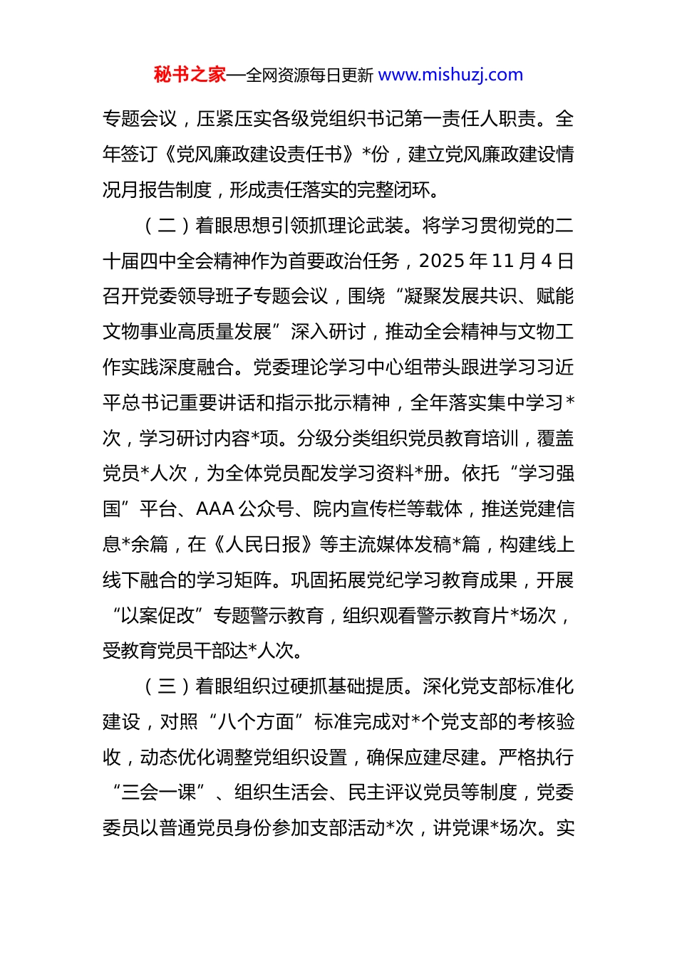 秘书之家—全网资源每日更新 www.mishuzj.com2025 年度党委书记抓基层党建工作述职报告 根据要求,现将本人 2025 年抓基层党建工作情况报告如下。一、履职情况2025 年,*博物院党委坚持以习近平新时代中国特色社会主义思想为指导,深入学习贯彻党的二十届三中全会、四中全会精神,全面落实新时代党的建设总要求,以深入贯彻中央八项规定精神学习教育为主线,聚焦“世界一流博物馆”建设目标,推动党建工作与文物保护利用深度融合。全年召开党委会议*次,研究“三重一大”事项*项,党委理论学习中心组集中学习*次,开展专题研讨*项,为博物院高质量发展提供了坚强政治保证。(一)着眼责任闭环抓体系夯实。年初制定《2025 年党建工作要点》,明确政治建设、思想建设、组织建设、作风建设、纪律建设等*项重点任务,逐项分解到责任部门和完成时限。建立“月调度、季督查、年考核”工作机制,班子成员分片包干开展“一拖三”专项督查*次,对所属*个党支部进行全覆盖调研指导。组织召开抓党建工作述职评议会、中央八项规定精神学习教育动员会、庆祝建党104 周年暨党的建设工作会议、专题警示教育推进会等*次秘书之家—全网资源每日更新 www.mishuzj.com专题会议,压紧压实各级党组织书记第一责任人职责。全年签订《党风廉政建设责任书》*份,建立党风廉政建设情况月报告制度,形成责任落实的完整闭环。(二)着眼思想引领抓理论武装。将学习贯彻党的二十届四中全会精神作为首要政治任务,2025 年 11 月 4 日召开党委领导班子专题会议,围绕“凝聚发展共识、赋能文物事业高质量发展”深入研讨,推动全会精神与文物工作实践深度融合。党委理论学习中心组带头跟进学习习近平总书记重要讲话和指示批示精神,全年落实集中学习*次,学习研讨内容*项。分级分类组织党员教育培训,覆盖党员*人次,为全体党员配发学习资料*册。依托“学习强国”平台、AAA 公众号、院内宣传栏等载体,推送党建信息*余篇,在《人民日报》等主流媒体发稿*篇,构建线上线下融合的学习矩阵。巩固拓展党纪学习教育成果,开展“以案促改”专题警示教育,组织观看警示教育片*场次,受教育党员干部达*人次。(三)着眼组织过硬抓基础提质。深化党支部标准化建设,对照“八个方面”标准完成对*个党支部的考核验收,动态优化调整党组织设置,确保应建尽建。严格执行“三会一课”、组织生活会、民主评议党员等制度,党委委员以普通党员身份参加支部活动*次,讲党课*场次。实秘书之家—全网资源每日更新 www.mishuzj.com施“支部提升”行动,组织《中国共产党支部工作条例》专题培训,对党支部书记和党务干部进行全员轮训,培训*余人。创新党建活动载体,开展“追寻红色足迹,传承革命精神”主题党日,组织党员赴延安等红色教育基地开展革命传统教育。设立“党员先锋队”*支、“党员示范岗”*个,在二号坑保护展示大厅改造、陶制文物库房基础设施改造等重点项目中发挥攻坚作用。(四)着眼融合发展抓服务中心。坚持党建引领业务,将党的领导贯穿博物院工作全过程。2025 年预算明确推进馆陵路连接项目、供电工程、景观提升工程等*项重点基建项目,总投资*亿元,目前已完成*项。深化“党建+业务”融合,创建“文博先锋”党建品牌,围绕文物保护、陈列展览、社会教育、安全保障等核心业务,设立*个党员责任区。全年接待观众突破*万人次,同比增长*%;完成考古发掘面积*平方米,新出土文物*件(组);举办专题展览*个,开发文创产品*款,实现营业收入*亿元。在服务群众方面,开展“博物馆进校园”活动*场次,覆盖学生*万人次;线上教育视频播放量达*万次,公众满意度达 95%以上。(五)着眼正风肃纪抓作风转变。深入贯彻中央八项规定精神学习教育,开展为期*个月的专项整治,围绕办公秘书之家—全网资源每日更新 www.mishuzj.com用房、公务用车、公务接待等*个方面进行自查自纠,发现问题*项,已全部整改到位。紧盯重要节点开展监督检查,组织作风排查*次,查处形式主义、官僚主义问题*起。邀请省纪委监委专家解读《中国共产党纪律处分条例》,开展巡视整改“回头看”,抓好“十个专项治理”。强化日常监督,运...