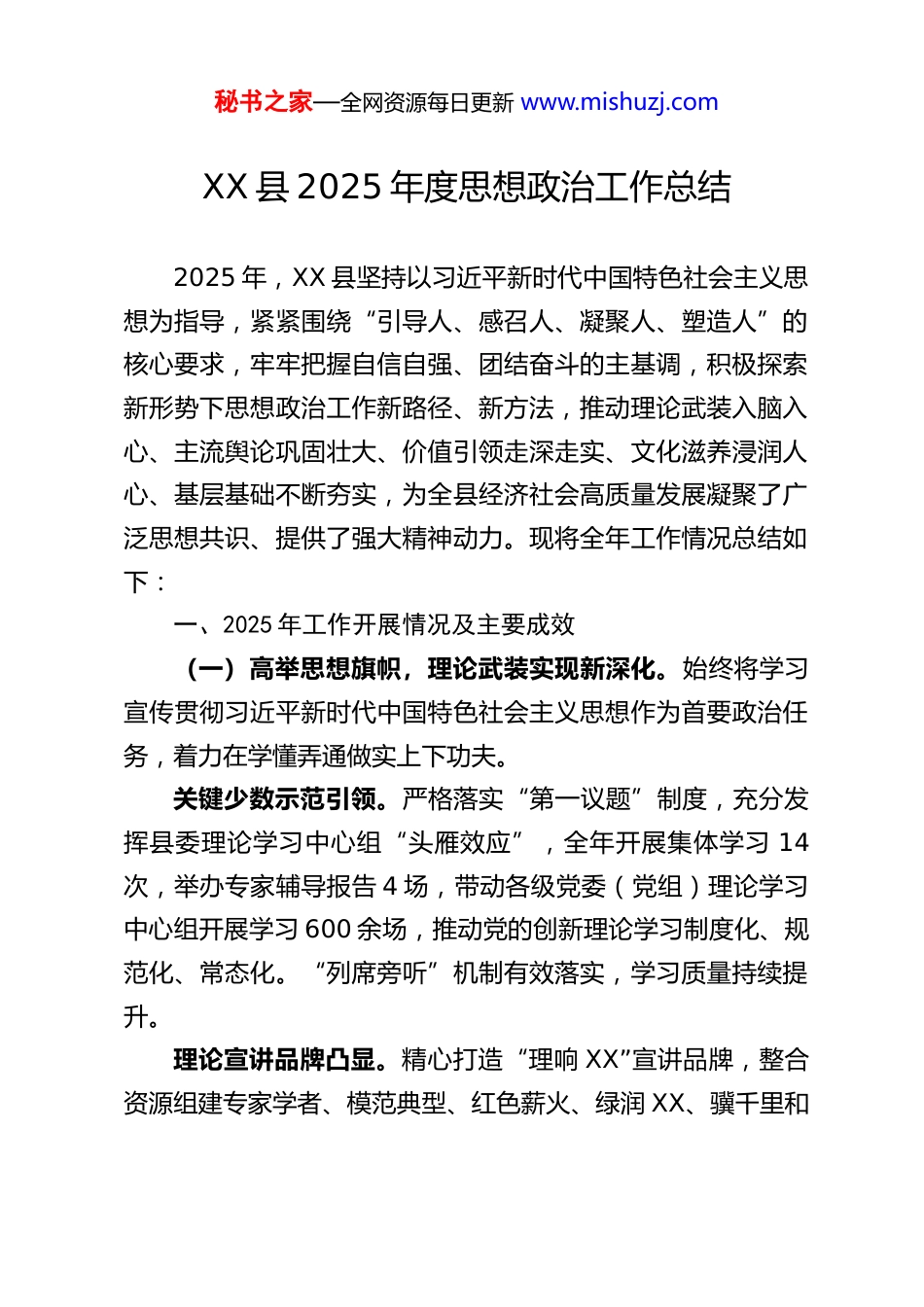 秘书之家—全网资源每日更新 www.mishuzj.comXX 县 2025 年度思想政治工作总结2025 年,XX 县坚持以习近平新时代中国特色社会主义思想为指导,紧紧围绕“引导人、感召人、凝聚人、塑造人”的核心要求,牢牢把握自信自强、团结奋斗的主基调,积极探索新形势下思想政治工作新路径、新方法,推动理论武装入脑入心、主流舆论巩固壮大、价值引领走深走实、文化滋养浸润人心、基层基础不断夯实,为全县经济社会高质量发展凝聚了广泛思想共识、提供了强大精神动力。现将全年工作情况总结如下:一、2025 年工作开展情况及主要成效(一)高举思想旗帜,理论武装实现新深化。始终将学习宣传贯彻习近平新时代中国特色社会主义思想作为首要政治任务,着力在学懂弄通做实上下功夫。关键少数示范引领。严格落实“第一议题”制度,充分发挥县委理论学习中心组“头雁效应”,全年开展集体学习 14次,举办专家辅导报告 4 场,带动各级党委(党组)理论学习中心组开展学习 600 余场,推动党的创新理论学习制度化、规范化、常态化。“列席旁听”机制有效落实,学习质量持续提升。理论宣讲品牌凸显。精心打造“理响 XX”宣讲品牌,整合资源组建专家学者、模范典型、红色薪火、绿润 XX、骥千里和秘书之家—全网资源每日更新 www.mishuzj.com红领巾六支骨干宣讲队伍,构建起覆盖广泛、专兼结合、富有特色的宣讲工作格局。创新采用“线上+线下”“集中+常态”“定制+点单”等多元模式,举办理论宣讲骨干培训班 2期,开展各类宣讲活动 117 场次,推动党的创新理论“飞入寻常百姓家”。研究阐释走实走深。注重学研结合,积极申报省市级社科项目 9 项,依托社科普及周等活动载体,加强对党的创新理论在县域实践中的研究与阐释,促进理论学习成果向实践能力转化,有效夯实了全县上下团结奋斗的共同思想基础。(二)聚焦凝心聚力,主流舆论呈现新气象。坚持围绕中心、服务大局,将思想政治工作有机融入各项宣传之中,不断巩固壮大积极健康向上的主流思想舆论。主题宣传声势强劲。围绕“学习贯彻党的二十届四中全会精神”“2025·向新而行”等重大主题,精心策划系列宣传活动,深入解读“十五五”时期国家大政方针,持续唱响经济回升向好、社会信心提振的主旋律。成就宣传鼓舞人心。开设“‘十四五’XX 答卷”专题专栏,综合运用图文稿件、长图海报、短视频等形式,推出系列产品43 件,全景式、多维度展示我县“十四五”期间经济社会发展取得的显著成就,增强了全县人民的自豪感和获得感。对外宣传亮点纷呈。主动对接上级媒体,邀请 141 名记者来县采访,在中央及省市主流媒体刊播稿件 1059 篇。策划推秘书之家—全网资源每日更新 www.mishuzj.com出“XX 之高”专题,发布稿件 30 余篇,系统宣传推介我县在人文历史、特色产业、发展成效等方面的独特优势,县域美誉度和影响力显著提升。典型宣传感召有力。《凡人微光》《劳动创造幸福》等专栏持续挖掘宣传基层先进典型,如“‘塘长’许茂俊 27 年独守雪山”等感人故事,用身边事教育身边人,激发见贤思齐、砥砺奋进的精神力量。全国“我们的节日·端午”主题文化活动及我县公安侦破大案要案成效得到人民日报、新华社、央视《今日说法》等权威媒体重点报道,正面形象充分彰显。(三)突出铸魂育人,价值引领取得新成效。坚持以社会主义核心价值观为引领,深化思想道德建设和文明实践,不断提升社会文明程度。红色教育浸润人心。充分利用本地丰富红色资源,常态化开展“传承红色基因凝聚奋进力量”等党性教育和爱国主义实践活动,让红色基因代代相传。依托“三会一课”、文艺展演等,组织开展“强国复兴有我”等群众性主题宣教活动 150 余场,参与度高、覆盖面广。法治德治协同推进。顺利完成“八五”普法规划总结评估,创新推广应用矛盾纠纷“四级七天”调解法,开展送法进基层活动 400 余场,法治观念深入人心。深化“德润 XX”教育实践,选树宣传各级各类先进模范 20 余人,其中 1 人获省级“感动甘肃·陇人骄子”提名奖,2 人入选“新时代甘肃好少年”,榜秘书之家—全网资源每日更新 www.mishuzj.com样示范引领作...