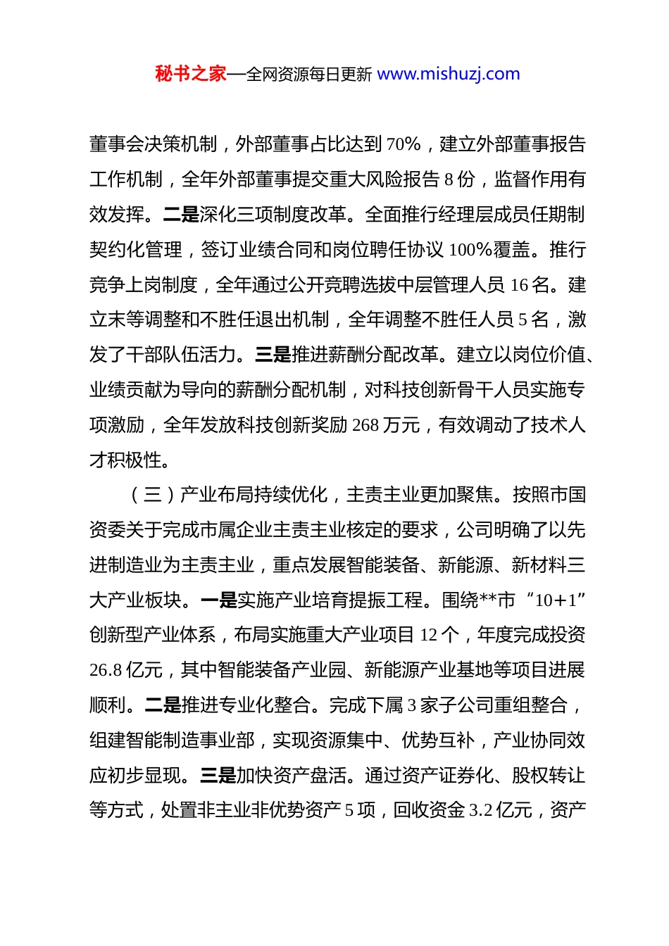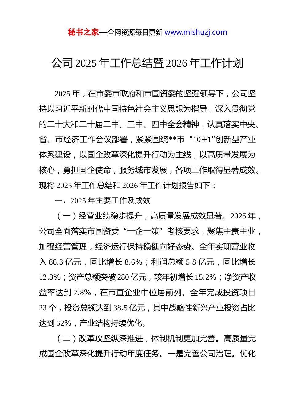 秘书之家—全网资源每日更新 www.mishuzj.com公司 2025 年工作总结暨 2026 年工作计划 2025 年,在市委市政府和市国资委的坚强领导下,公司坚持以习近平新时代中国特色社会主义思想为指导,深入贯彻党的二十大和二十届二中、三中、四中全会精神,认真落实中央、省、市经济工作会议部署,紧紧围绕**市“10+1”创新型产业体系建设,以国企改革深化提升行动为主线,以高质量发展为核心,勇担国企使命,服务城市发展,各项工作取得显著成效。现将 2025 年工作总结和 2026 年工作计划报告如下:一、2025 年主要工作及成效(一)经营业绩稳步提升,高质量发展成效显著。2025 年,公司全面落实市国资委“一企一策”考核要求,聚焦主责主业,加强经营管理,经济运行保持稳健向好态势。全年实现营业收入 86.3 亿元,同比增长 8.6%;利润总额 5.8 亿元,同比增长12.3%;资产总额突破 280 亿元,较年初增长 15.2%;净资产收益率达到 7.8%,在市直企业中位居前列。全年完成投资项目23 个,投资总额达到 38.5 亿元,其中战略性新兴产业投资占比达到 62%,产业结构持续优化。(二)改革攻坚纵深推进,体制机制更加完善。高质量完成国企改革深化提升行动年度任务。一是完善公司治理。优化秘书之家—全网资源每日更新 www.mishuzj.com董事会决策机制,外部董事占比达到 70%,建立外部董事报告工作机制,全年外部董事提交重大风险报告 8 份,监督作用有效发挥。二是深化三项制度改革。全面推行经理层成员任期制契约化管理,签订业绩合同和岗位聘任协议 100%覆盖。推行竞争上岗制度,全年通过公开竞聘选拔中层管理人员 16 名。建立末等调整和不胜任退出机制,全年调整不胜任人员 5 名,激发了干部队伍活力。三是推进薪酬分配改革。建立以岗位价值、业绩贡献为导向的薪酬分配机制,对科技创新骨干人员实施专项激励,全年发放科技创新奖励 268 万元,有效调动了技术人才积极性。(三)产业布局持续优化,主责主业更加聚焦。按照市国资委关于完成市属企业主责主业核定的要求,公司明确了以先进制造业为主责主业,重点发展智能装备、新能源、新材料三大产业板块。一是实施产业培育提振工程。围绕**市“10+1”创新型产业体系,布局实施重大产业项目 12 个,年度完成投资26.8 亿元,其中智能装备产业园、新能源产业基地等项目进展顺利。二是推进专业化整合。完成下属 3 家子公司重组整合,组建智能制造事业部,实现资源集中、优势互补,产业协同效应初步显现。三是加快资产盘活。通过资产证券化、股权转让等方式,处置非主业非优势资产 5 项,回收资金 3.2 亿元,资产秘书之家—全网资源每日更新 www.mishuzj.com质量和运营效率明显提升。(四)科技创新成果丰硕,新质生产力加快培育。深入实施创新驱动发展战略,建立研发投入刚性增长机制,全年研发投入 4.6 亿元,同比增长 18.5%,研发投入强度达到 5.3%。一是强化平台建设。新获批市级技术创新中心 2 个、市级重点实验室 1 个,公司研发机构总数达到 8 个。与中国科学院**能源所、**理工大学等单位建立战略合作关系,推动拟转化成果在公司“首发首试”。二是加快成果转化。全年获得授权专利 86件,其中发明专利 32 件。完成科技成果转化项目 15 个,实现产值 8.6 亿元。智能焊接机器人、高性能锂电池隔膜等技术成果实现产业化应用。三是推进数字化转型。实施数字化改造项目 18 个,建成智能化生产线 3 条,生产效率提升 25%,能耗降低 18%。工业互联网平台接入设备 1200 台套,数据驱动的生产管理模式初步形成。(五)央地合作深入推进,招商引资成效显著。积极响应市国资委央地合作部署,主动对接央企国企优势资源。一是拓展合作渠道。与中国中车、中船重工、中国电子等央企开展深度合作,签订战略合作协议 5 份,在智能装备、海洋工程、新材料等领域实施合作项目 8 个。二是强化招商引资。组建专业招商团队,参加“企地共建·走进**”等活动 12 次,全年签约引秘书之家—全网资源每日更新 www.mishuzj.com进项目 16 个,协议投资额 42 亿元。引进高新技术企业落...