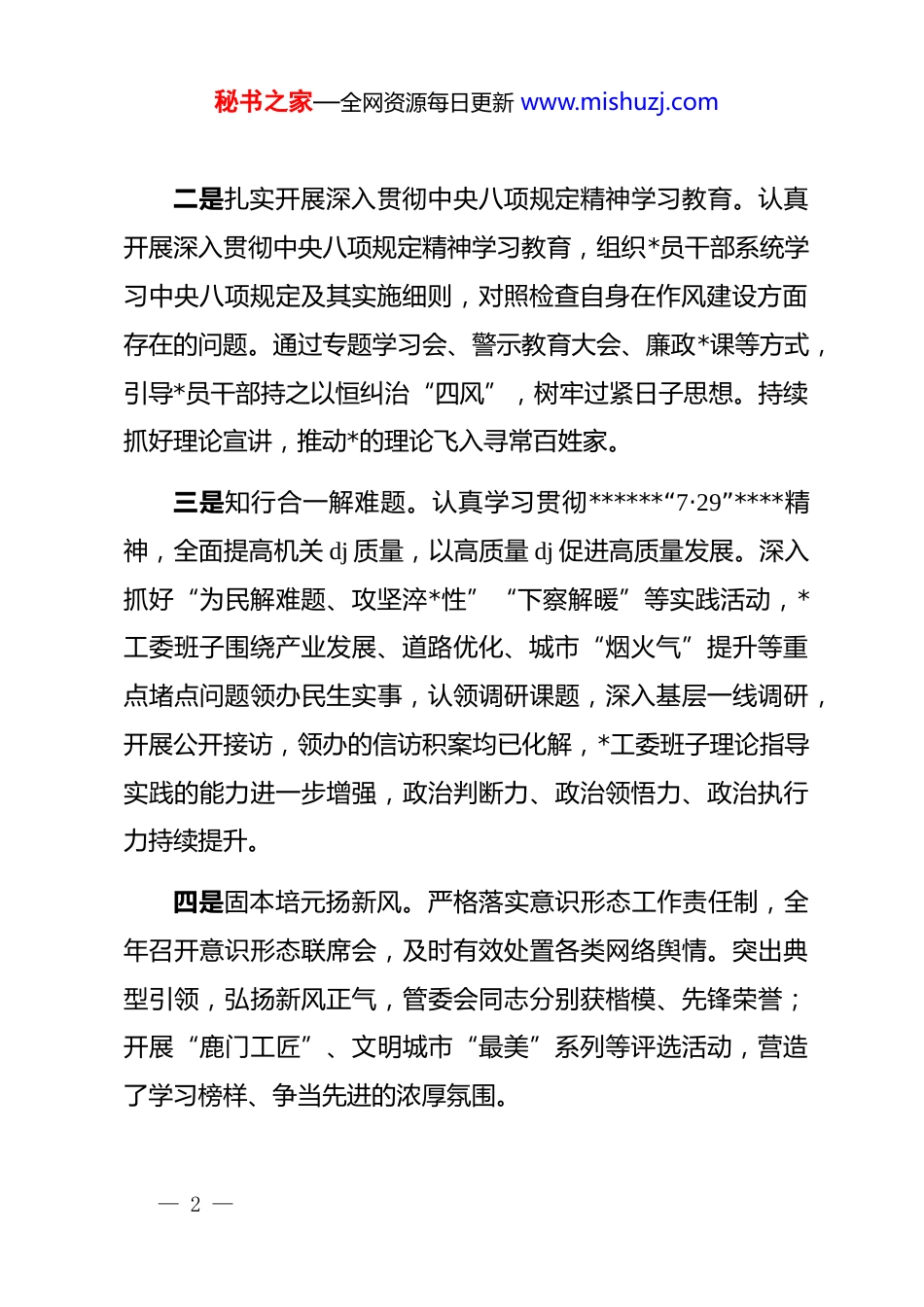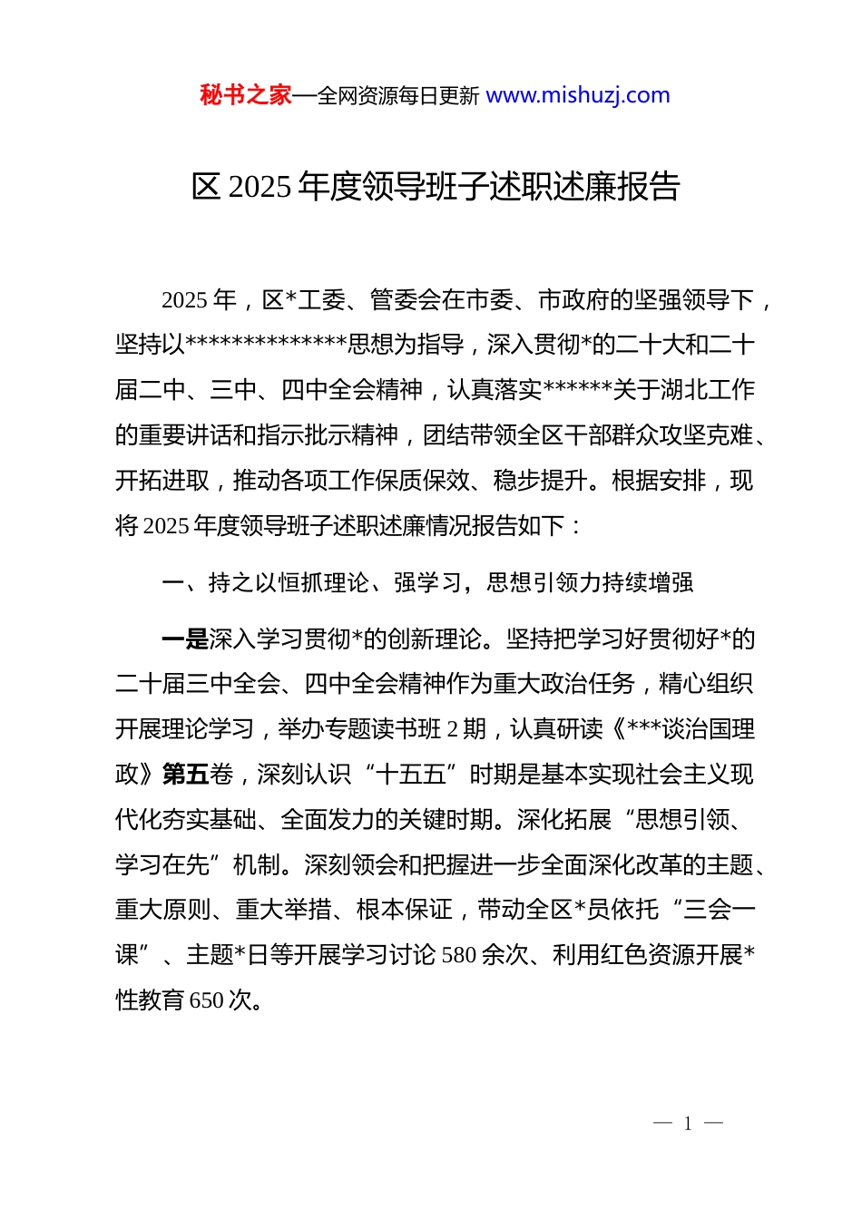 秘书之家—全网资源每日更新 www.mishuzj.com区 2025 年度领导班子述职述廉报告2025 年,区*工委、管委会在市委、市政府的坚强领导下,坚持以**************思想为指导,深入贯彻*的二十大和二十届二中、三中、四中全会精神,认真落实******关于湖北工作的重要讲话和指示批示精神,团结带领全区干部群众攻坚克难、开拓进取,推动各项工作保质保效、稳步提升。根据安排,现将 2025 年度领导班子述职述廉情况报告如下:一、持之以恒抓理论、强学习,思想引领力持续增强一是深入学习贯彻*的创新理论。坚持把学习好贯彻好*的二十届三中全会、四中全会精神作为重大政治任务,精心组织开展理论学习,举办专题读书班 2 期,认真研读《***谈治国理政》第五卷,深刻认识“十五五”时期是基本实现社会主义现代化夯实基础、全面发力的关键时期。深化拓展“思想引领、学习在先”机制。深刻领会和把握进一步全面深化改革的主题、重大原则、重大举措、根本保证,带动全区*员依托“三会一课”、主题*日等开展学习讨论 580 余次、利用红色资源开展*性教育 650 次。— 1 —秘书之家—全网资源每日更新 www.mishuzj.com二是扎实开展深入贯彻中央八项规定精神学习教育。认真开展深入贯彻中央八项规定精神学习教育,组织*员干部系统学习中央八项规定及其实施细则,对照检查自身在作风建设方面存在的问题。通过专题学习会、警示教育大会、廉政*课等方式,引导*员干部持之以恒纠治“四风”,树牢过紧日子思想。持续抓好理论宣讲,推动*的理论飞入寻常百姓家。三是知行合一解难题。认真学习贯彻******“7·29”****精神,全面提高机关 dj 质量,以高质量 dj 促进高质量发展。深入抓好“为民解难题、攻坚淬*性”“下察解暖”等实践活动,*工委班子围绕产业发展、道路优化、城市“烟火气”提升等重点堵点问题领办民生实事,认领调研课题,深入基层一线调研,开展公开接访,领办的信访积案均已化解,*工委班子理论指导实践的能力进一步增强,政治判断力、政治领悟力、政治执行力持续提升。四是固本培元扬新风。严格落实意识形态工作责任制,全年召开意识形态联席会,及时有效处置各类网络舆情。突出典型引领,弘扬新风正气,管委会同志分别获楷模、先锋荣誉;开展“鹿门工匠”、文明城市“最美”系列等评选活动,营造了学习榜样、争当先进的浓厚氛围。— 2 —秘书之家—全网资源每日更新 www.mishuzj.com二、顶压前行建新城、提形象,城市影响力持续提升一是科学规划发展蓝图,顶层设计突出“优”。省委、市委高度重视城市新中心建设,亲自规划发展蓝图、实施路径,确定了发展定位,划定了新城南北主轴和新城中心位置。高标准完成《城市新中心控制性详细规划方案》的优化完善工作。按照规划要求,严格实施、严密布局,切实站在全省、全市发展高度推进蓝图落地,坚决答好建设**城市新中心“主引擎”,引领**都市圈突破性发展的“必答题”。二是压茬推进重点项目,建设步伐突出“紧”。坚持以力度保速度,以速度保进度,以“一天也不耽搁”的紧迫感抓好各项工作,*工委班子领衔推动、区直各部门齐头并进,克服时间、要素等压力,推动项目落地。围绕“十四五”规划收官,聚焦发展新质生产力,城市新中心重点项目建设全面提速。三是千方百计攻克难点,要素保障突出“全”。集中力量抓好土地、政策、人力等关键要素保障,竭尽全力攻克难点、堵点。坚持土地程序走在建设前面,积极向上沟通协调,加快办理流程,为新城中心项目提供土地要素保障。积极汇报沟通,强化政策支持,进一步完善**新城建设相关配套政策。加强人才支撑,争取 50 名市直优秀干部到**挂职锻炼,充实到招商引— 3 —秘书之家—全网资源每日更新 www.mishuzj.com资、产业发展、项目建设一线,为城市新中心建设注入了强劲动能。三、一以贯之促发展、提水平,经济发展力持续释放一是经济发展稳中有进。紧紧围绕推进中国式现代化这个主题展开改革,全力克服经济下行压力。二是营商环境持续优化。坚持做优环境、做细服务,推动改革助力、数字赋能,政务服务水平明显提升,“高效办成一件事”考核多次被全市通报表扬,“一...