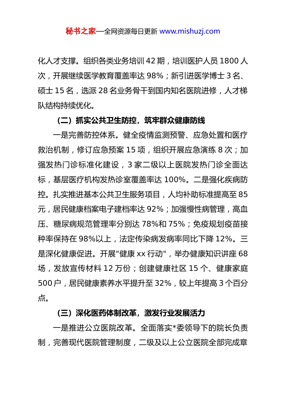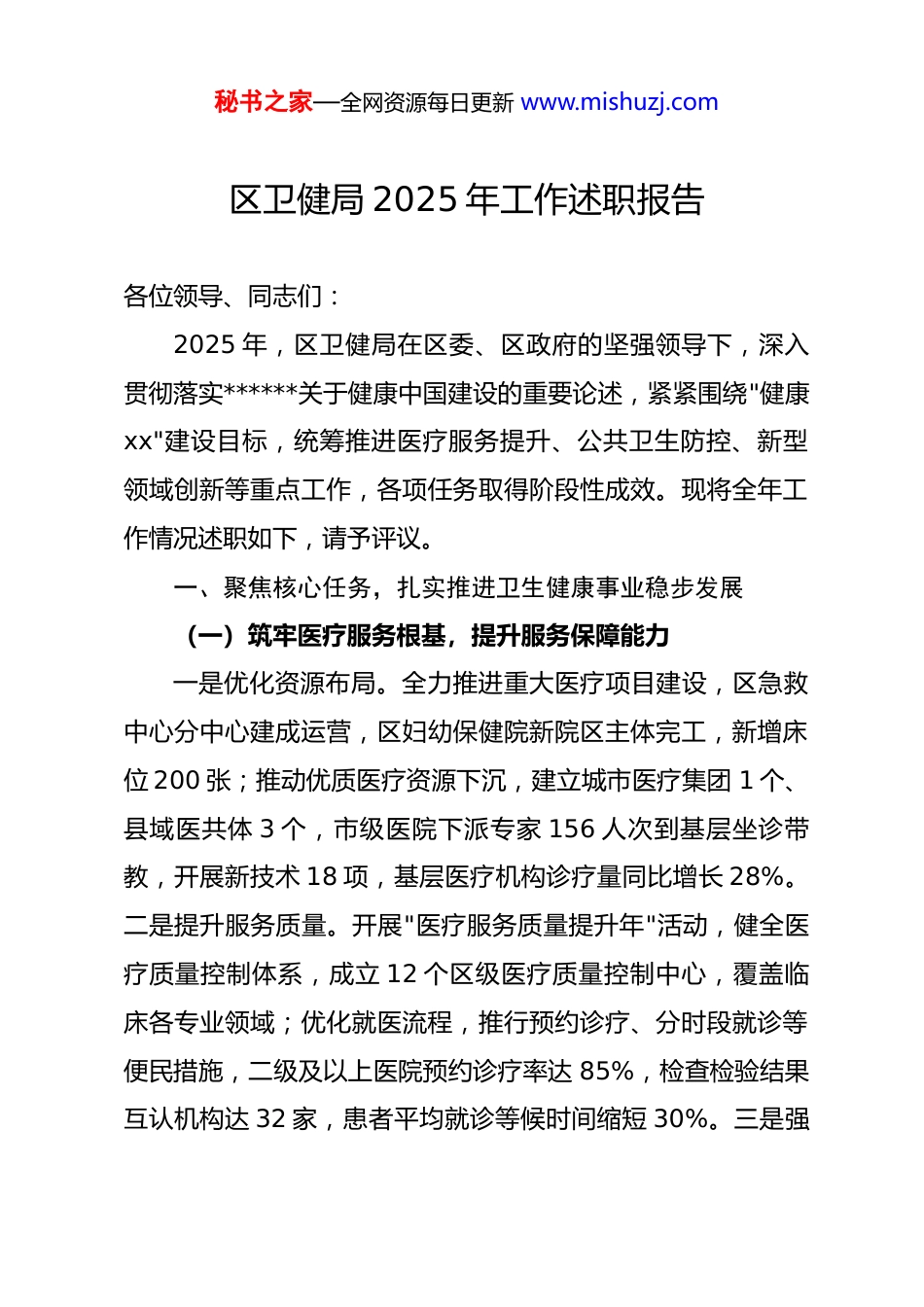 秘书之家—全网资源每日更新 www.mishuzj.com区卫健局 2025 年工作述职报告各位领导、同志们:2025 年,区卫健局在区委、区政府的坚强领导下,深入贯彻落实******关于健康中国建设的重要论述,紧紧围绕"健康xx"建设目标,统筹推进医疗服务提升、公共卫生防控、新型领域创新等重点工作,各项任务取得阶段性成效。现将全年工作情况述职如下,请予评议。一、聚焦核心任务,扎实推进卫生健康事业稳步发展(一)筑牢医疗服务根基,提升服务保障能力一是优化资源布局。全力推进重大医疗项目建设,区急救中心分中心建成运营,区妇幼保健院新院区主体完工,新增床位 200 张;推动优质医疗资源下沉,建立城市医疗集团 1 个、县域医共体 3 个,市级医院下派专家 156 人次到基层坐诊带教,开展新技术 18 项,基层医疗机构诊疗量同比增长 28%。二是提升服务质量。开展"医疗服务质量提升年"活动,健全医疗质量控制体系,成立 12 个区级医疗质量控制中心,覆盖临床各专业领域;优化就医流程,推行预约诊疗、分时段就诊等便民措施,二级及以上医院预约诊疗率达 85%,检查检验结果互认机构达 32 家,患者平均就诊等候时间缩短 30%。三是强秘书之家—全网资源每日更新 www.mishuzj.com化人才支撑。组织各类业务培训 42 期,培训医护人员 1800 人次,开展继续医学教育覆盖率达 98%;新引进医学博士 3 名、硕士 15 名,选派 28 名业务骨干到国内知名医院进修,人才梯队结构持续优化。(二)抓实公共卫生防控,筑牢群众健康防线一是完善防控体系。健全疫情监测预警、应急处置和医疗救治机制,修订应急预案 15 项,组织开展应急演练 8 次;加强发热门诊标准化建设,3 家二级以上医院发热门诊全面达标,基层医疗机构发热诊室覆盖率达 100%。二是强化疾病防控。扎实推进基本公共卫生服务项目,人均补助标准提高至 85元,居民健康档案电子建档率达 92%;加强慢性病管理,高血压、糖尿病规范管理率分别达 78%和 75%;免疫规划疫苗接种率保持在 98%以上,法定传染病发病率同比下降 12%。三是深化健康促进。开展"健康 xx 行动",举办健康知识讲座 68场,发放宣传材料 12 万份;创建健康社区 15 个、健康家庭500 户,居民健康素养水平提升至 32%,较上年提高 3 个百分点。(三)深化医药体制改革,激发行业发展活力一是推进公立医院改革。全面落实*委领导下的院长负责制,完善现代医院管理制度,二级及以上公立医院全部完成章秘书之家—全网资源每日更新 www.mishuzj.com程制定;加强医疗费用控制,实施按病种付费覆盖病种达 320个,公立医院次均住院费用同比下降 5%,切实减轻群众就医负担。二是健全分级诊疗体系。完善医保支付政策引导,建立"基层首诊、双向转诊、急慢分治、上下联动"机制,全年基层医疗机构上转患者 2100 人次,上级医院下转患者 1800 人次,县域就诊率达 90%。三是规范行业监管。开展医疗服务价格专项检查 12 次,查处违规收费案件 6 起,退还患者费用 8.6万元;加强医疗纠纷调解,调解成功率达 98%,构建和谐医患关系。二、突破新型领域,培育卫生健康发展新动能(一)智慧医疗加速落地,服务效率显著提升重点推进"互联网+医疗健康"发展,建成区级全民健康信息平台,实现与 32 家医疗机构互联互通,医疗数据共享率达90%;推广"云医院"平台应用,入驻医疗机构 28 家,注册医生 320 名,实名用户达 15 万人,全年完成线上诊疗服务 4.2万人次,电子处方流转 1.8 万例。创新开展智能医疗服务,3家医院上线 ai 辅助诊断系统,覆盖影像、病理等领域,诊断准确率达 95%;推行"一站式服务中心"全覆盖,提供咨询导诊、医保办理等综合服务,累计服务群众 8.6 万人次,减免费用120 万元。秘书之家—全网资源每日更新 www.mishuzj.com(二)医养结合深度融合,养老服务提质增效制定《区医养结合服务发展实施方案》,构建"医疗机构+养老机构+社区服务"三维体系。新建医养结合服务中心 3 个,新增医养结合床位 150 张,实现街道(乡镇)医养结合服务全覆盖;推动 2 家二级医院转型为老年病专科医院,开...
